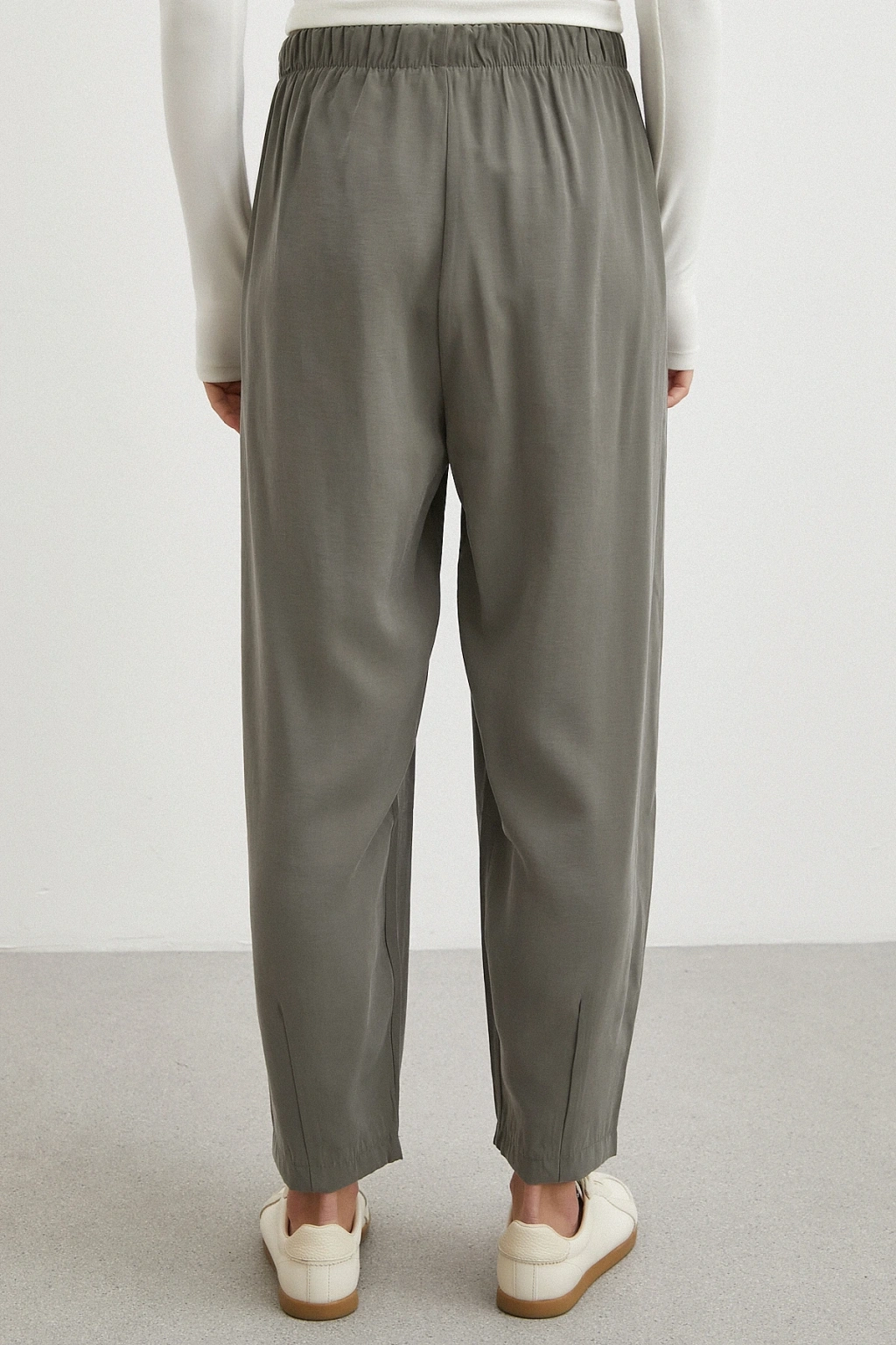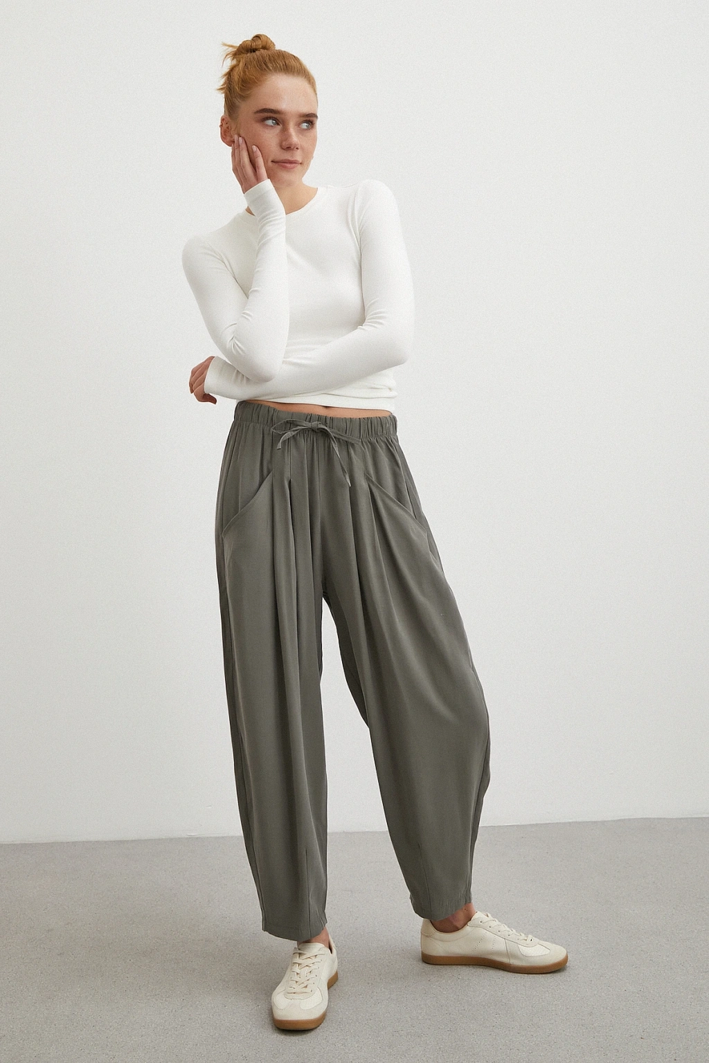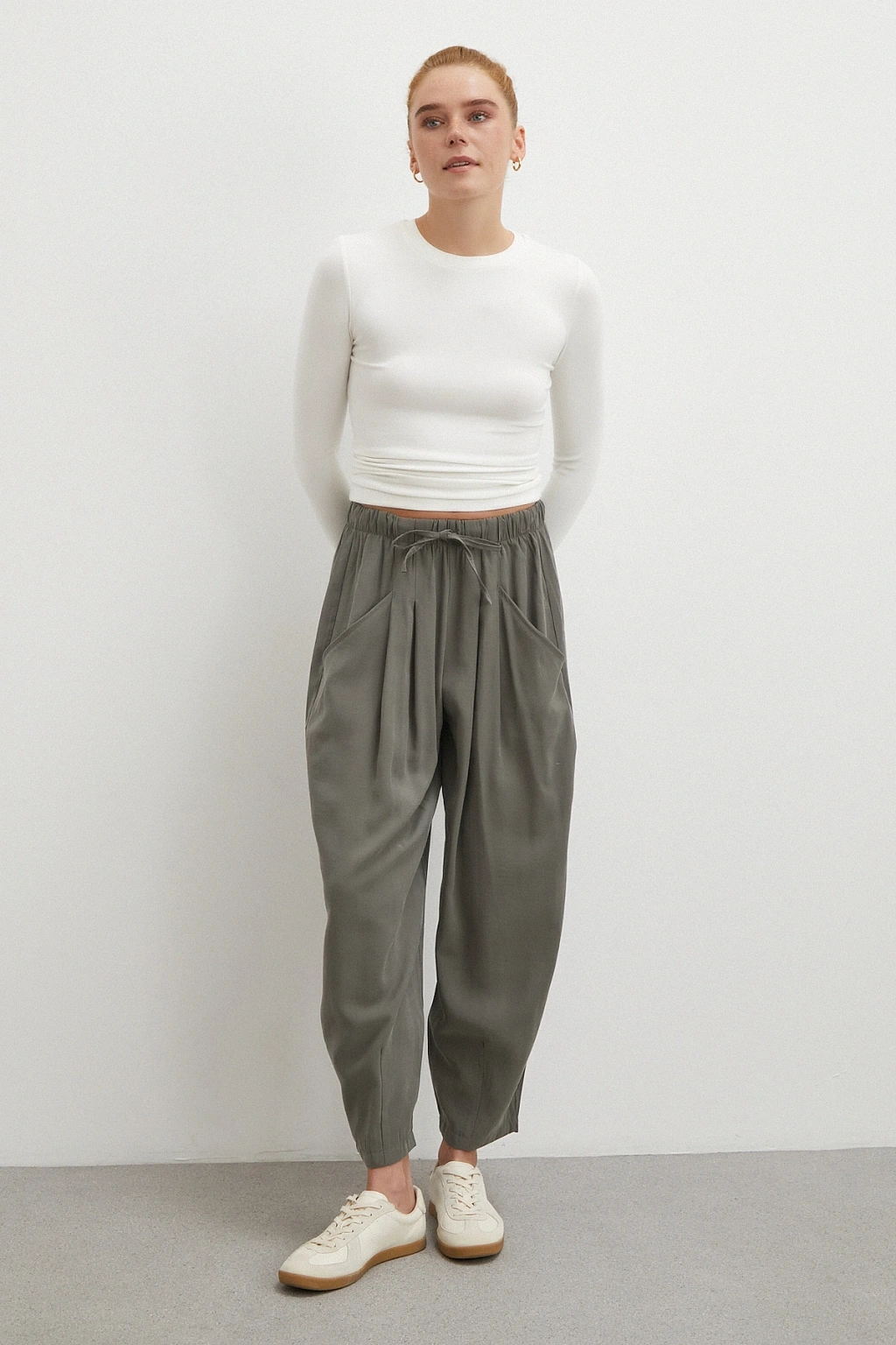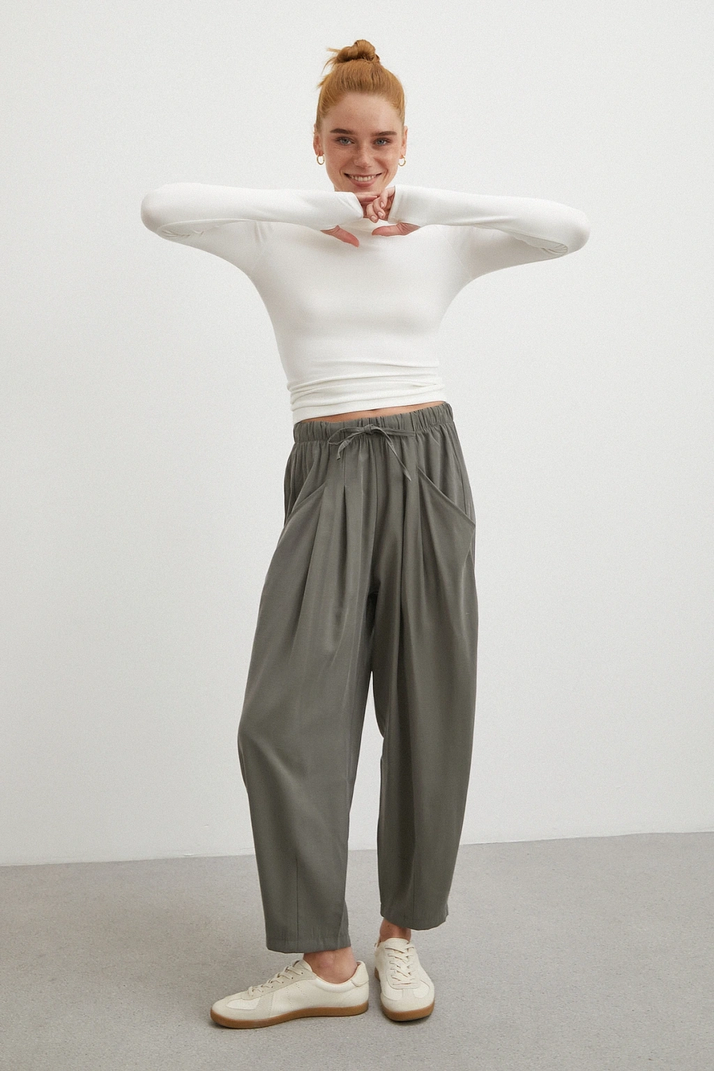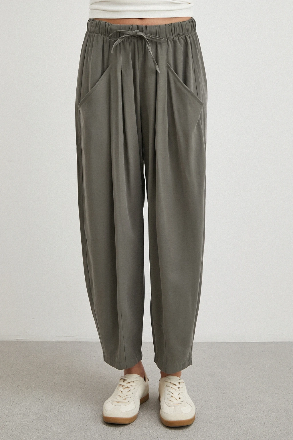 Bağcıklı Beli Lastikli Pileli Pantolon Haki