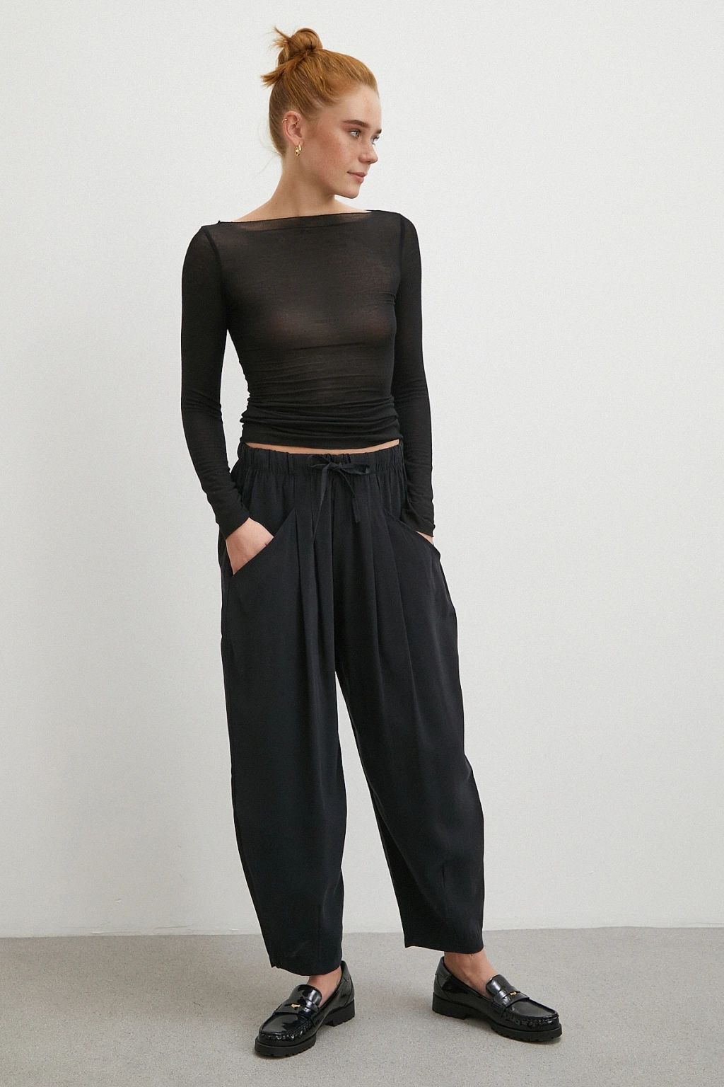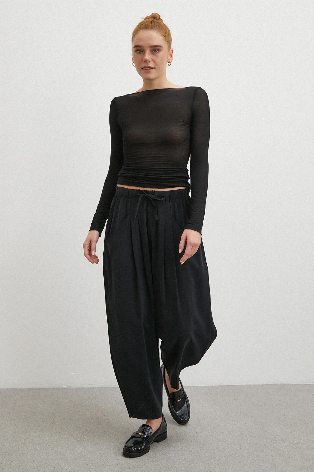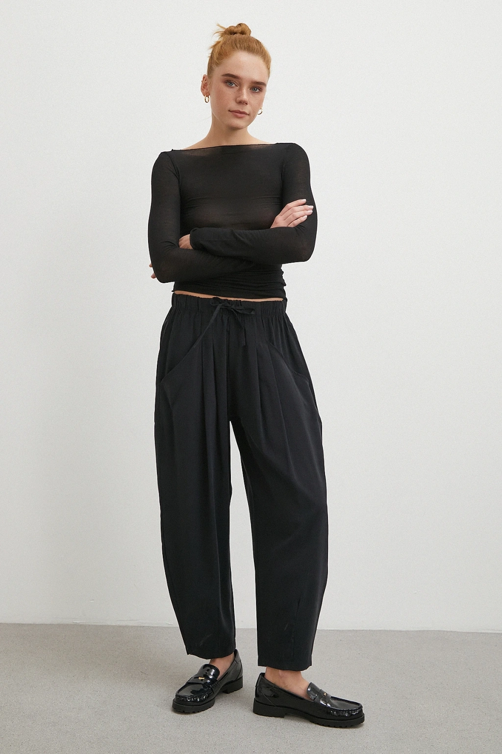 Bağcıklı Beli Lastikli Pileli Pantolon Siyah