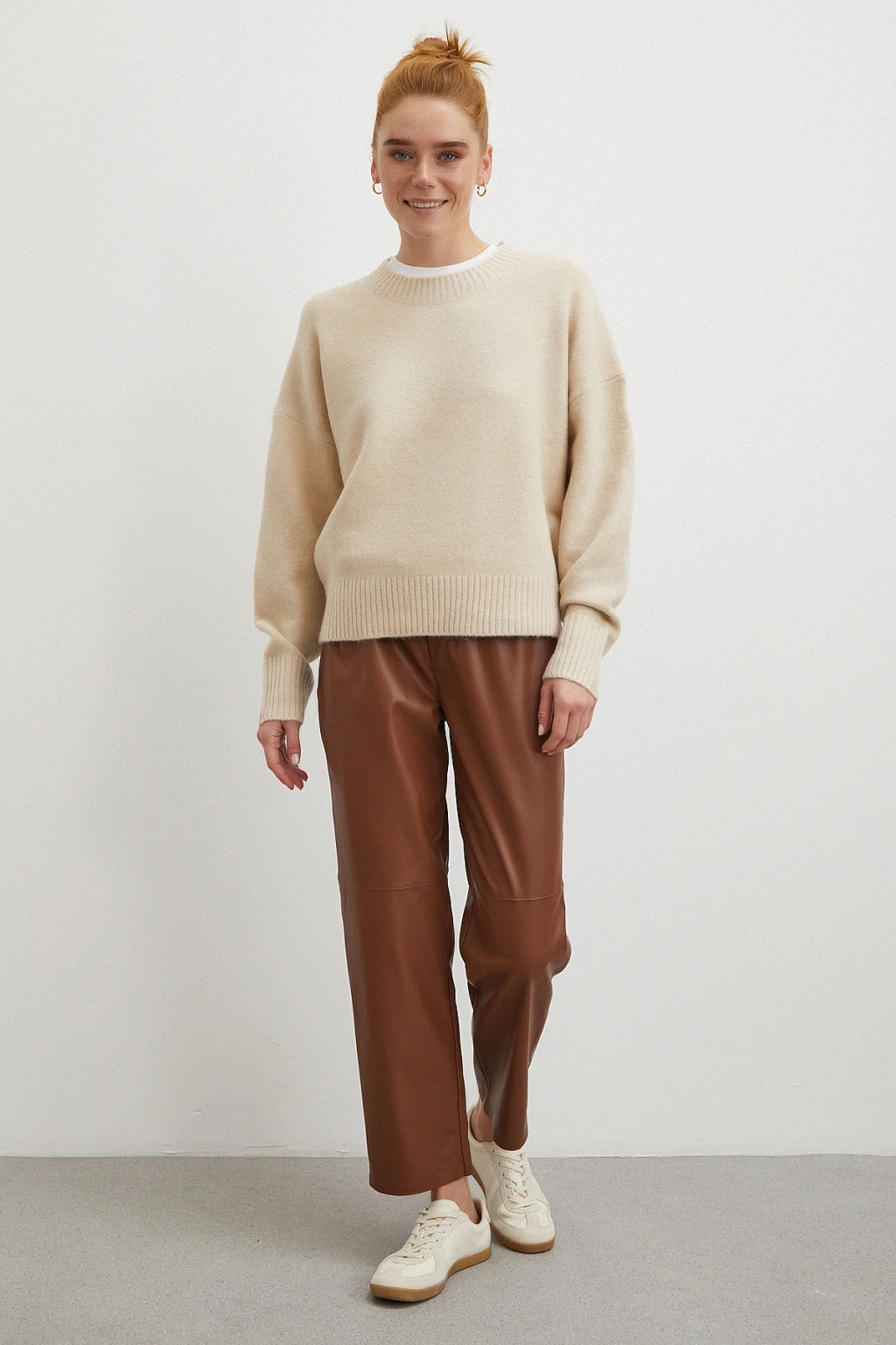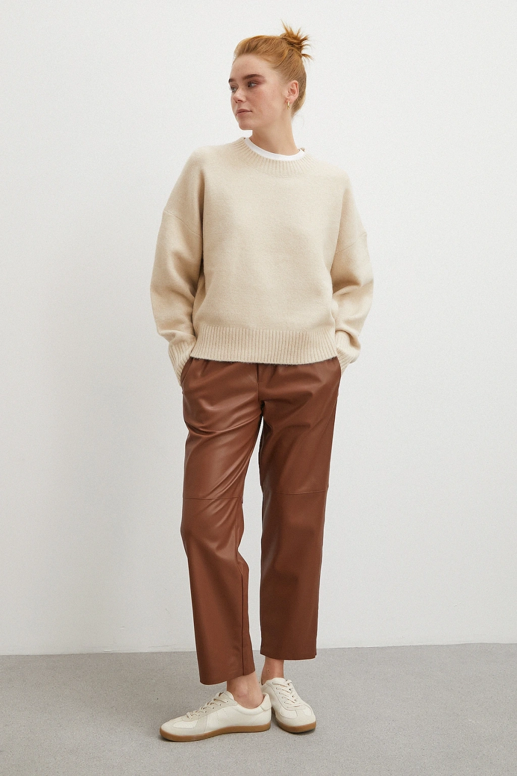 Beli Lastikli Dökümlü Geniş Paça Pantolon Kahve