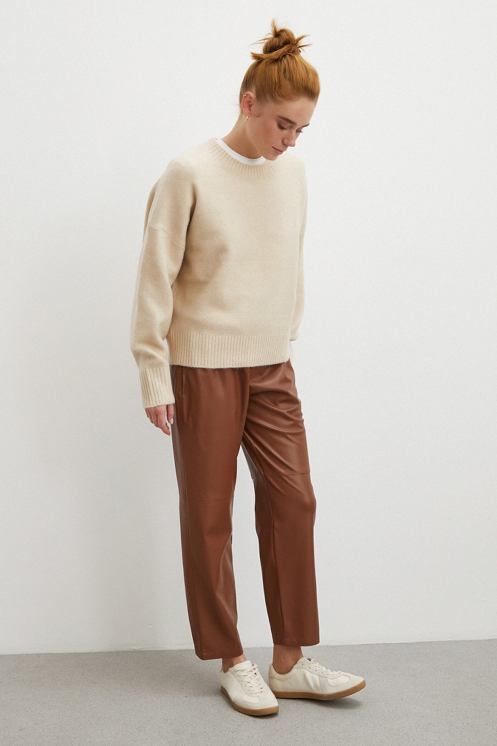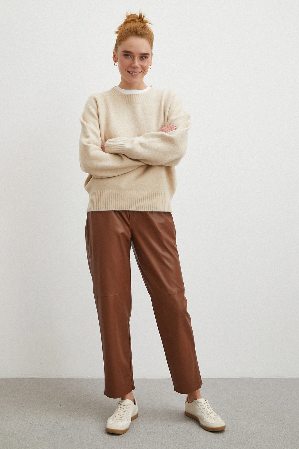 Yüksek Bel Paça Detaylı Kemerli Pantolon Kahve