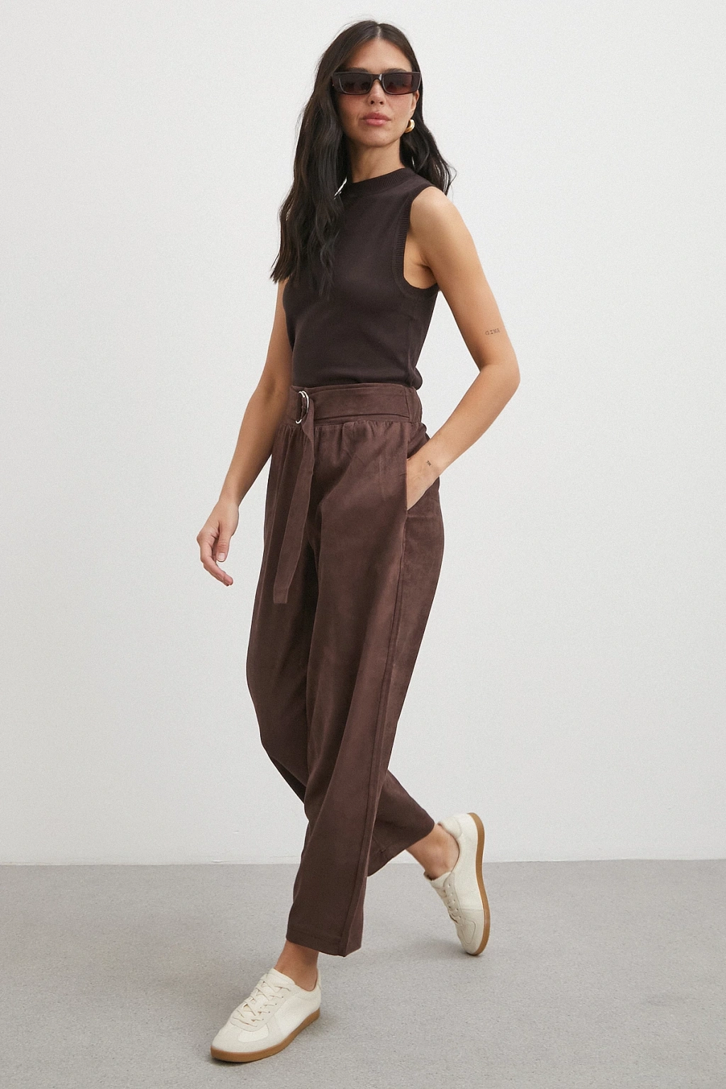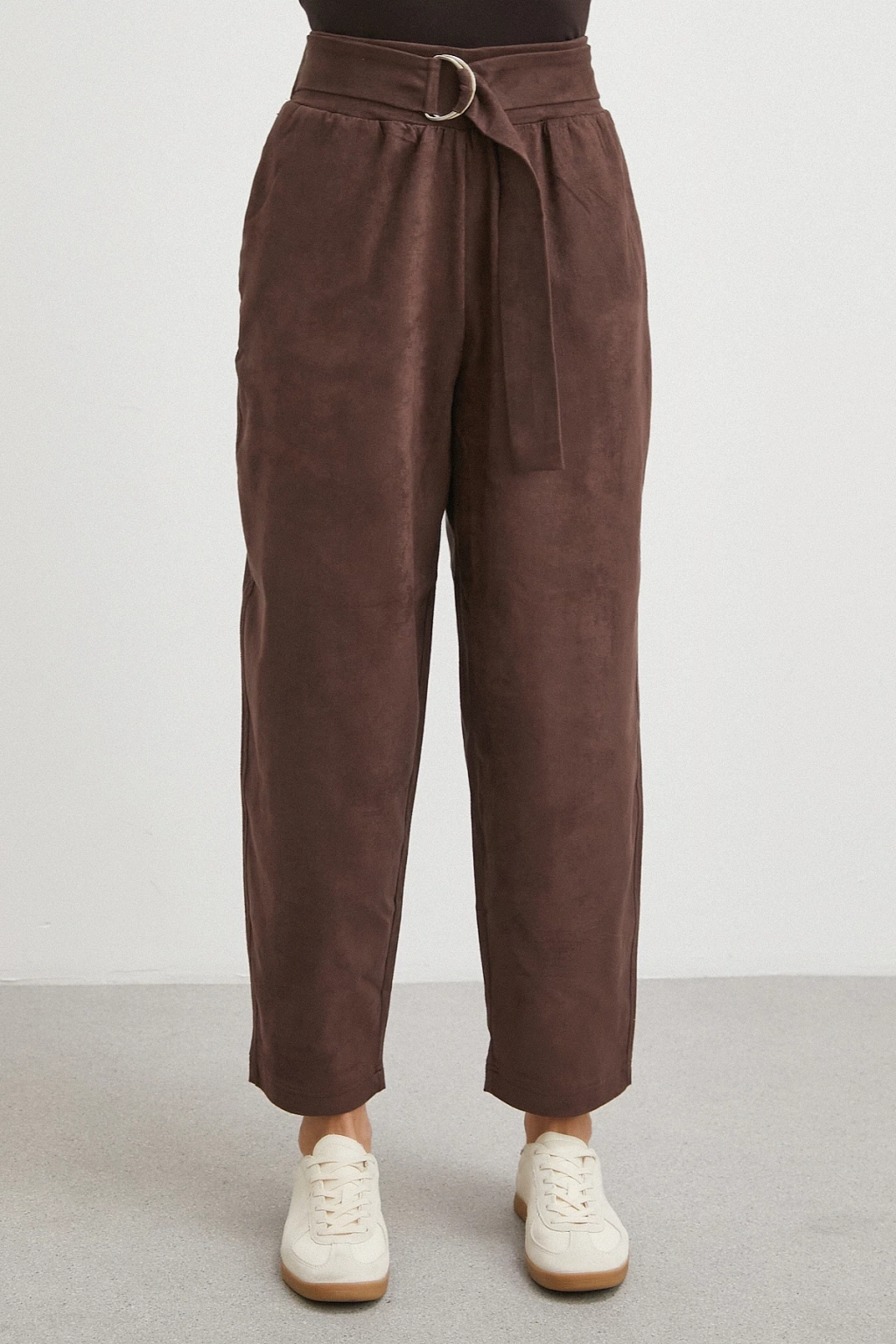 Yüksek Bel Paça Detaylı Kemerli Pantolon Kahve
