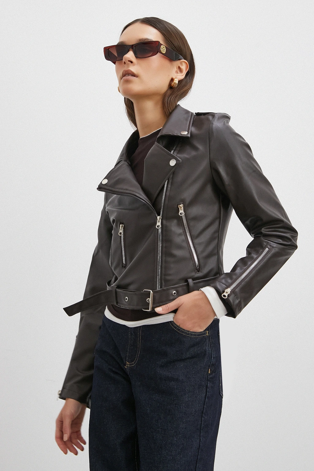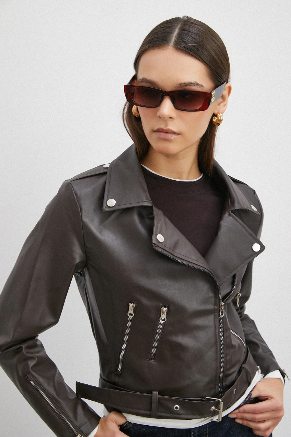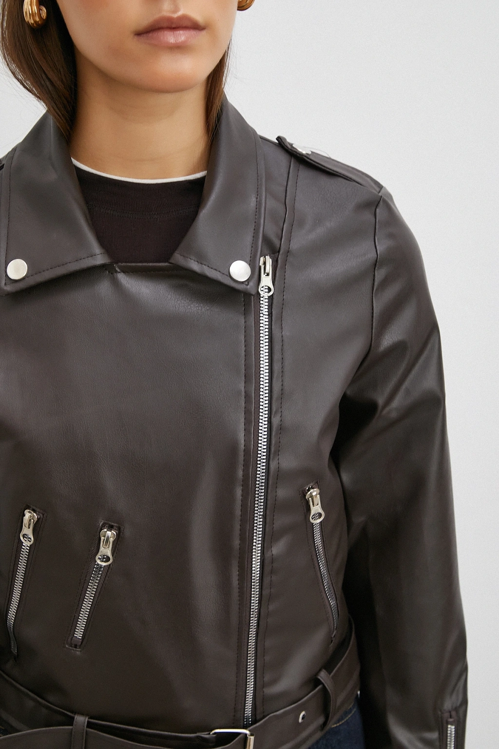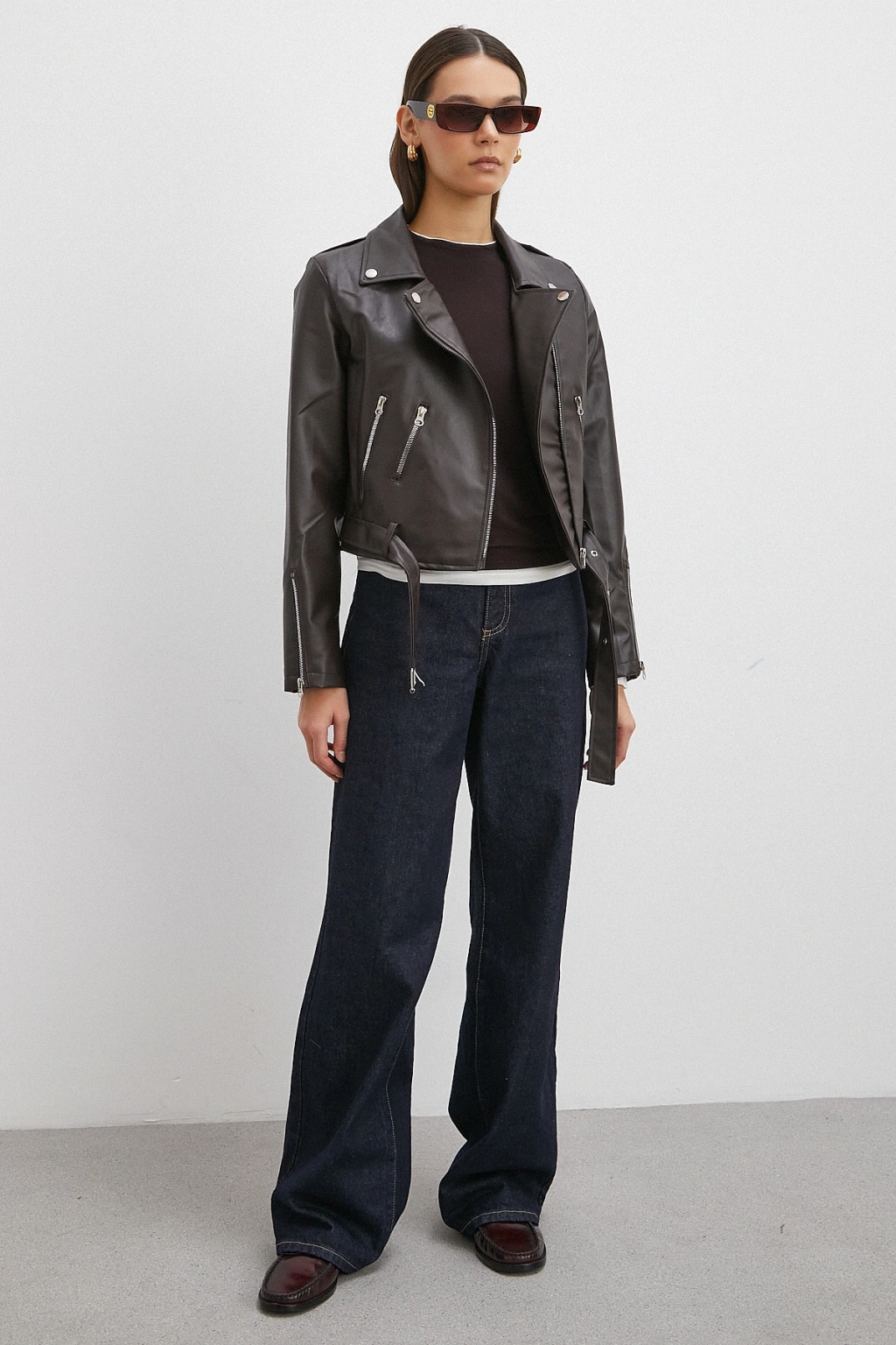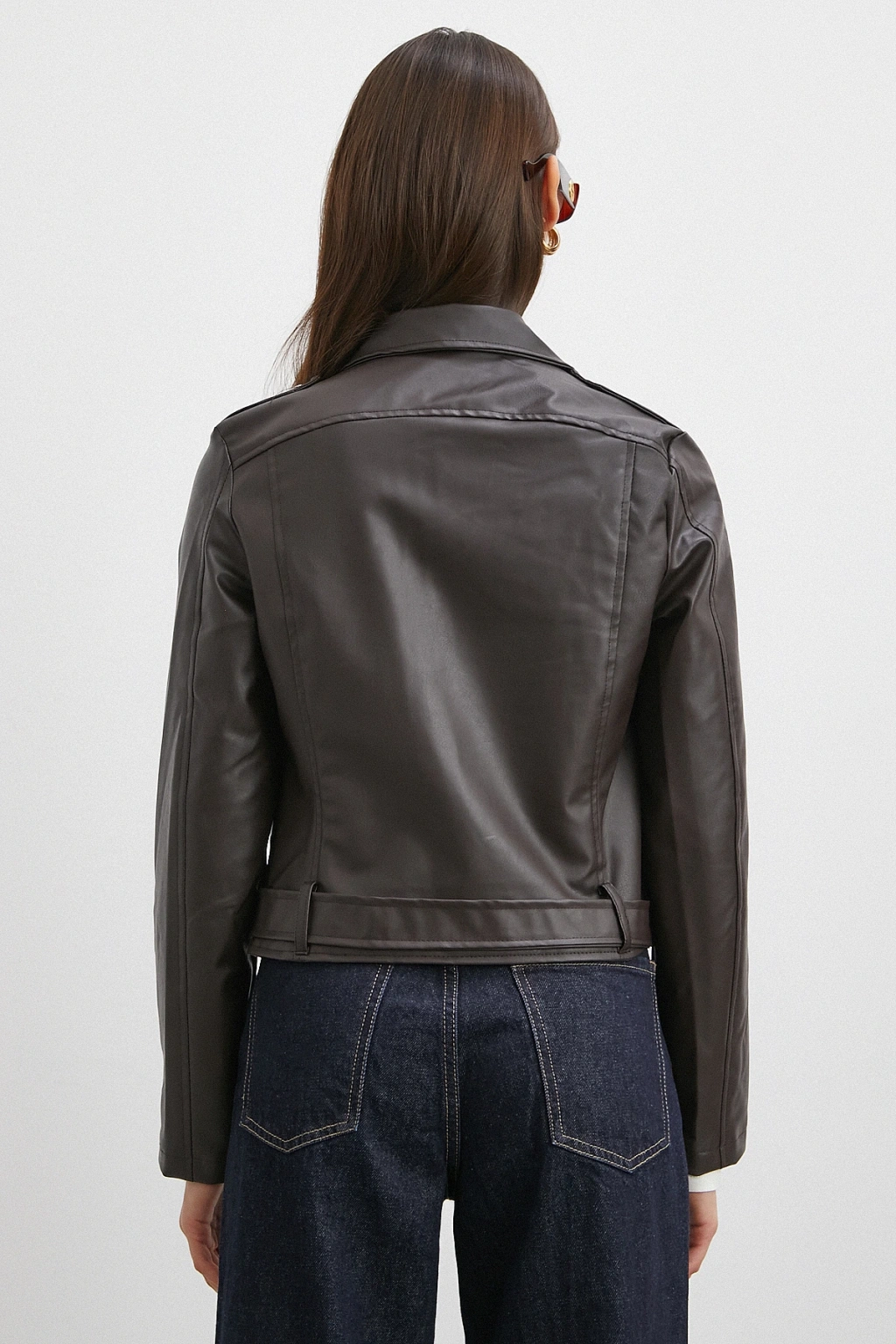 Beli Kemerli Fermuarlı Deri Ceket Kahve
