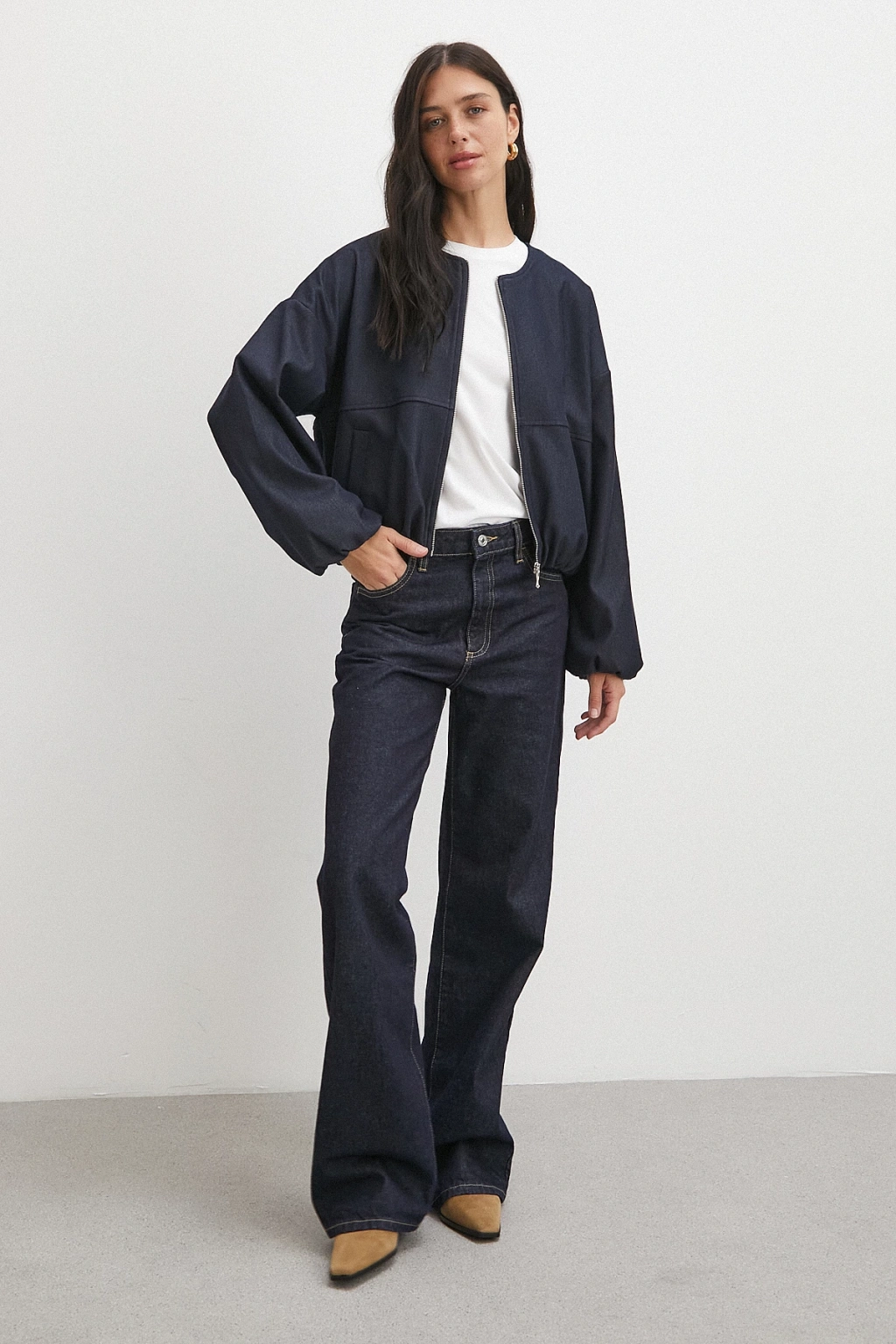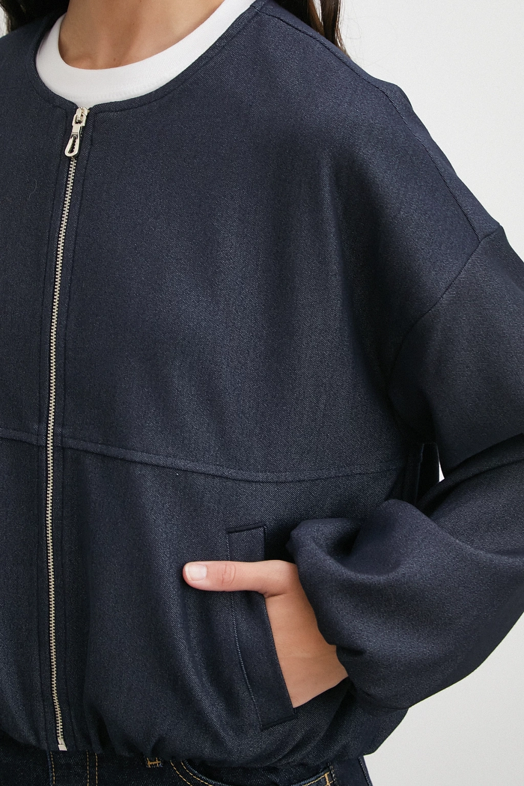 Beli Lastikli Fermuarlı Denim Görünümlü Bomber Ceket Lacivert