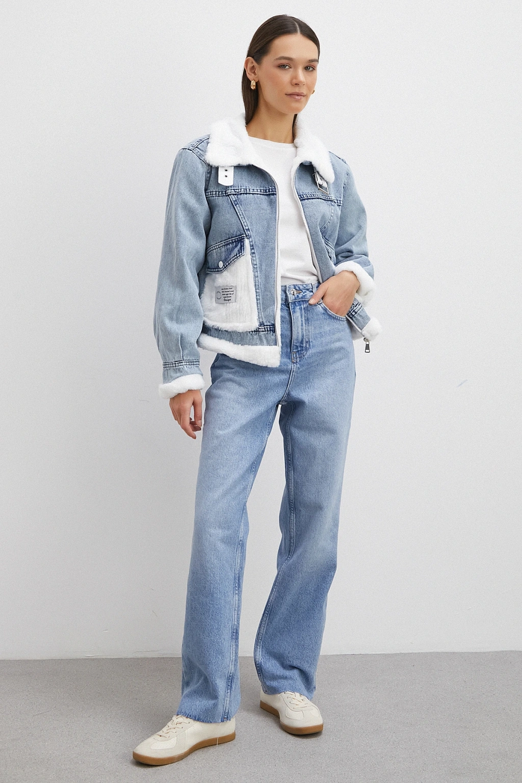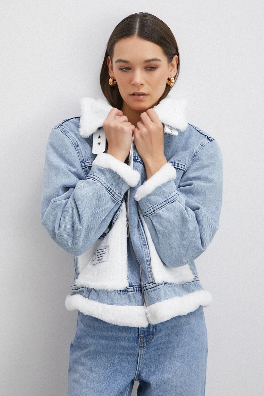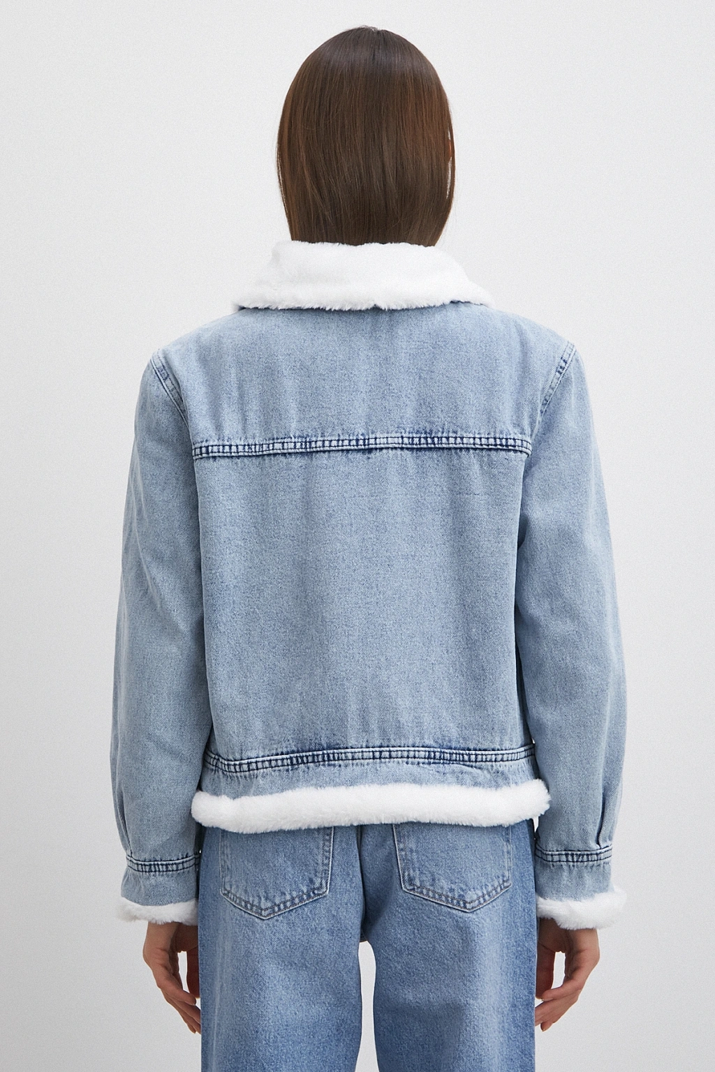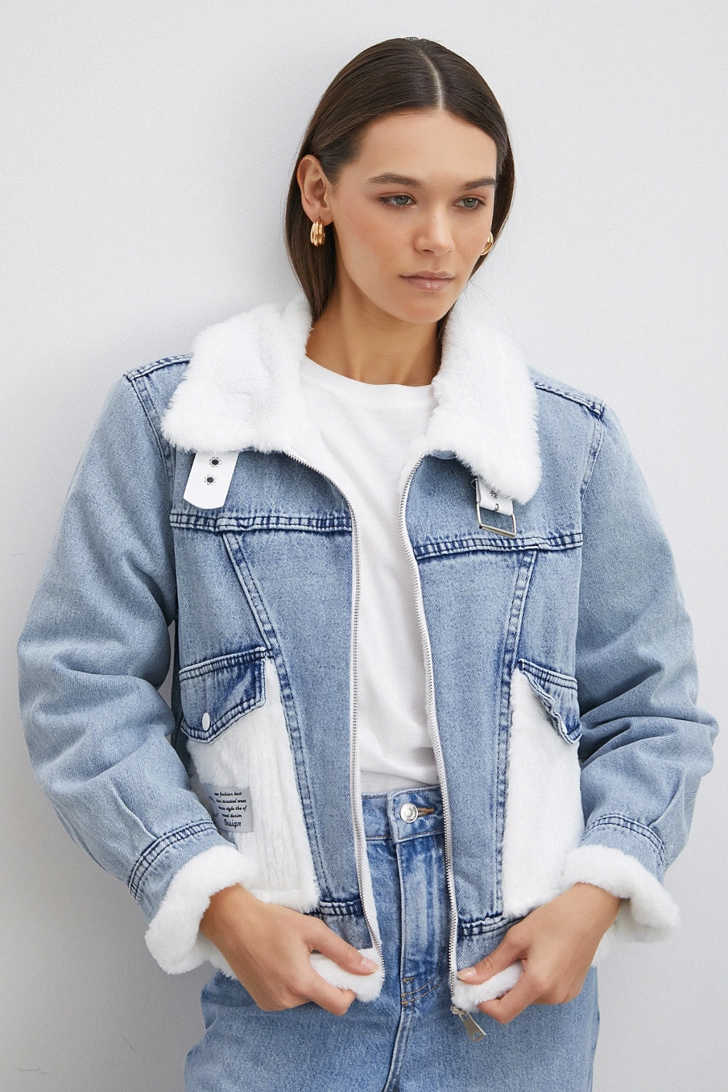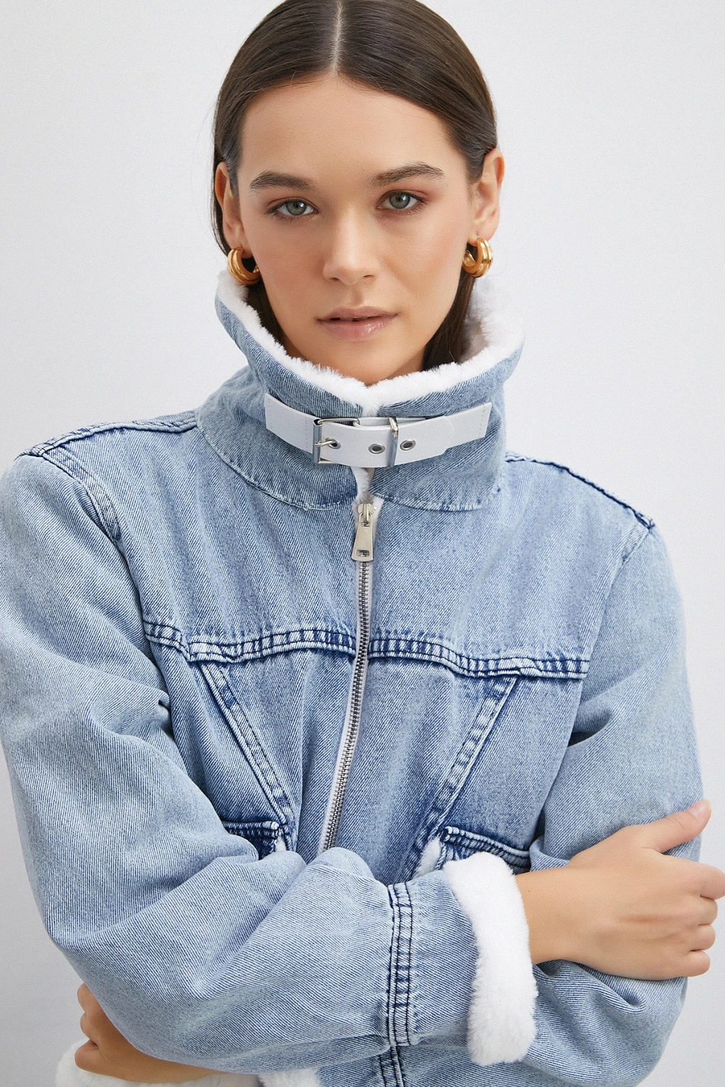 Beyaz Kemer Detaylı Kürklü Kot Mont Mavi