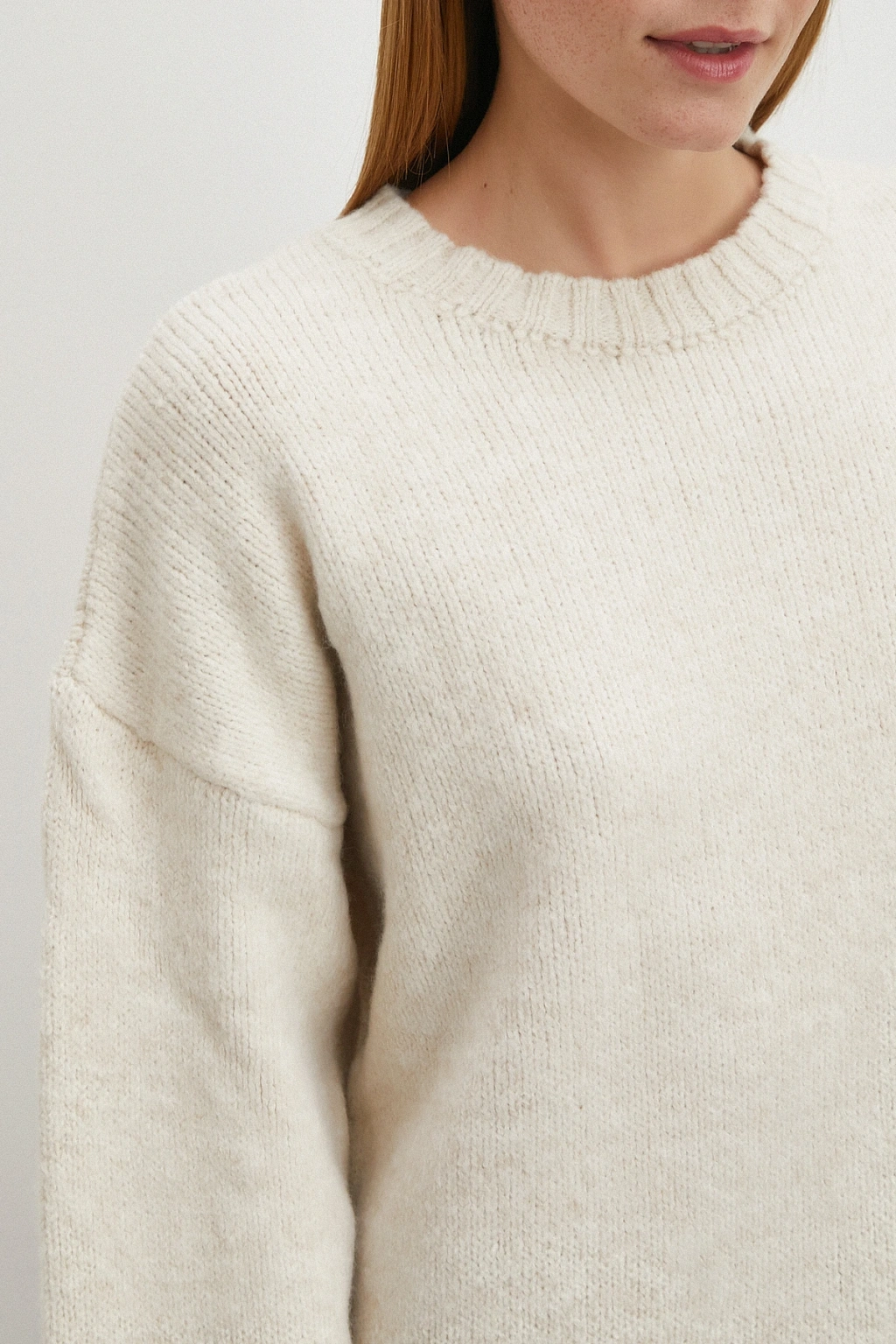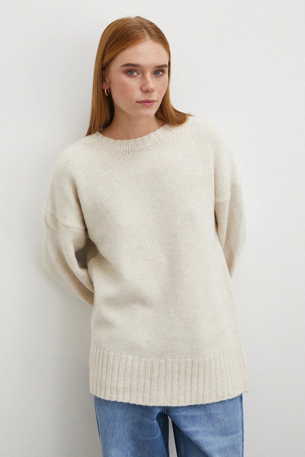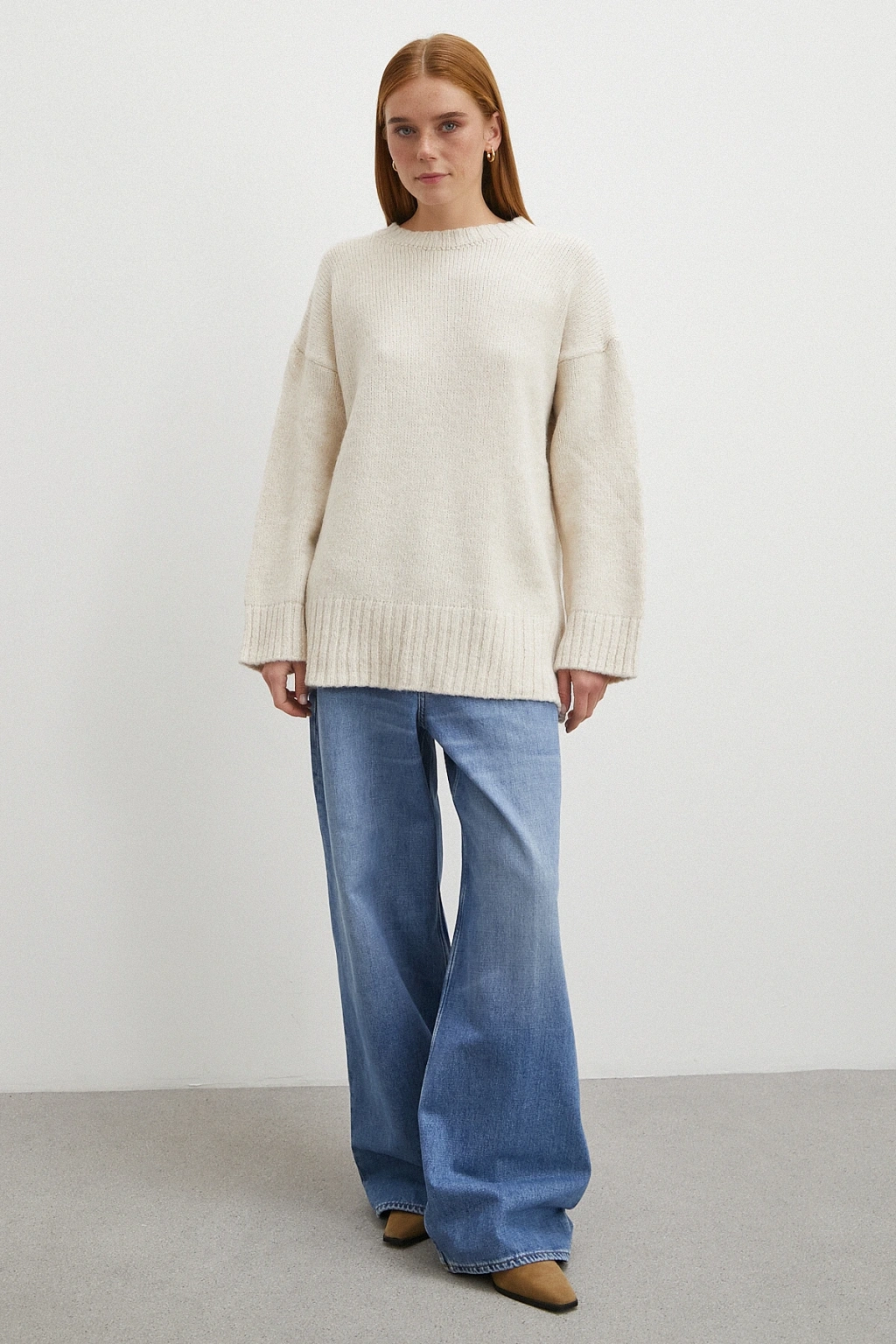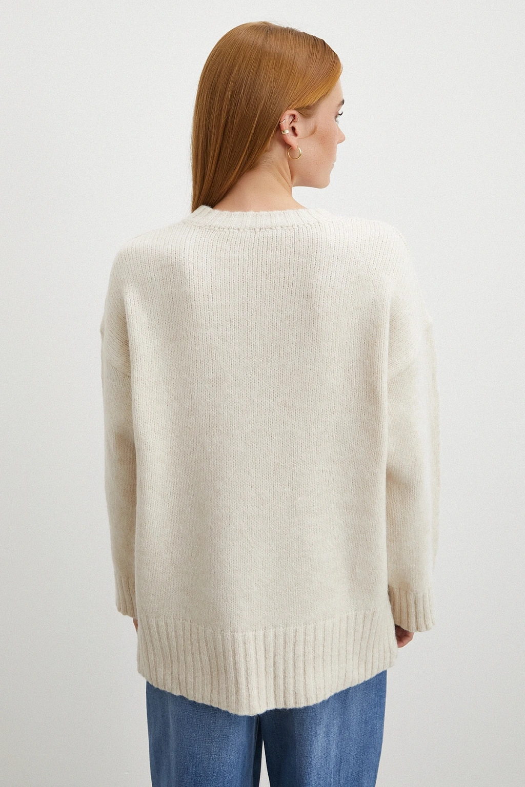 Kayık Yaka Uzun Kol Kazak Ekru