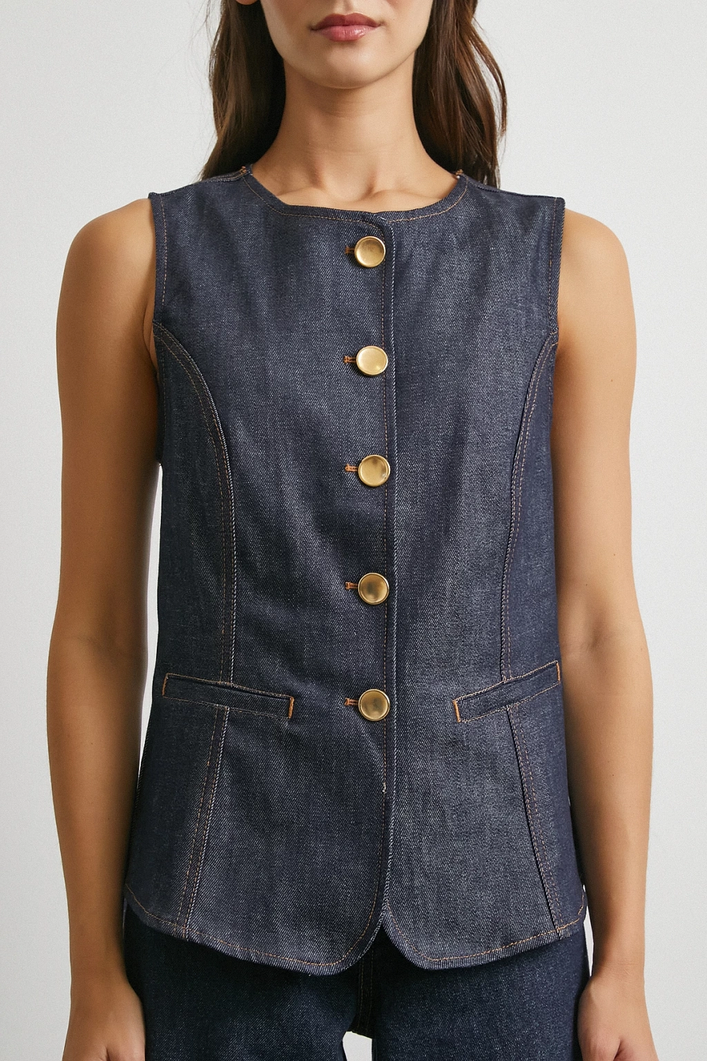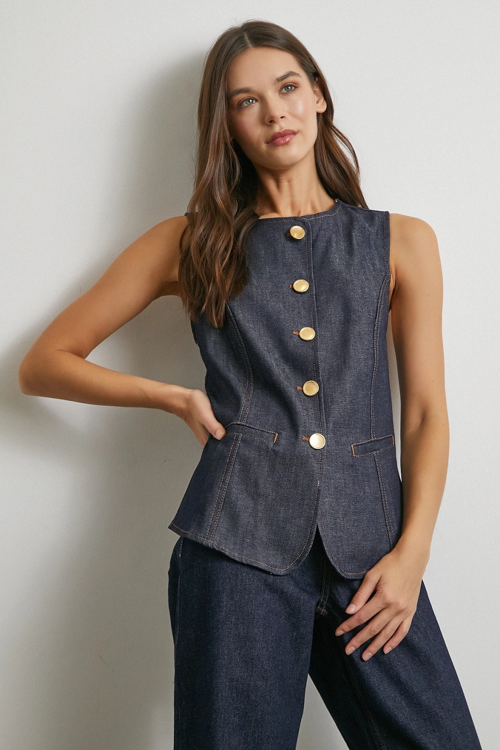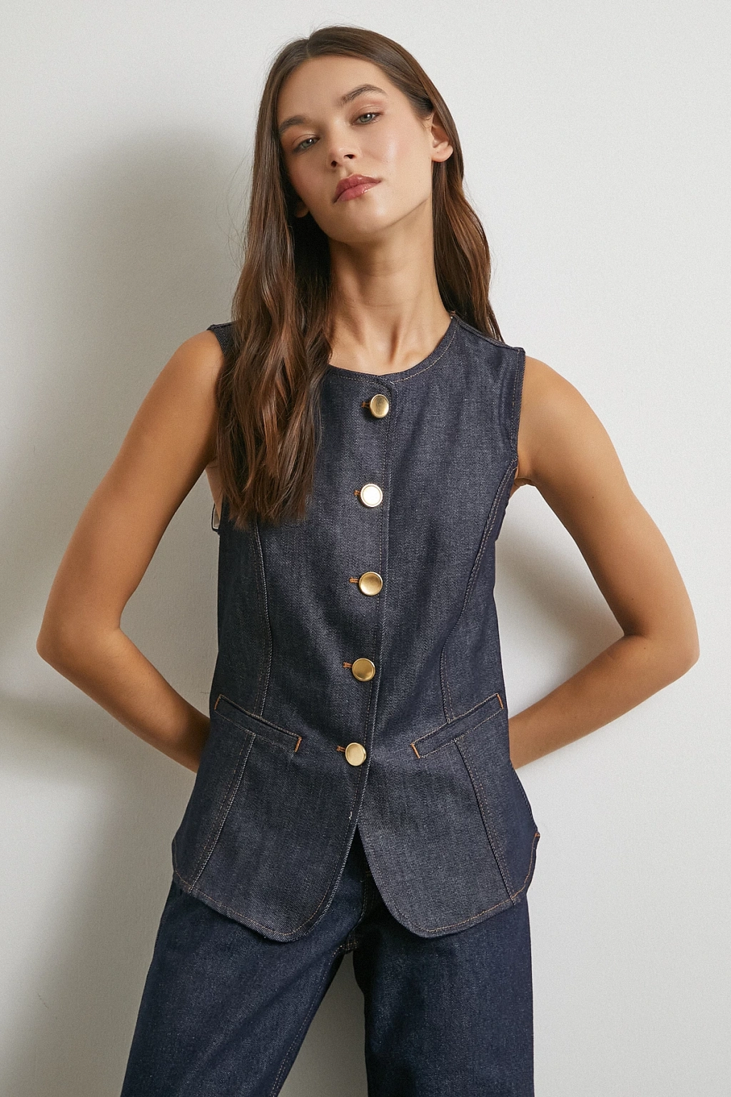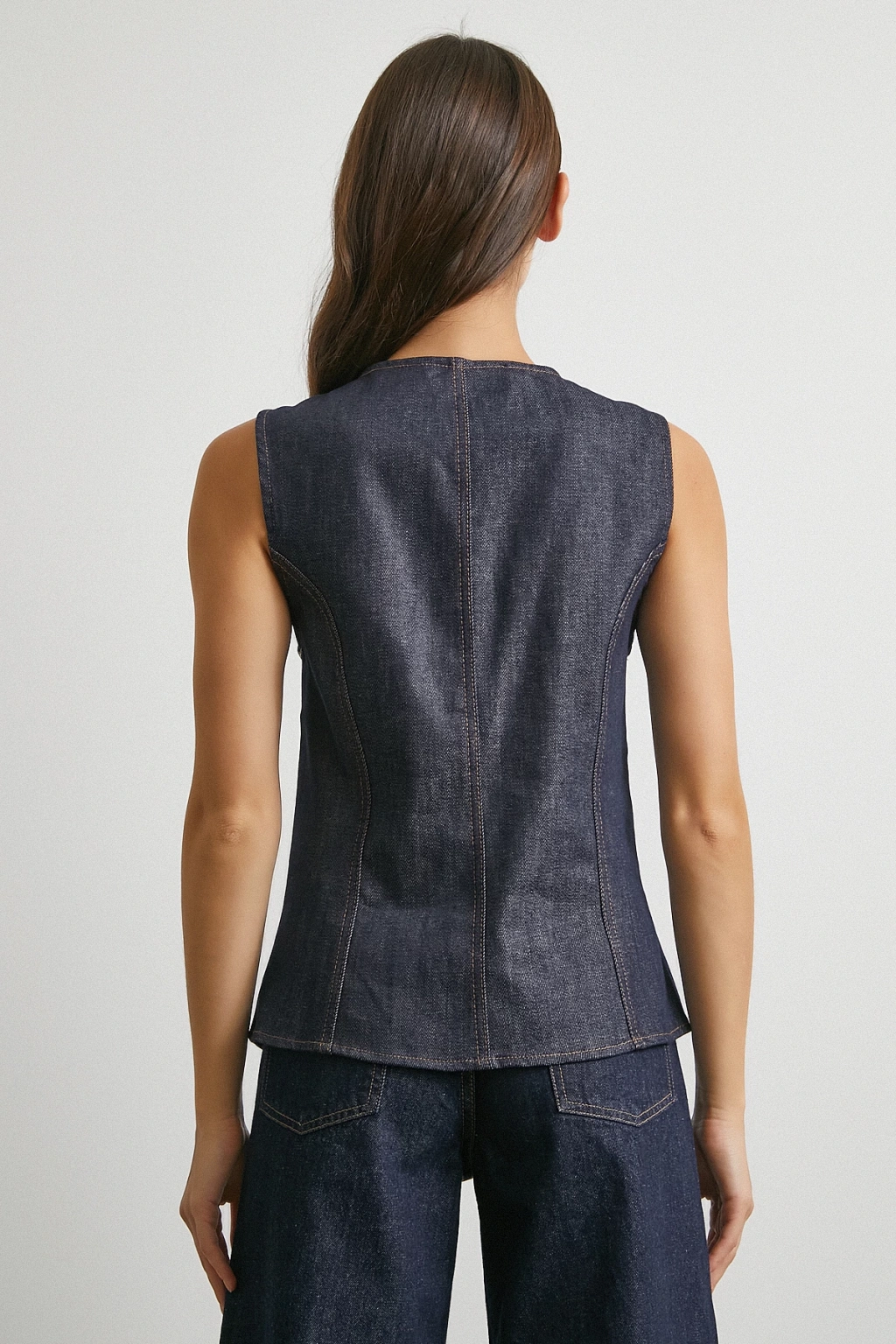 Bisiklet Yaka Metal Düğmeli Denim Yelek Lacivert