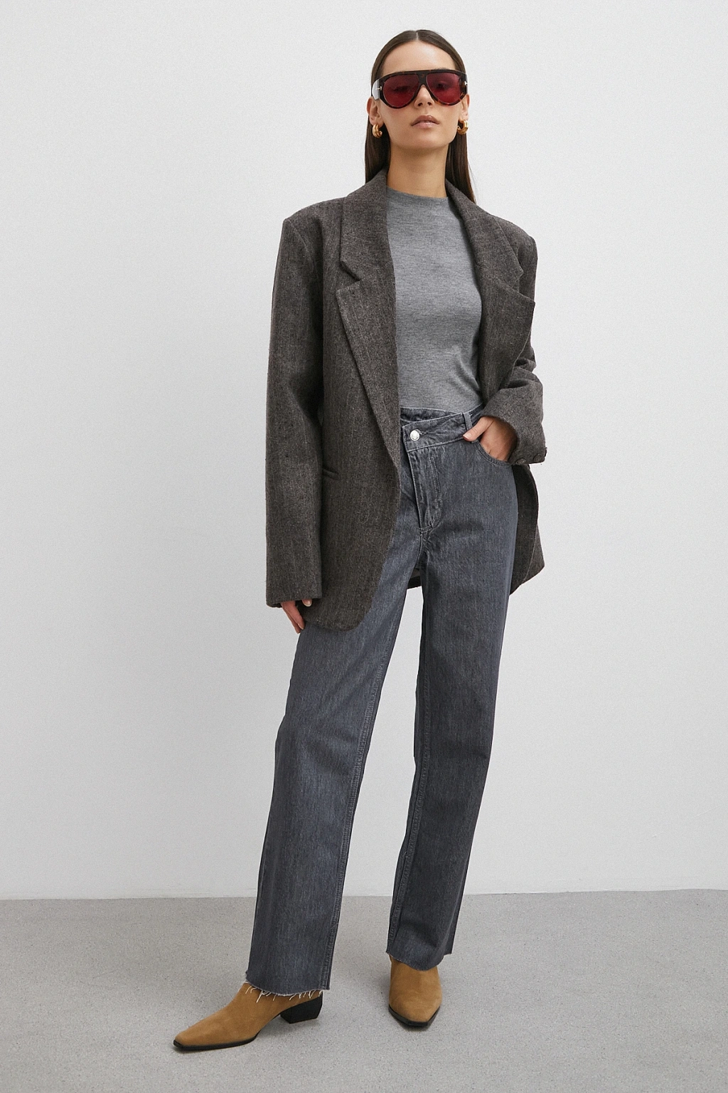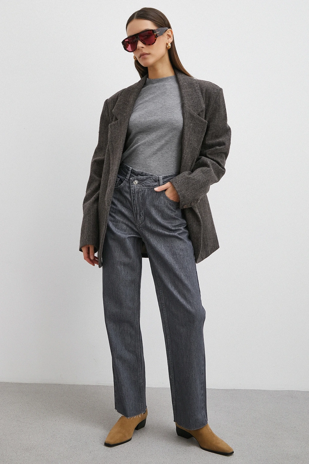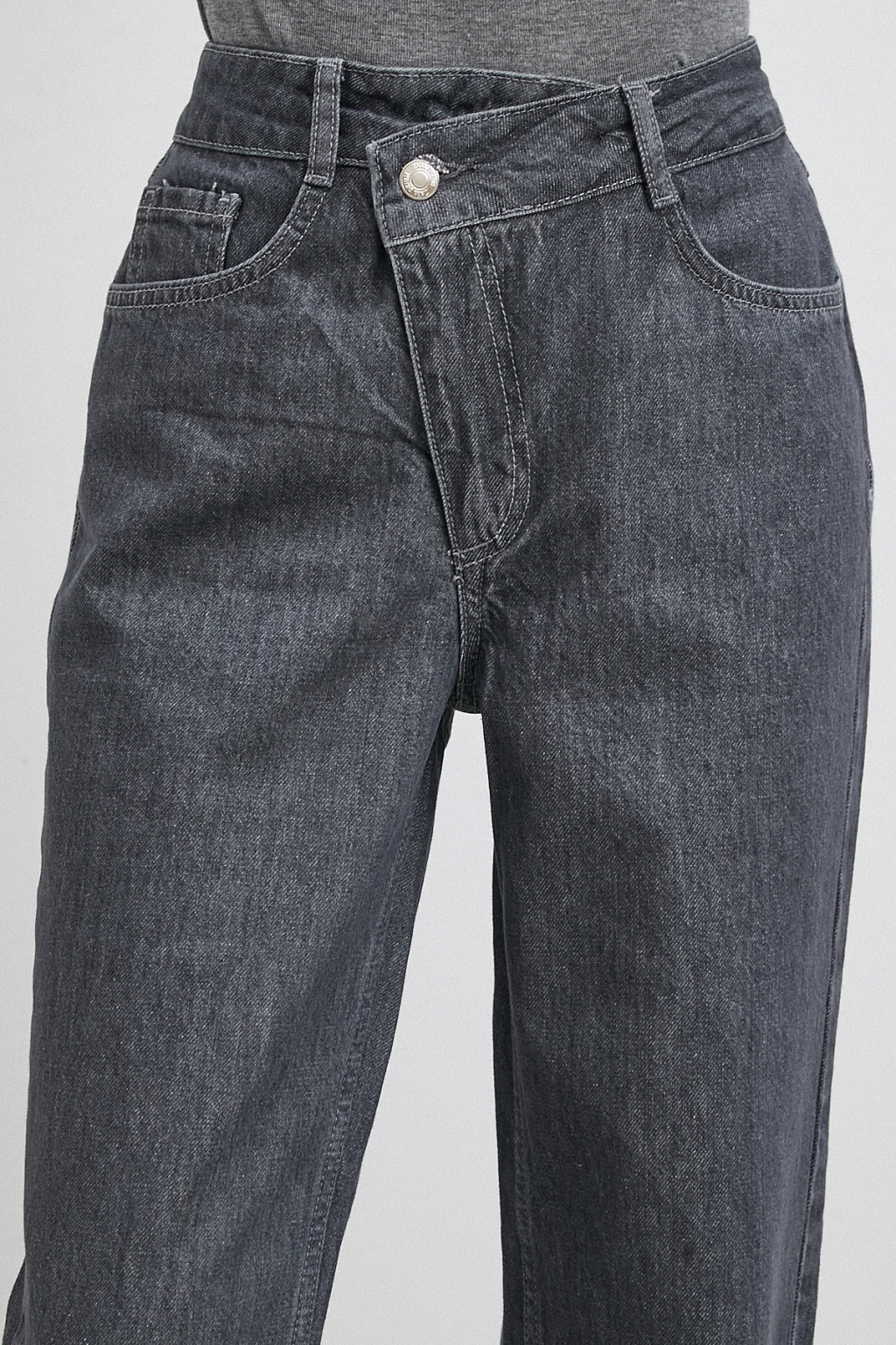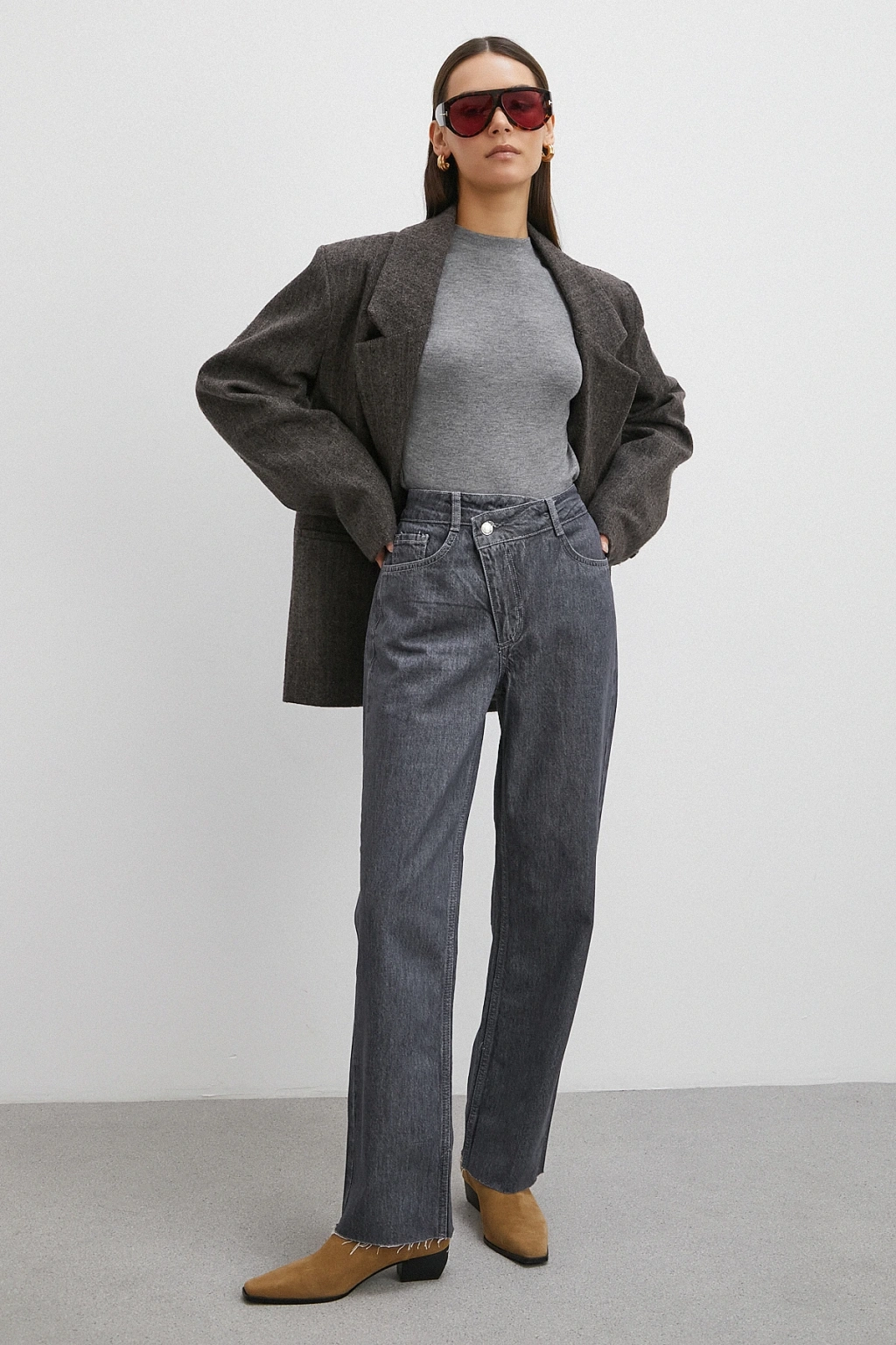 Çapraz Fermuarlı Kesik Paça Düğmeli Jean Füme