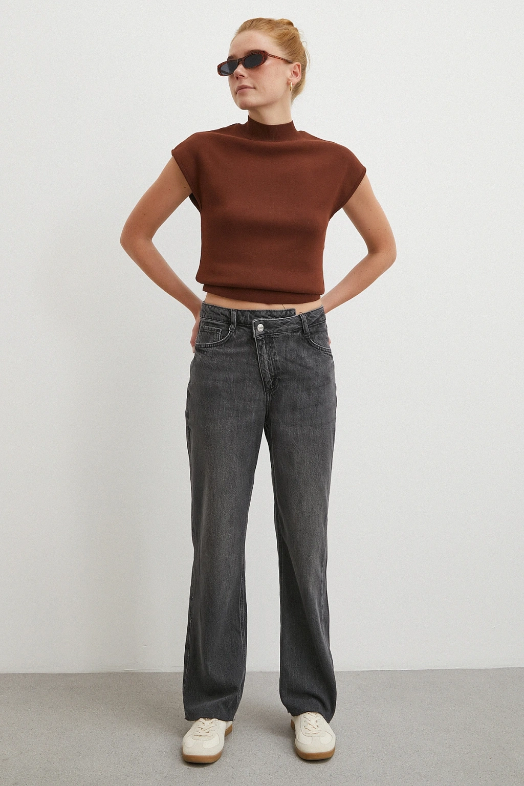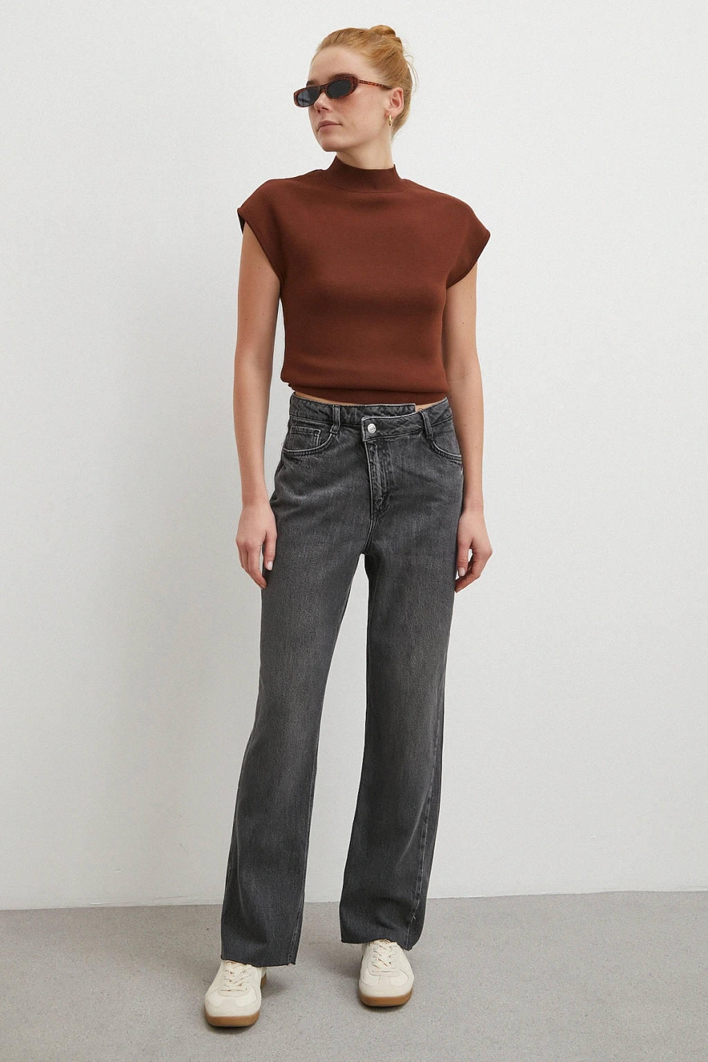 Yüksek Bel Kesik Boru Paça Jean Kahve
