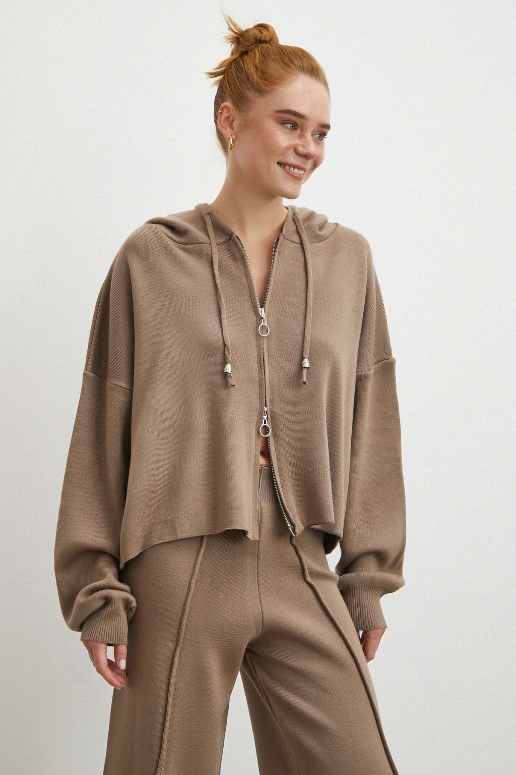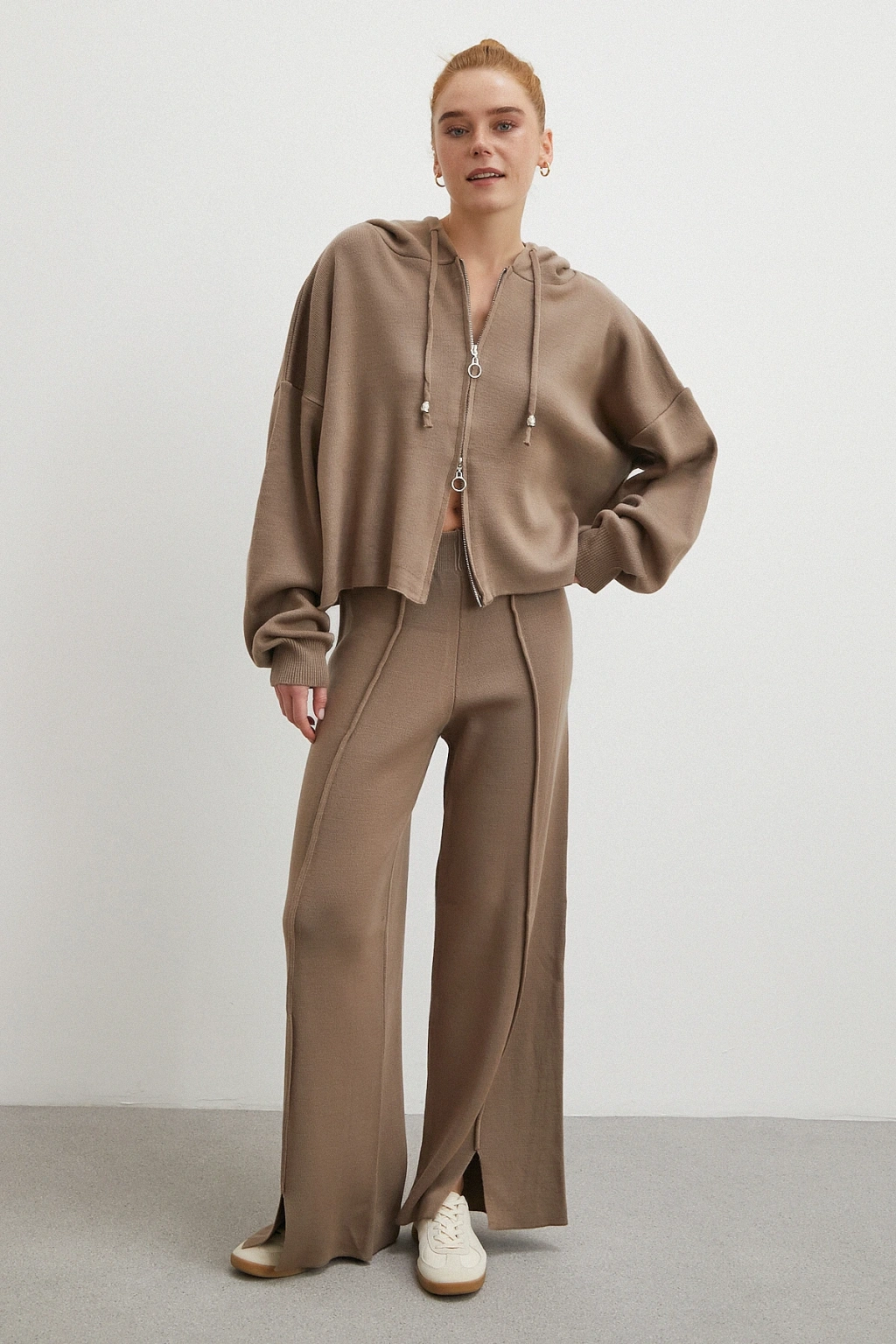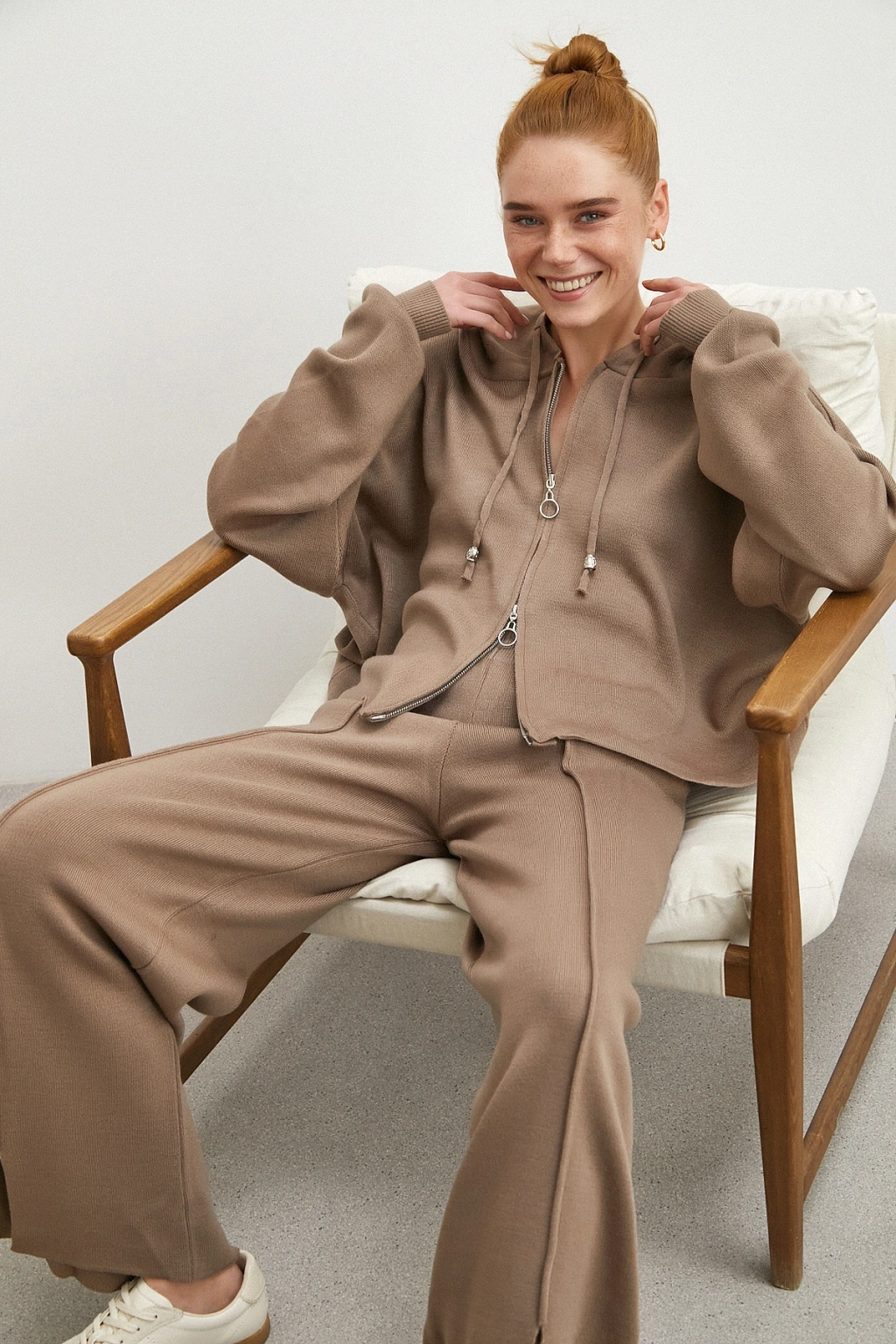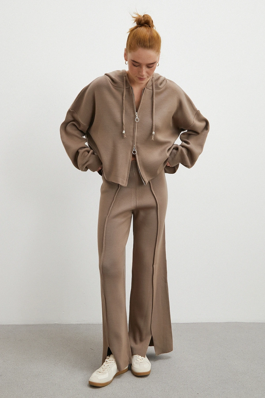 Çift Fermuarlı Kapüşonlu Pantolonlu Takım Vizon