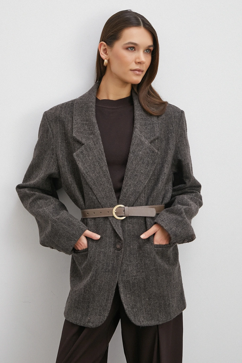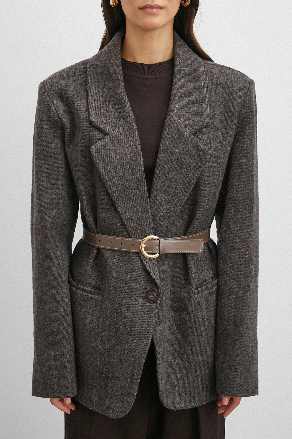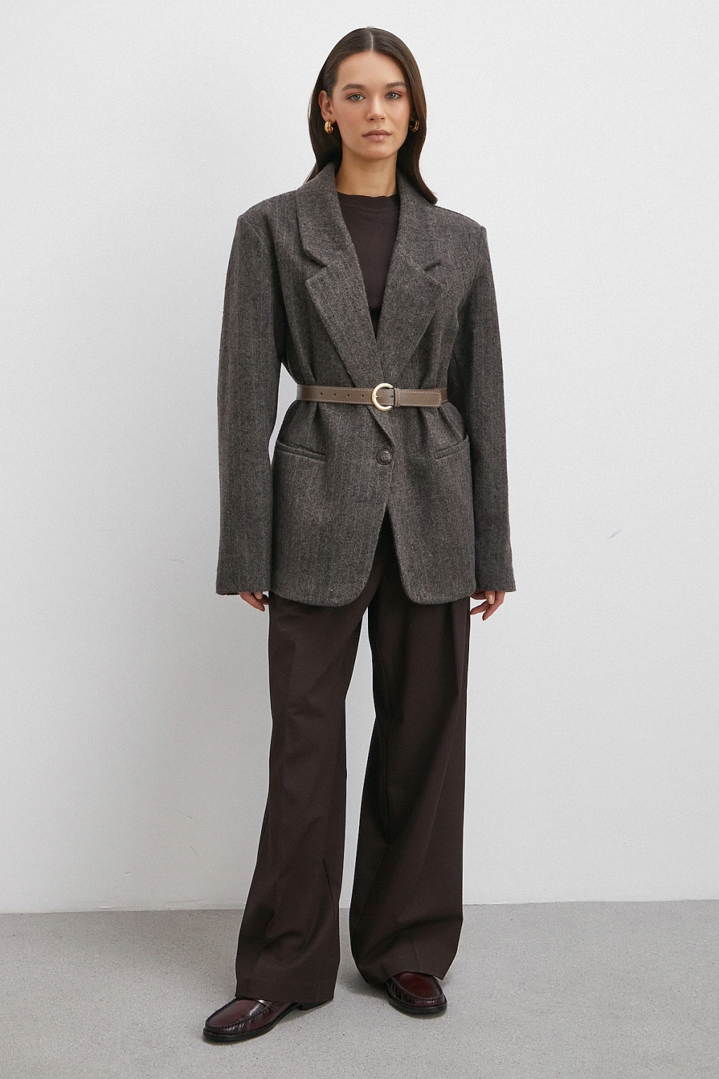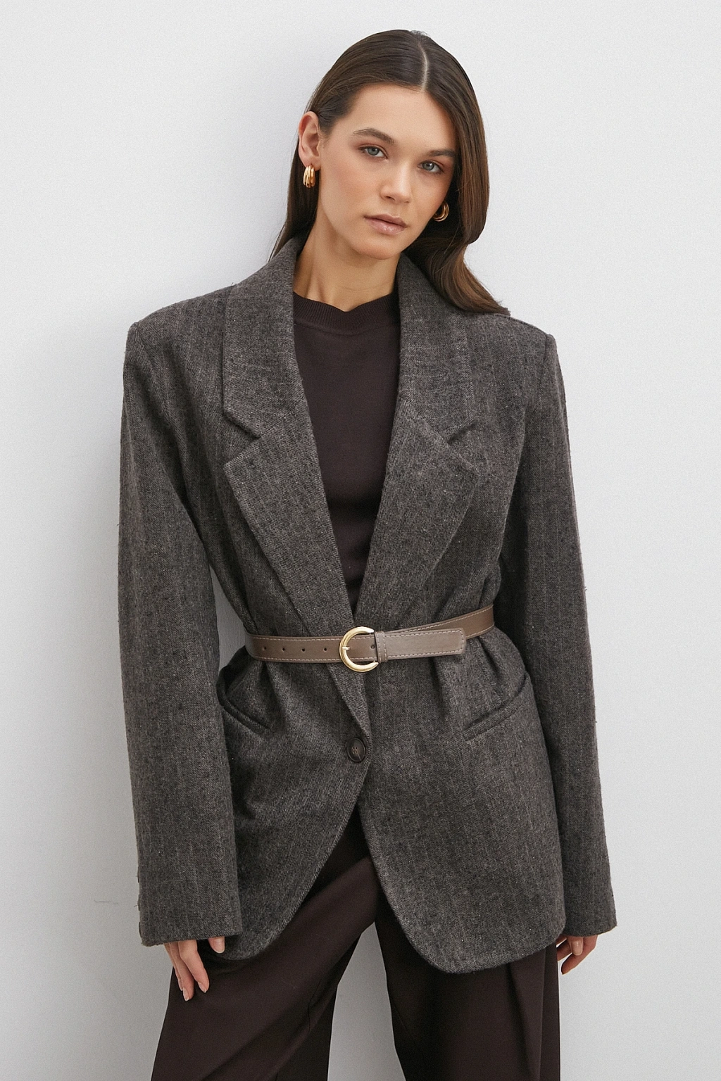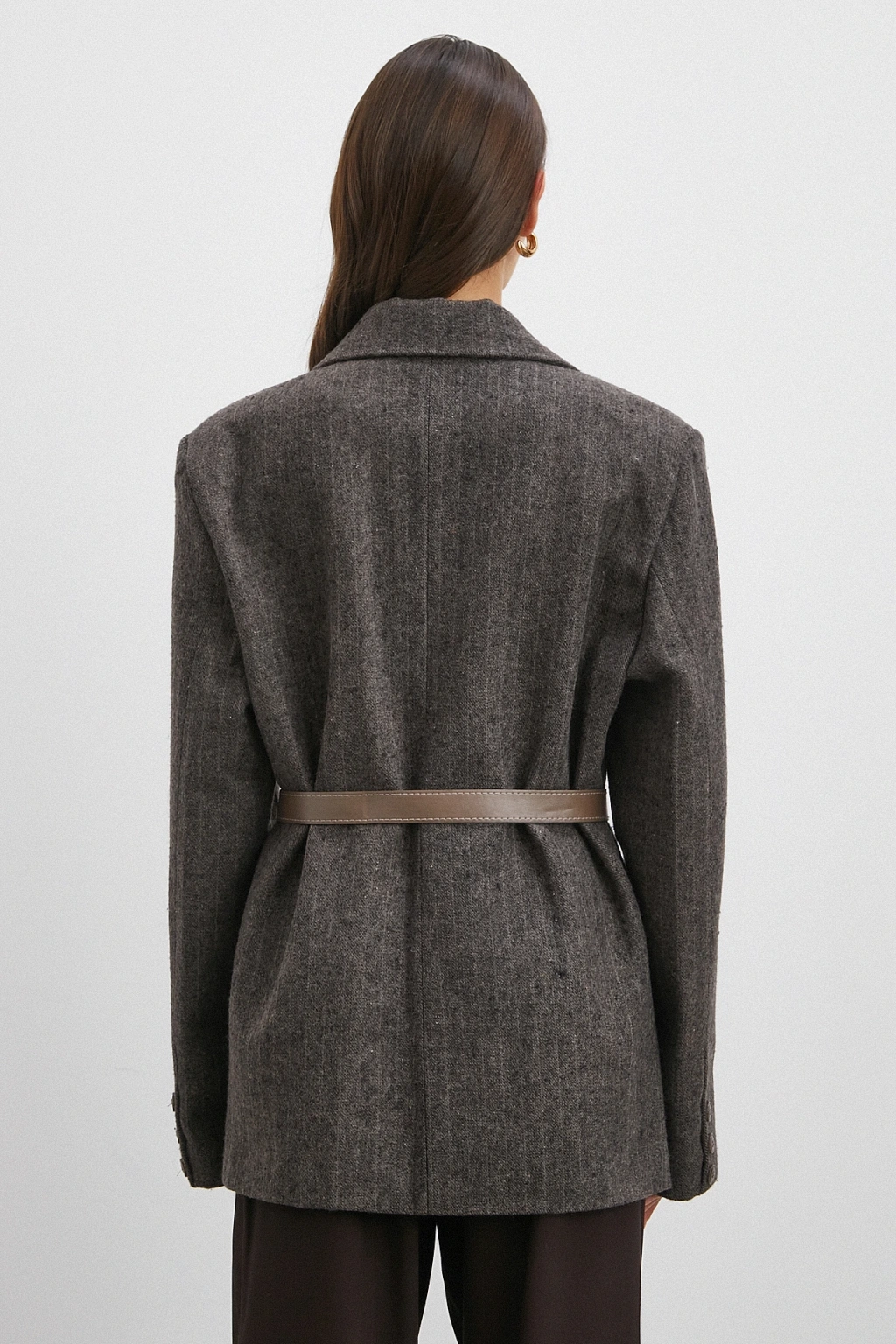 Çizgi Detaylı Kemerli Kaşa Ceket Kahve