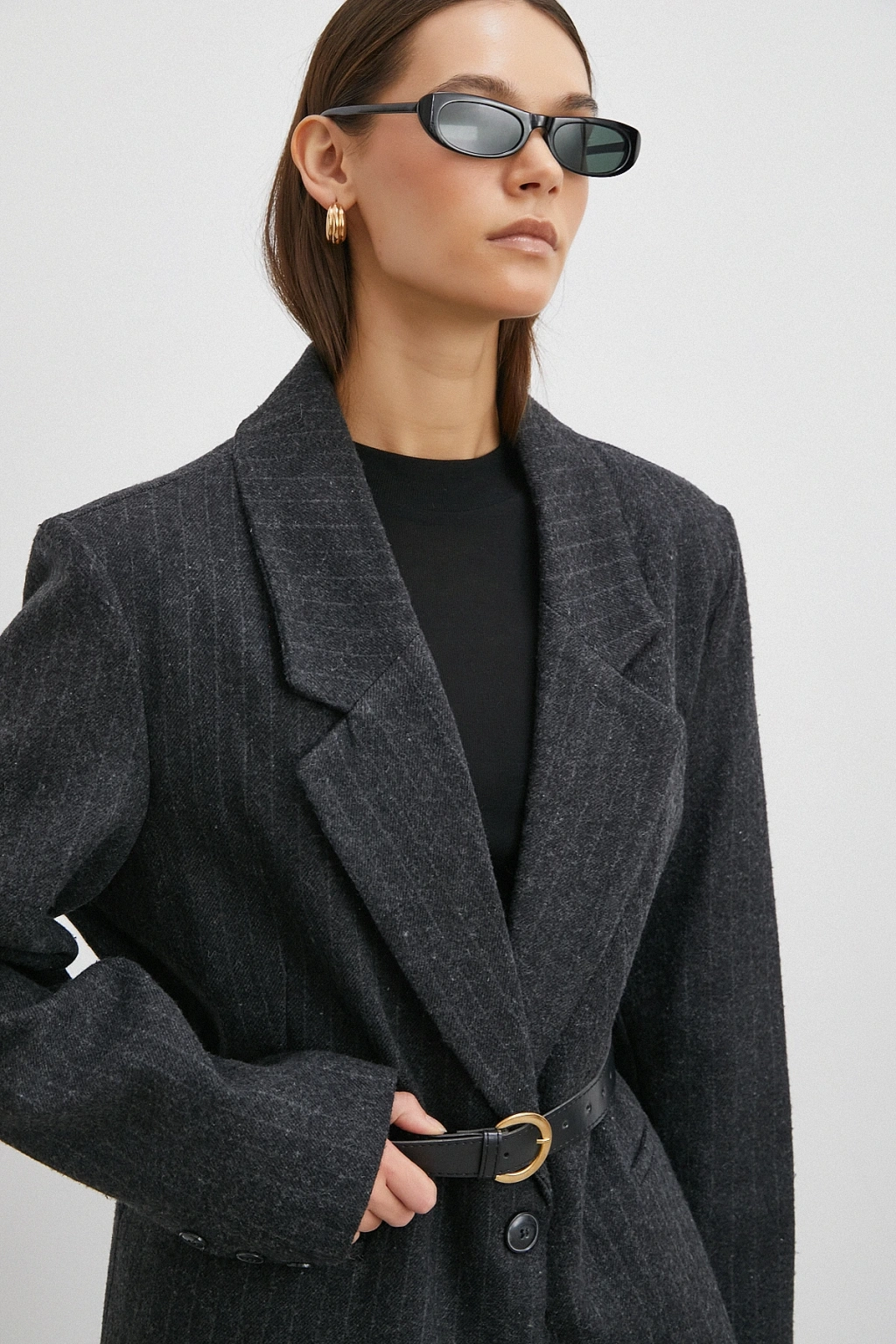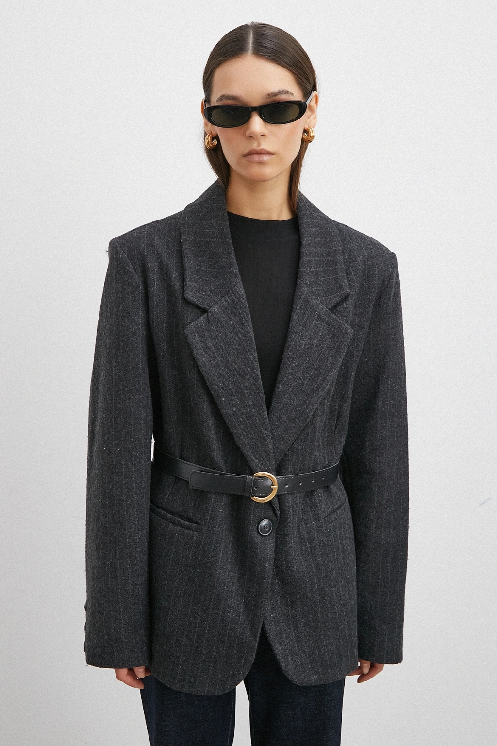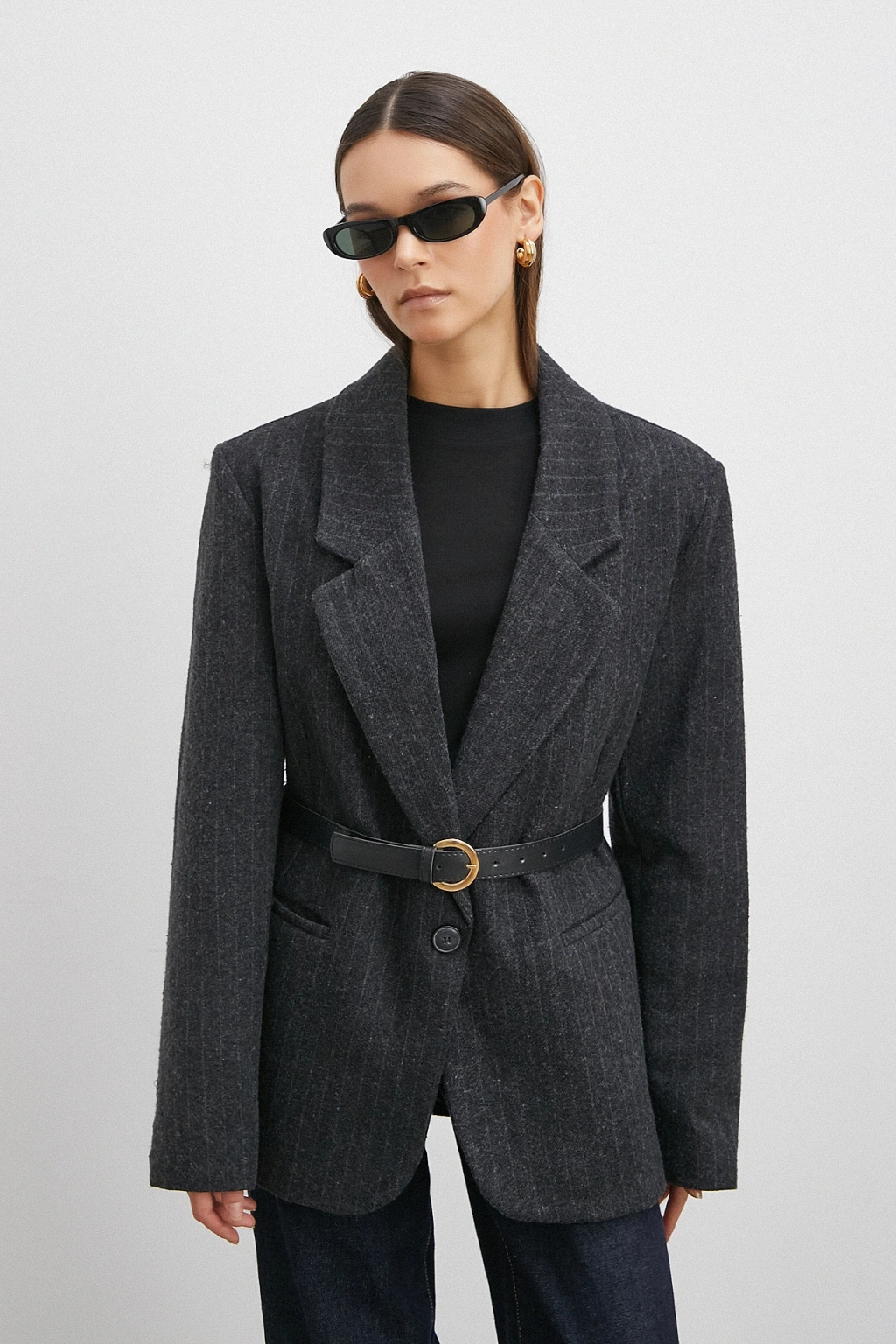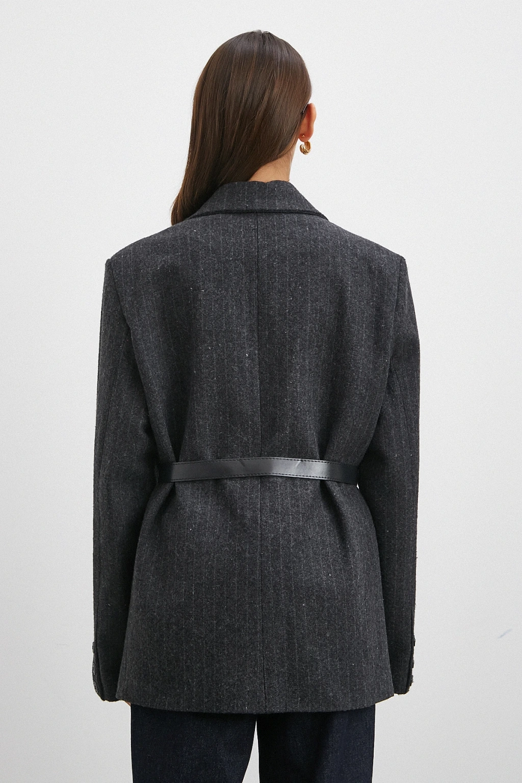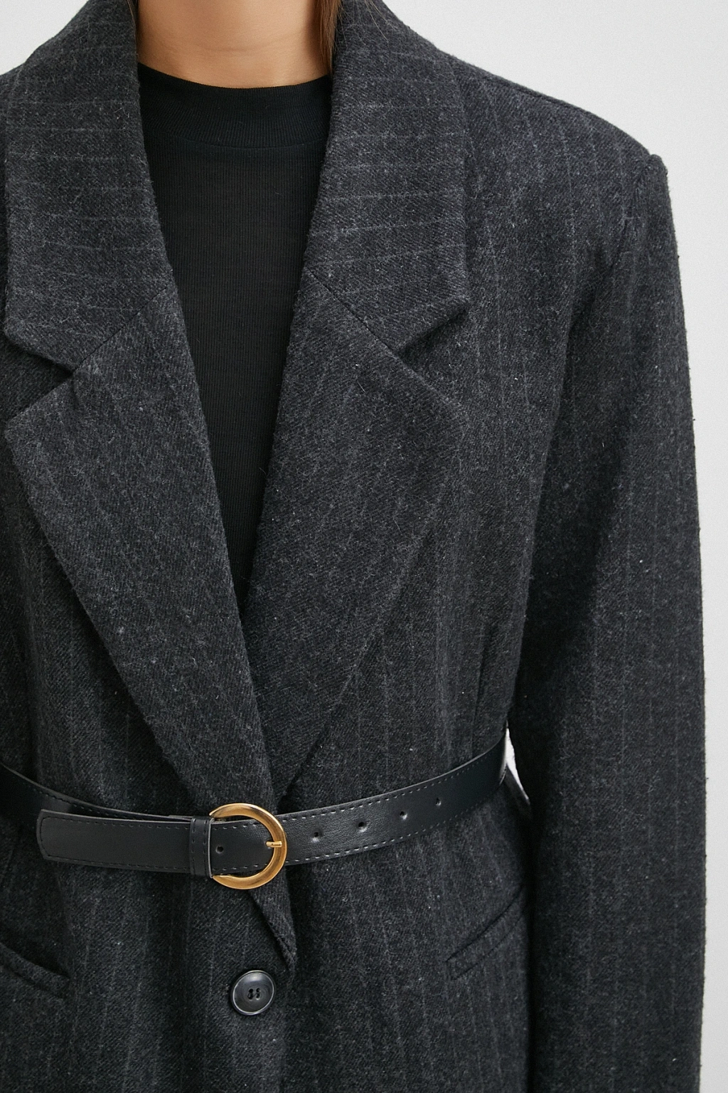Çizgi Detaylı Kemerli Kaşa Ceket Siyah