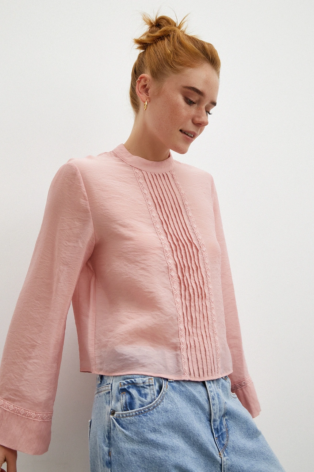 Dantel Kesimli Uzun Kollu Bluz Pembe