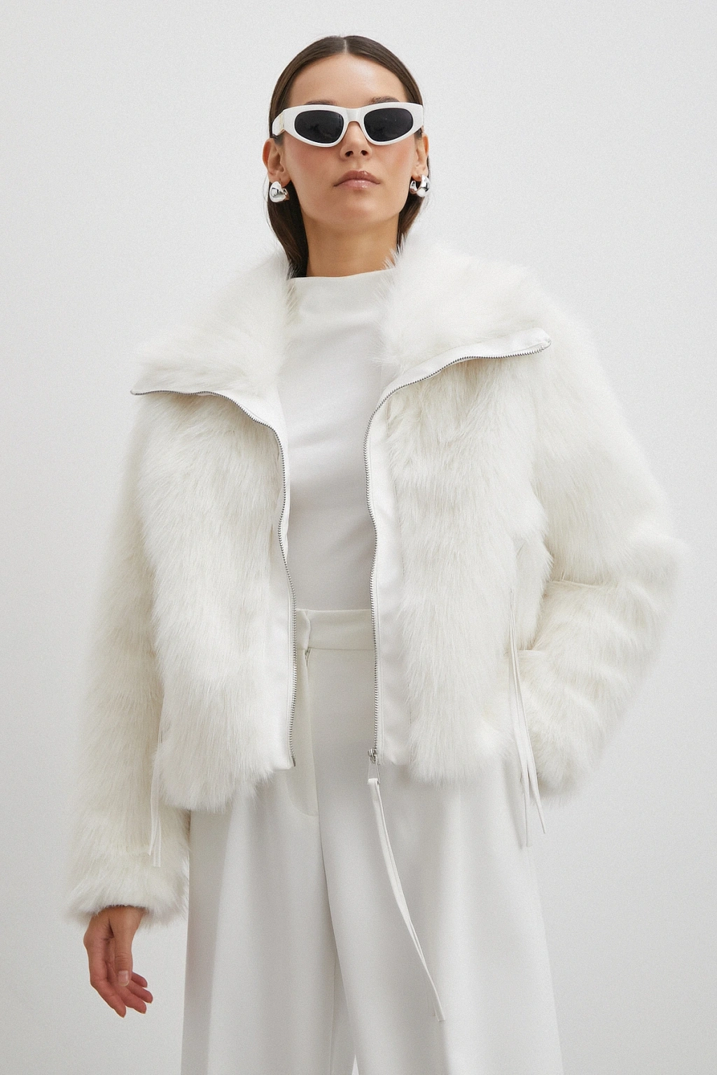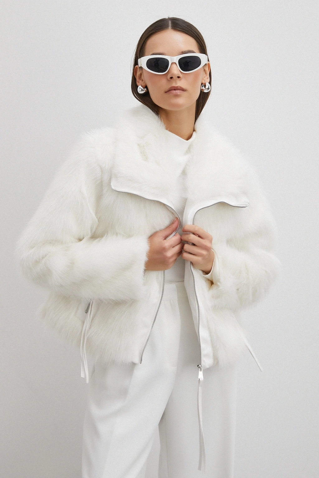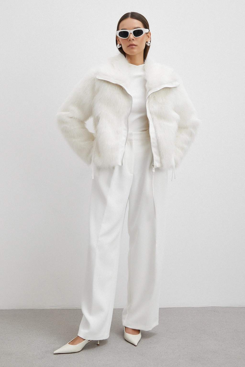 Beyaz Kemer Detaylı Kürklü Kot Mont Mavi
