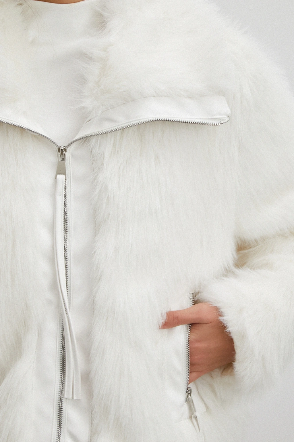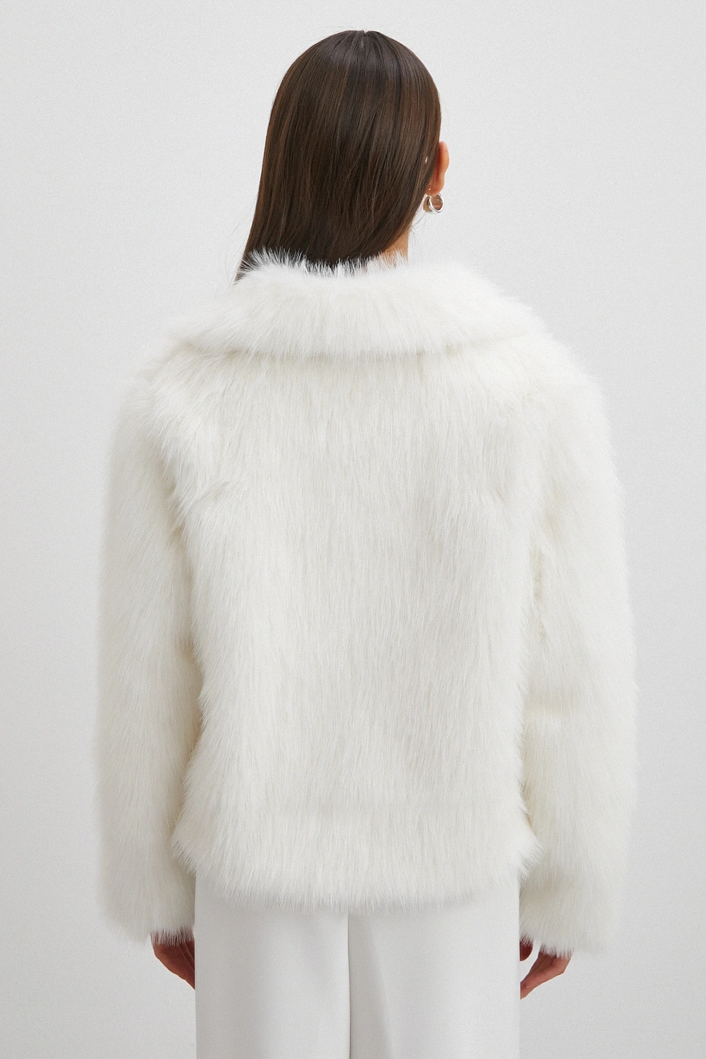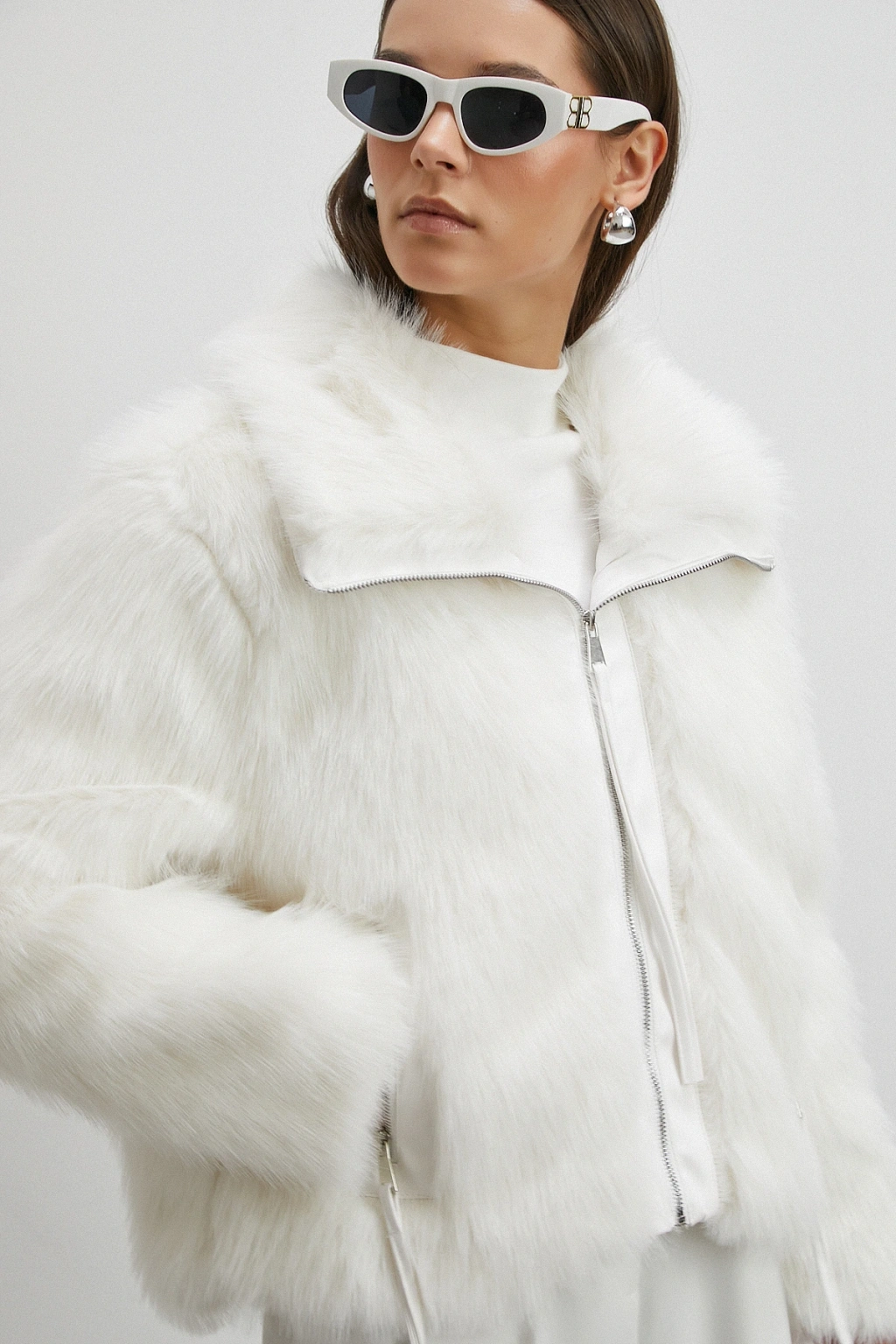 Beyaz Kemer Detaylı Kürklü Kot Mont Mavi