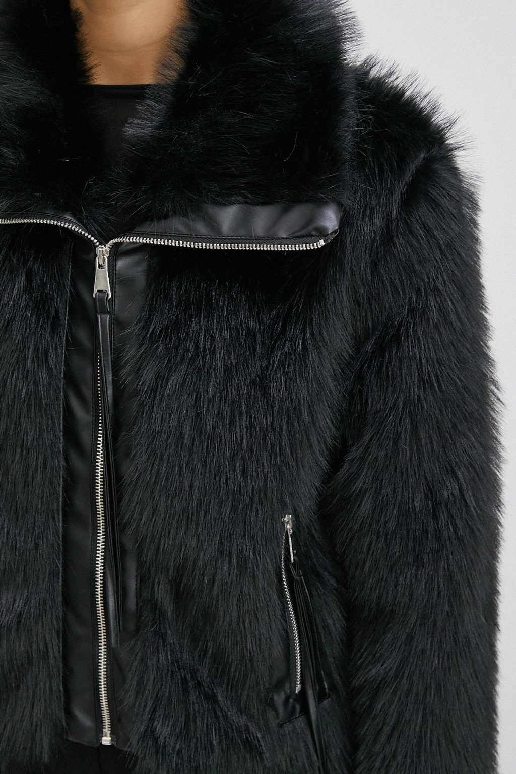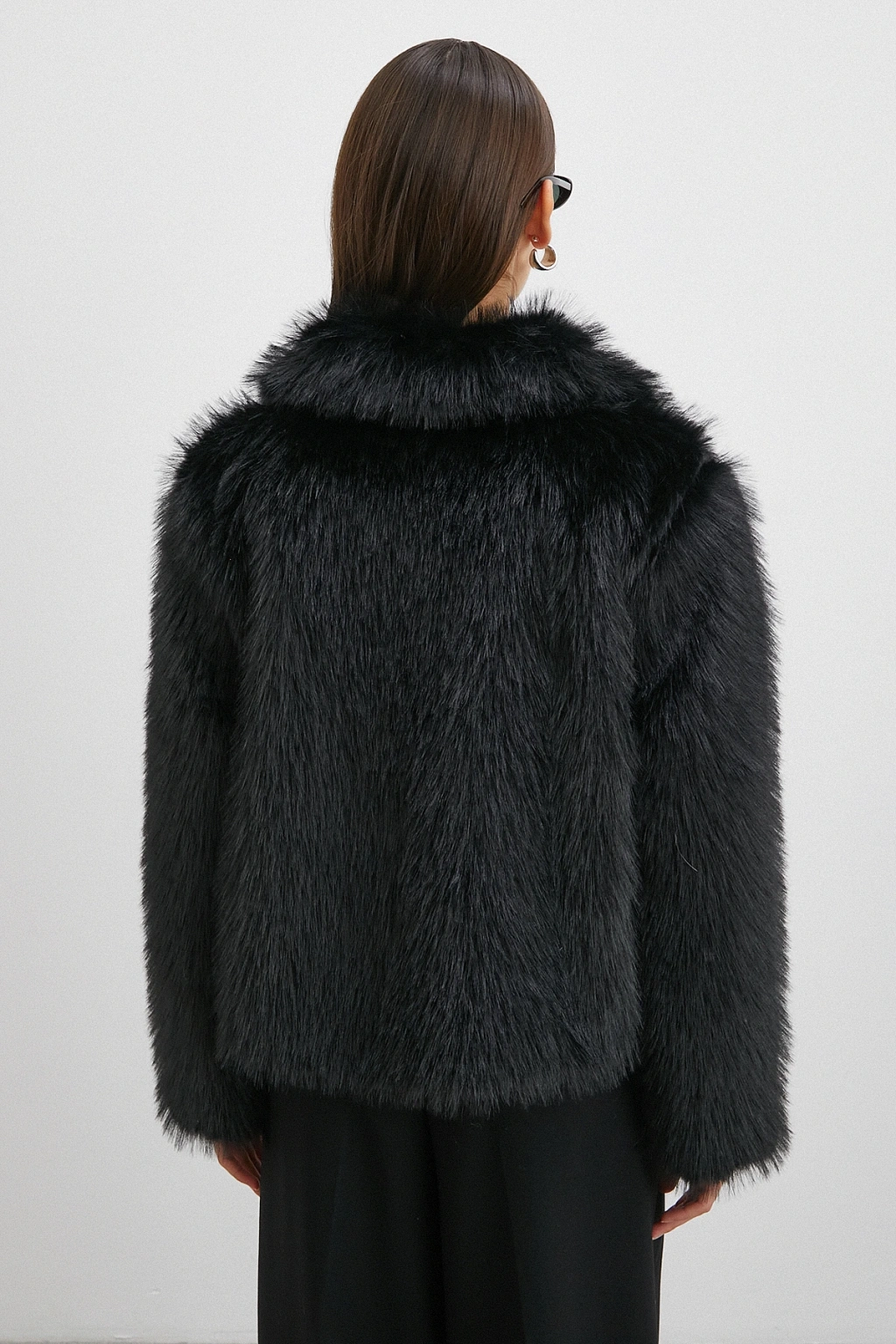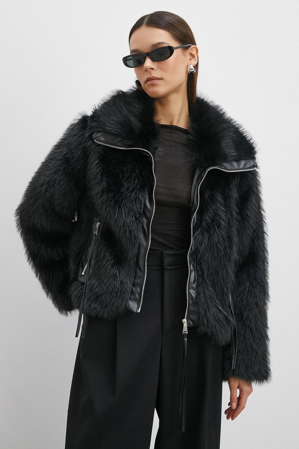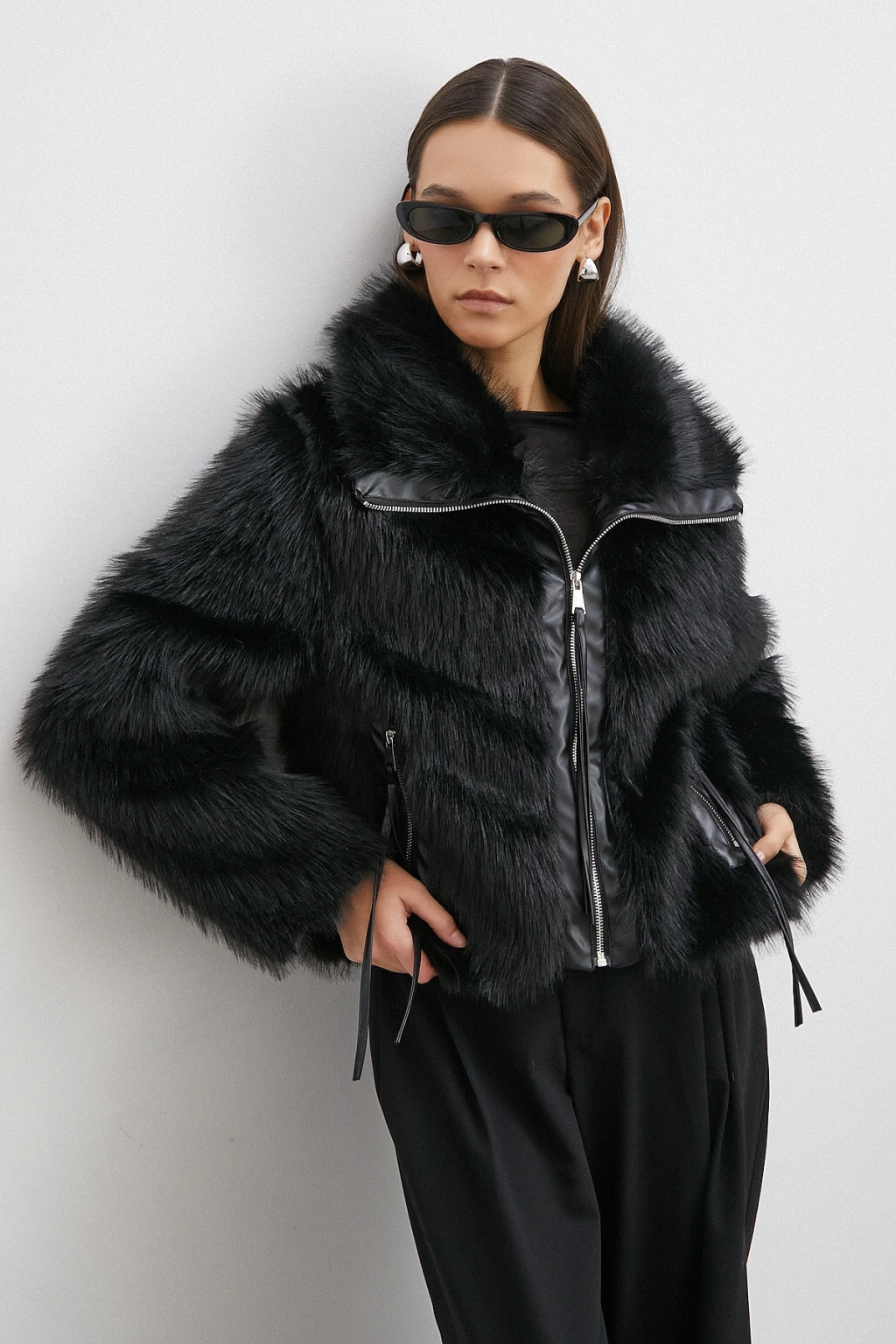 Kürklü Kuşaklı Deri Pardesü Siyah