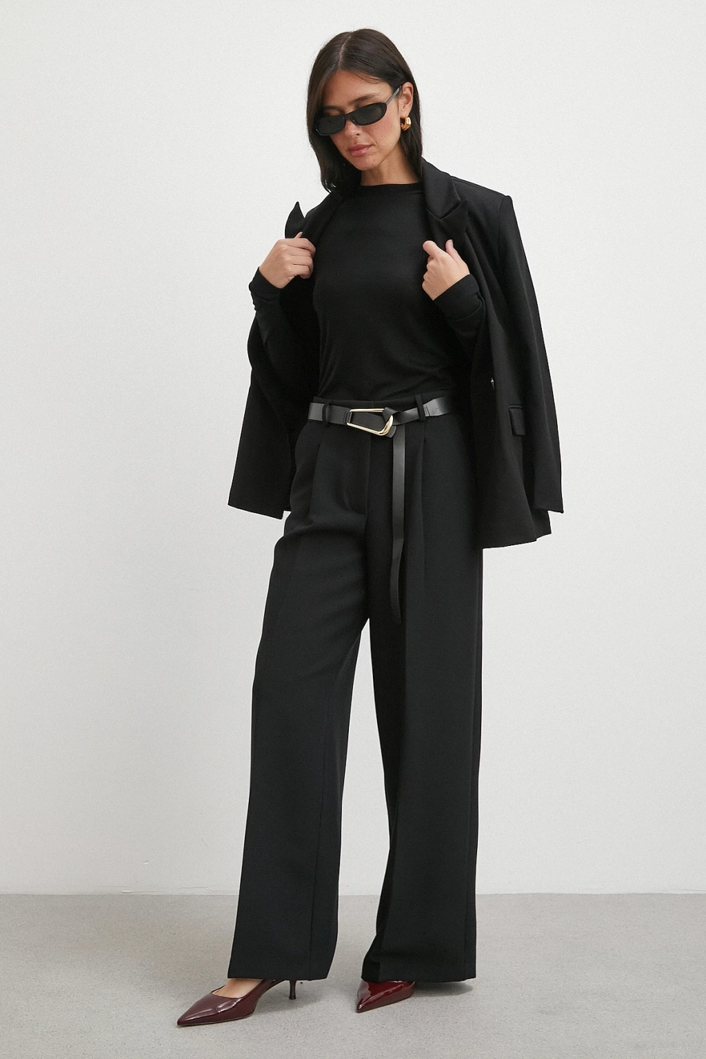 Deri Kemerli Geniş Paça Pantolon Siyah