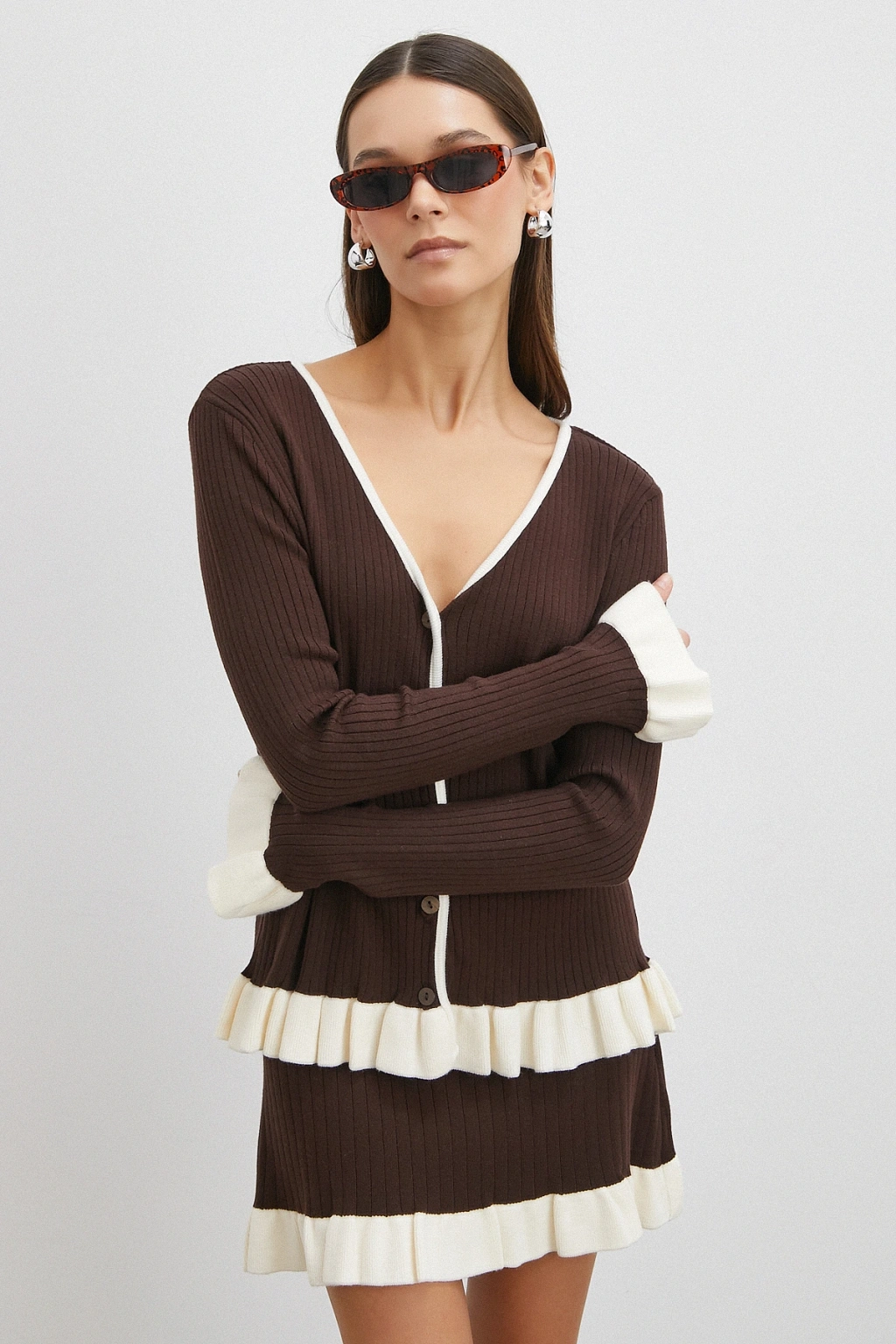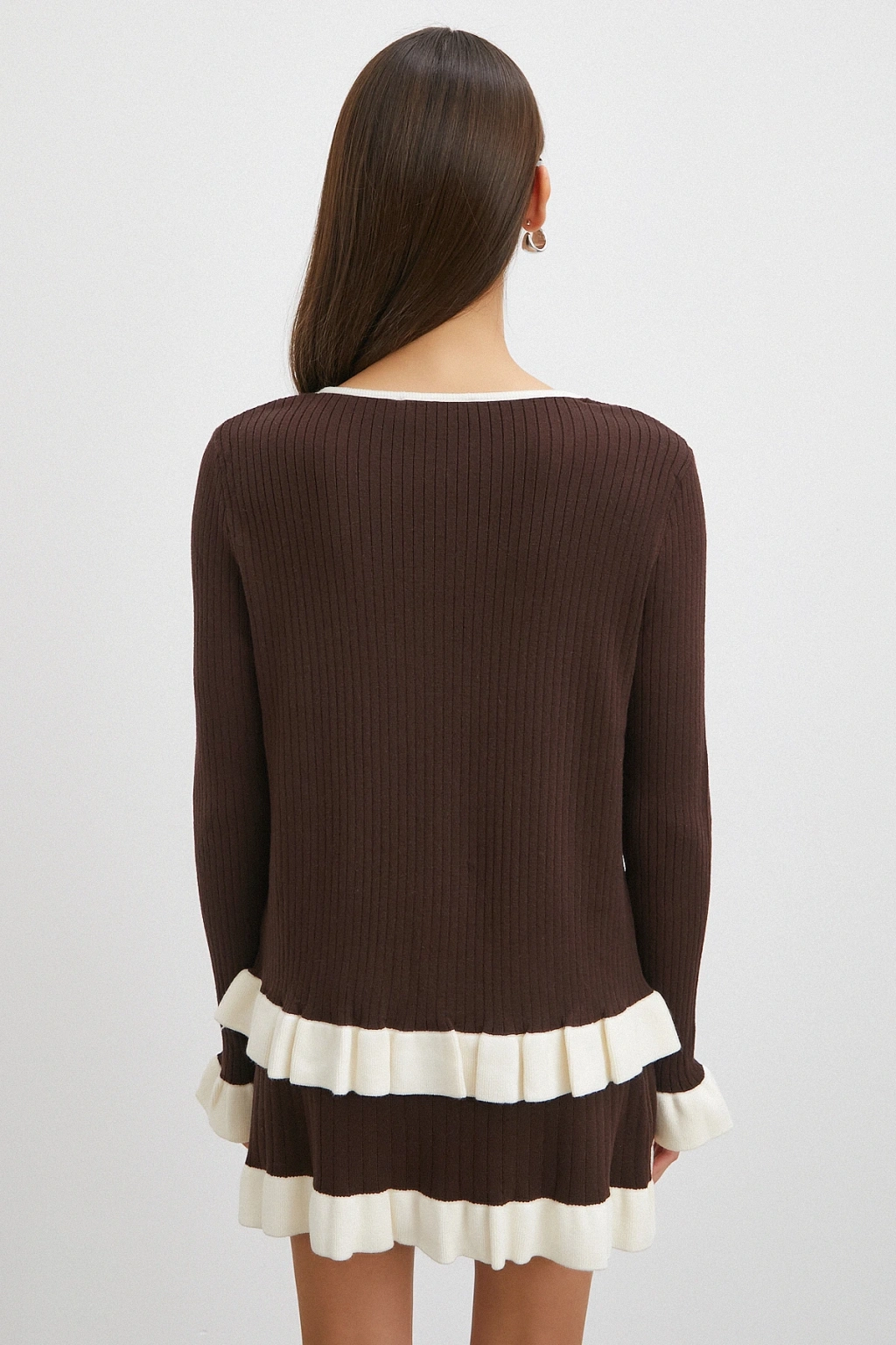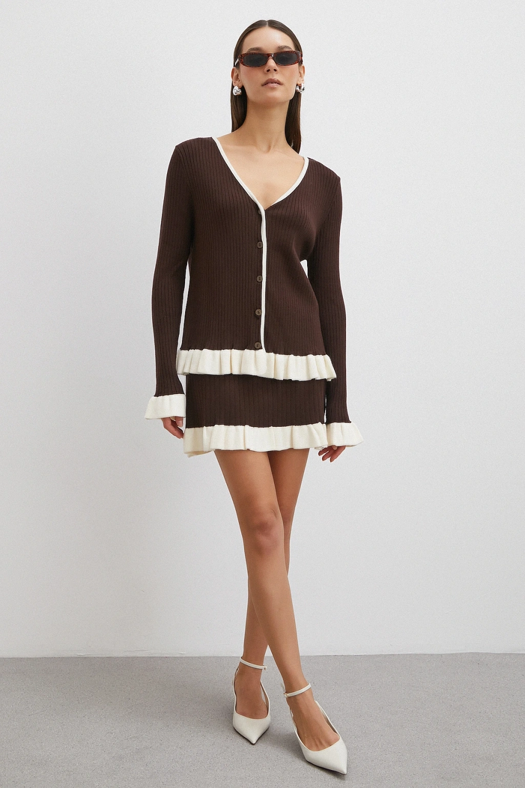 Düğmeli Eteği Fırfırlı Etekli Triko Takım Kahve