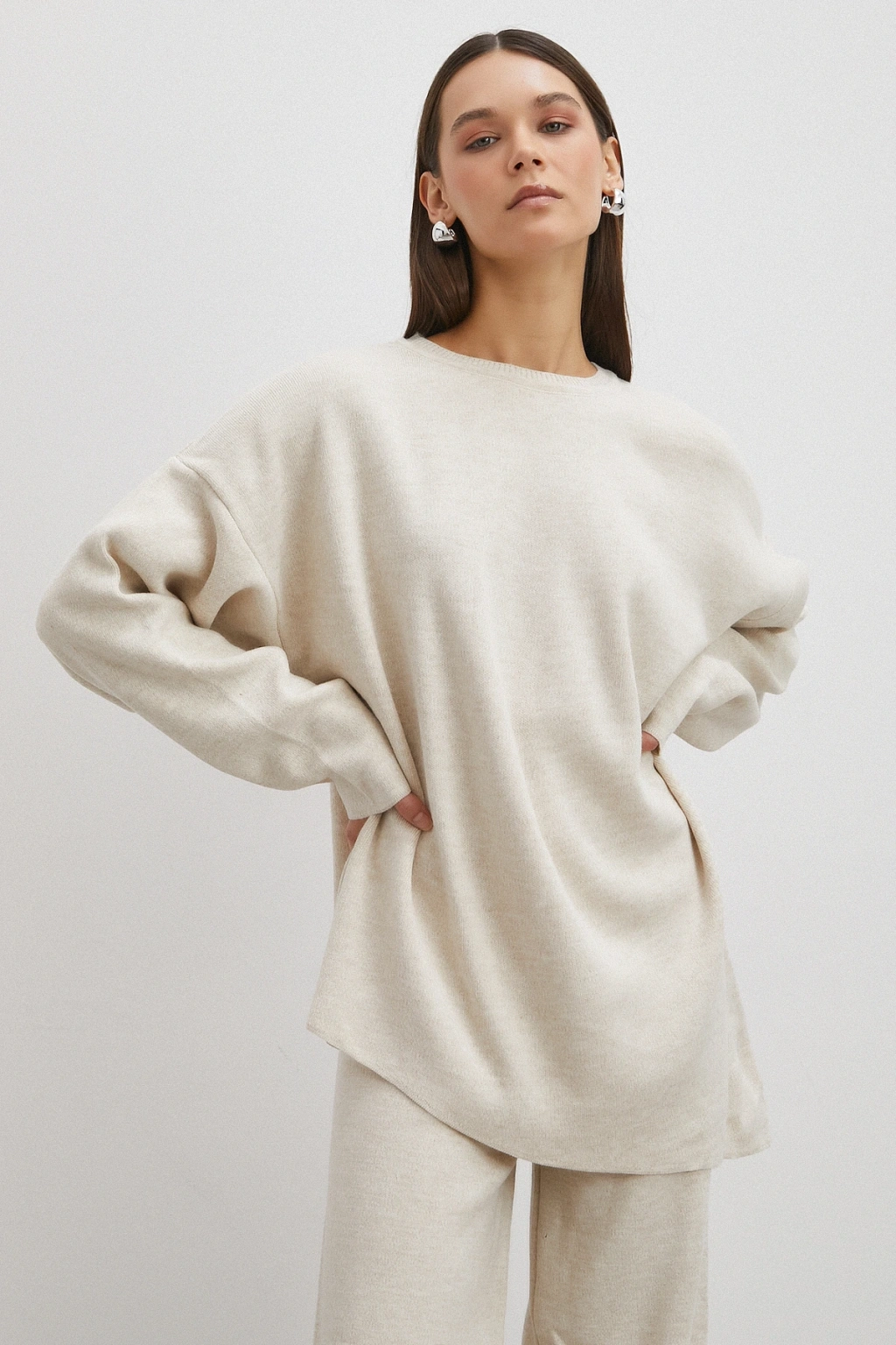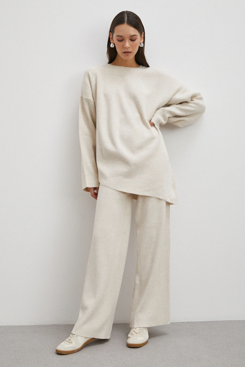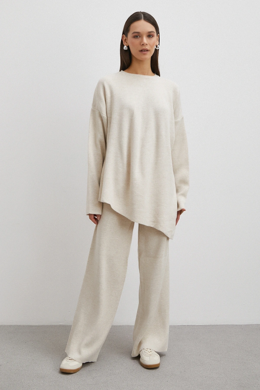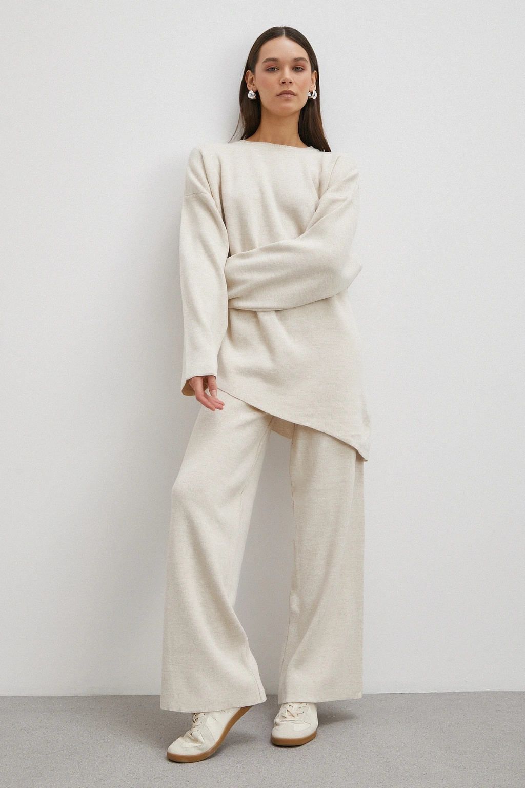 Eteği Çapraz Pantolonlu Bisiklet Yaka Takım Ekru