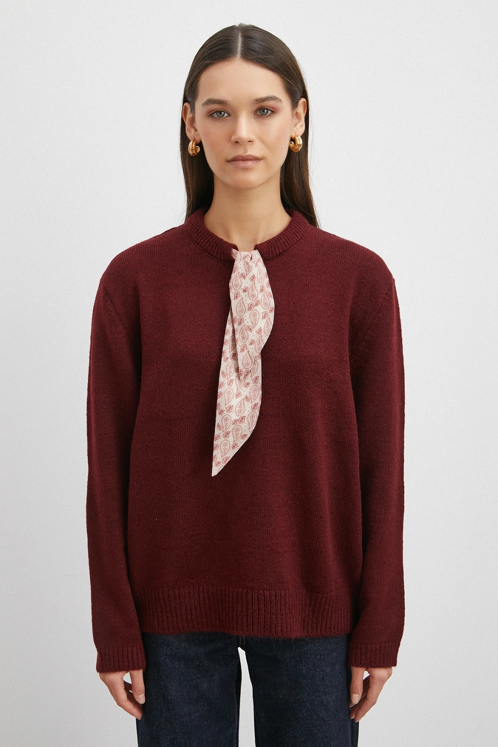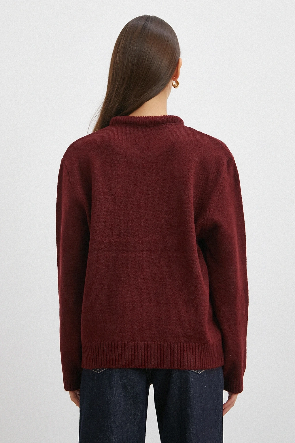Saç Örgülü Yarım Fermuarlı Kazak Bordo