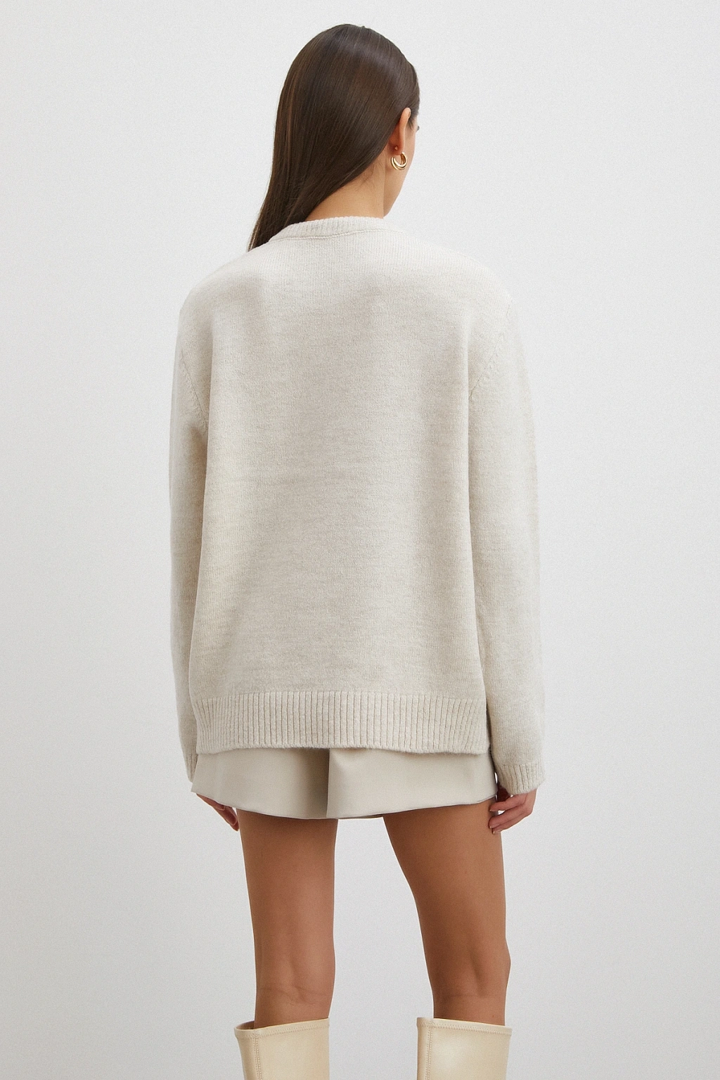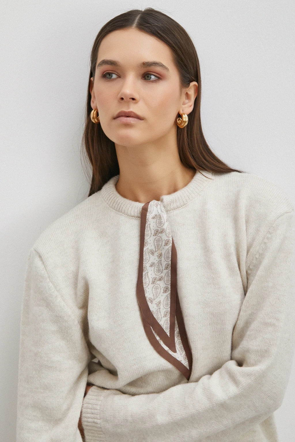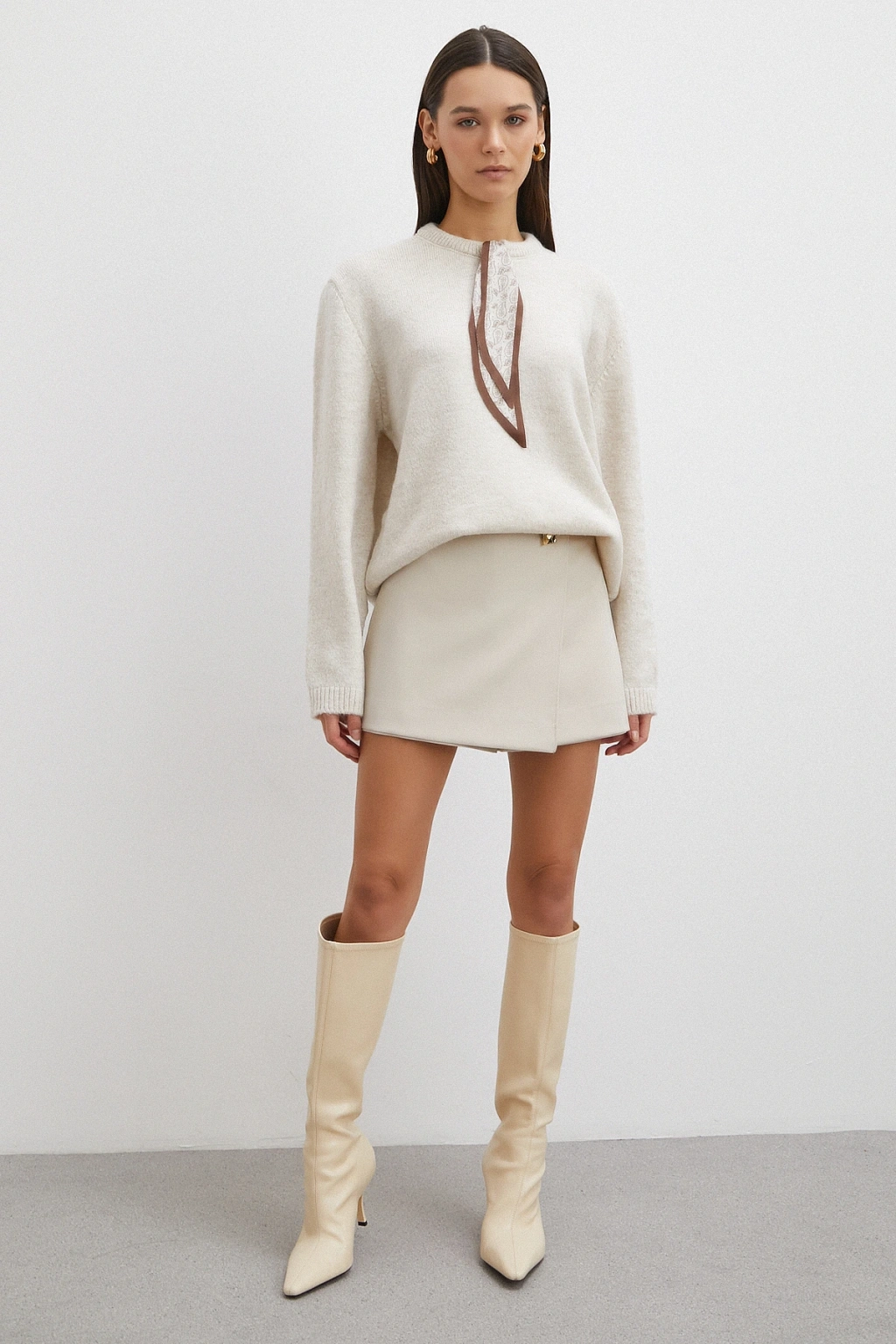 Saç Örgülü Yarım Fermuarlı Kazak Ekru