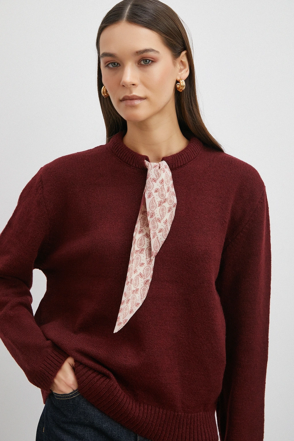 Saç Örgülü Yarım Fermuarlı Kazak Bordo