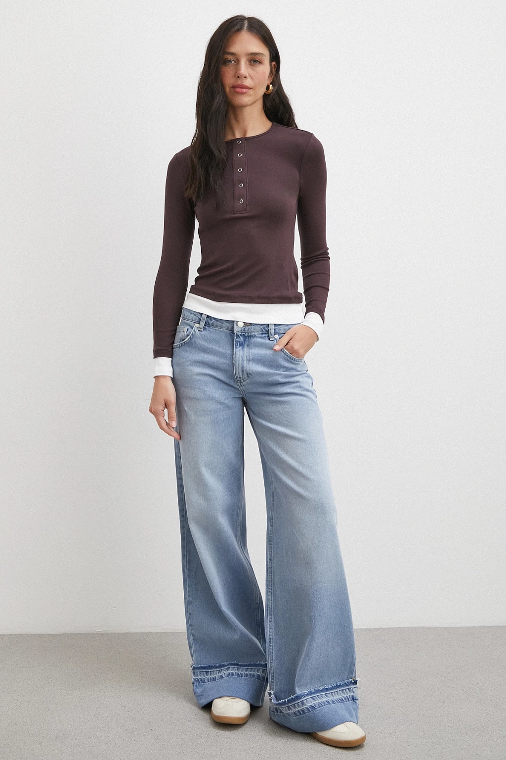 Düğmeli Uzun Kol Bluz Kahve