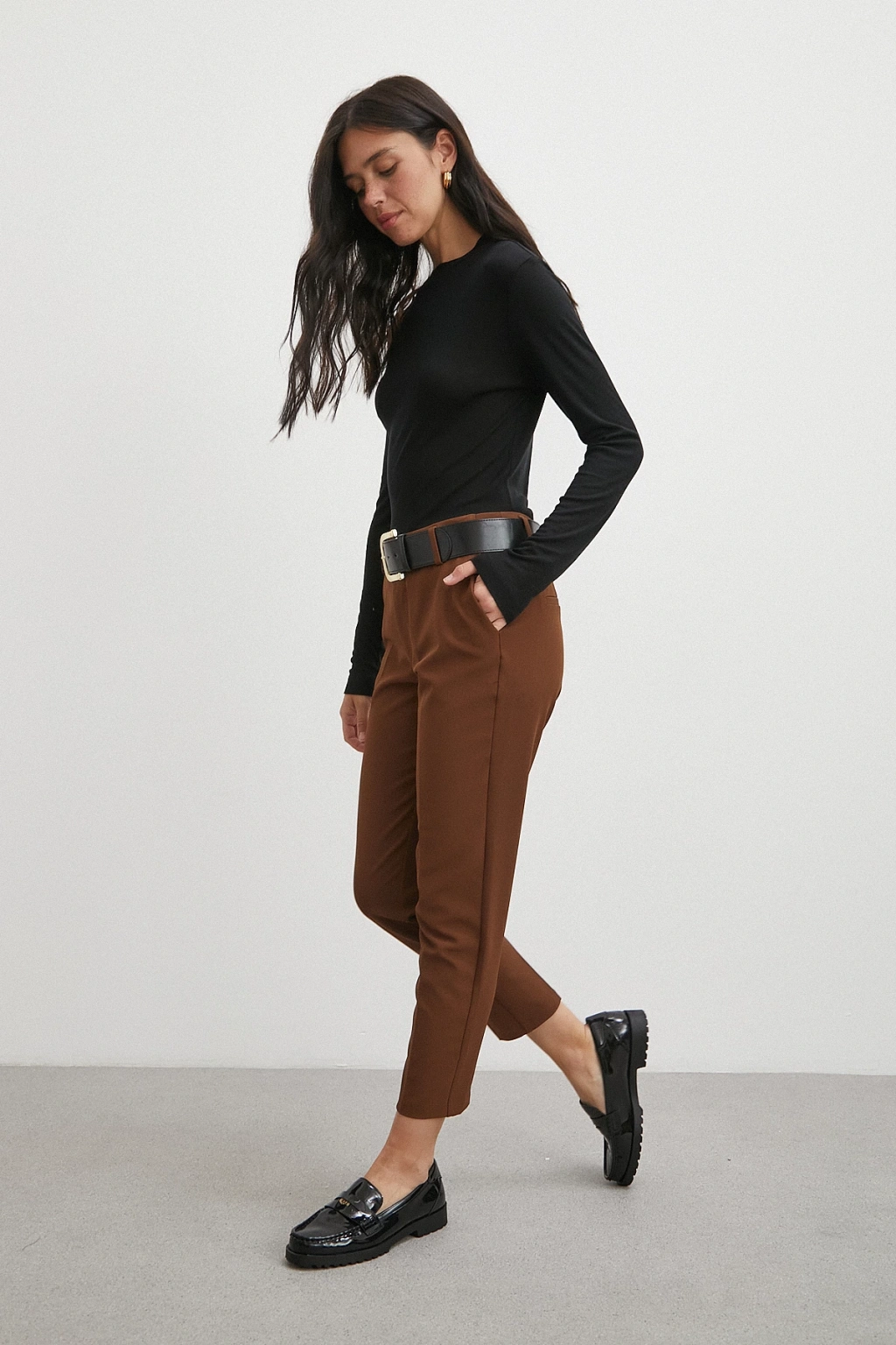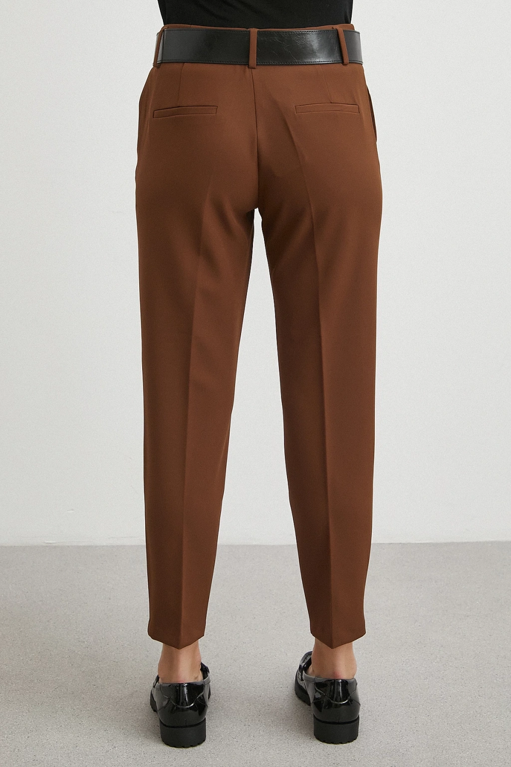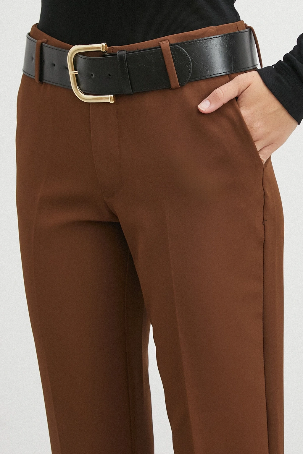 Yüksek Bel Paça Detaylı Kemerli Pantolon Kahve