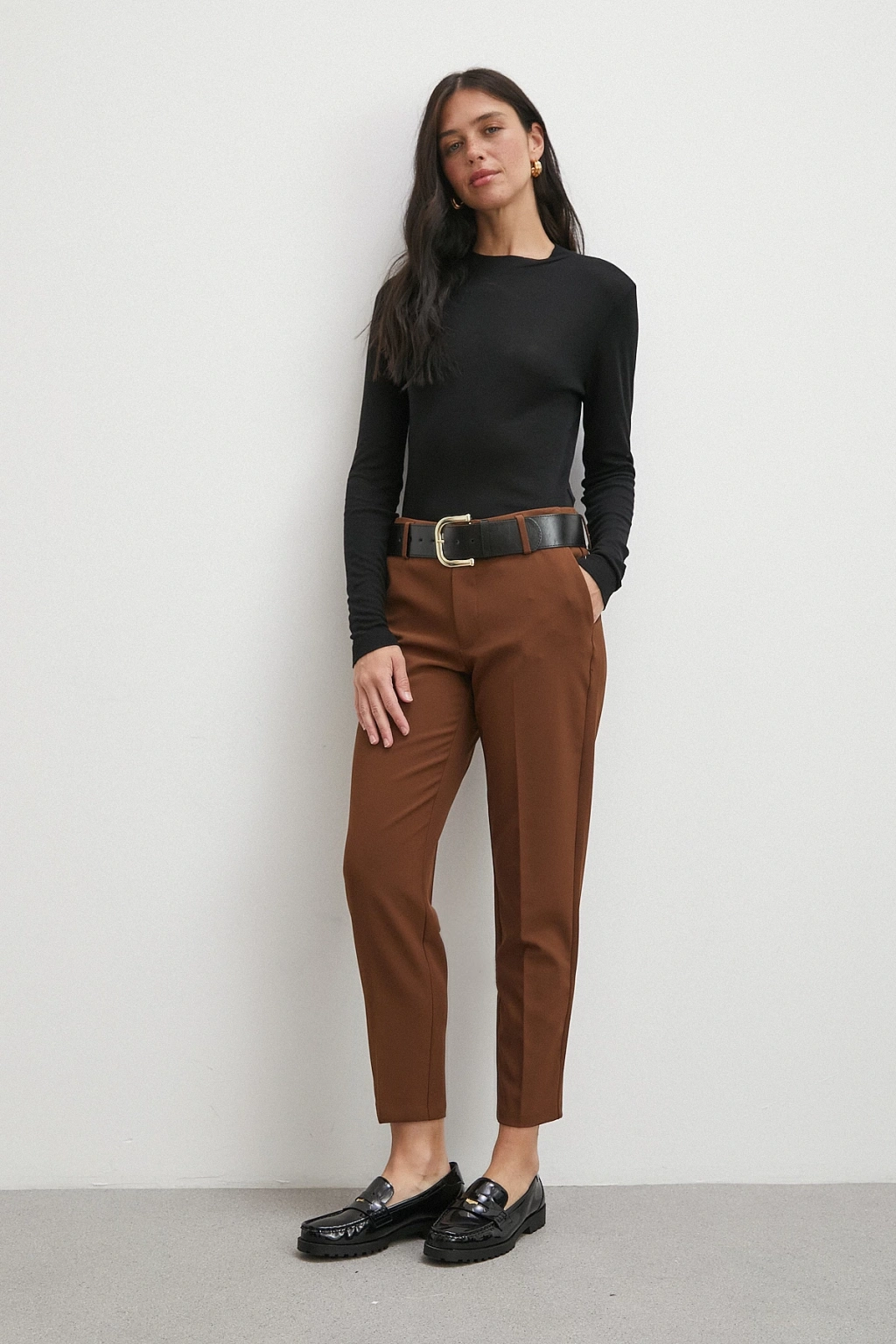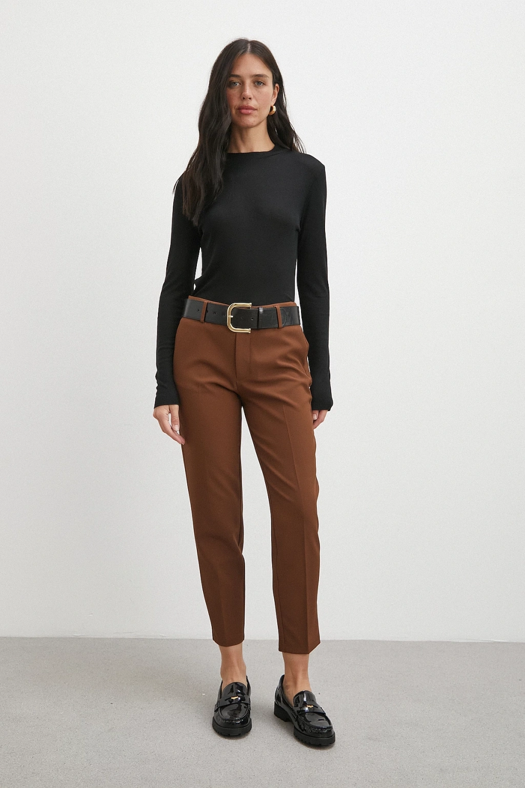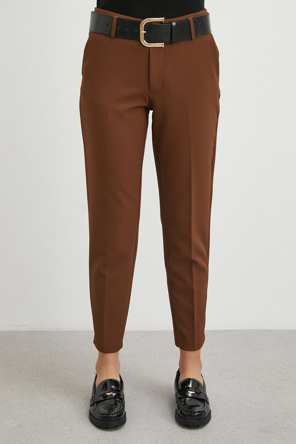 Yüksek Bel Paça Detaylı Kemerli Pantolon Kahve