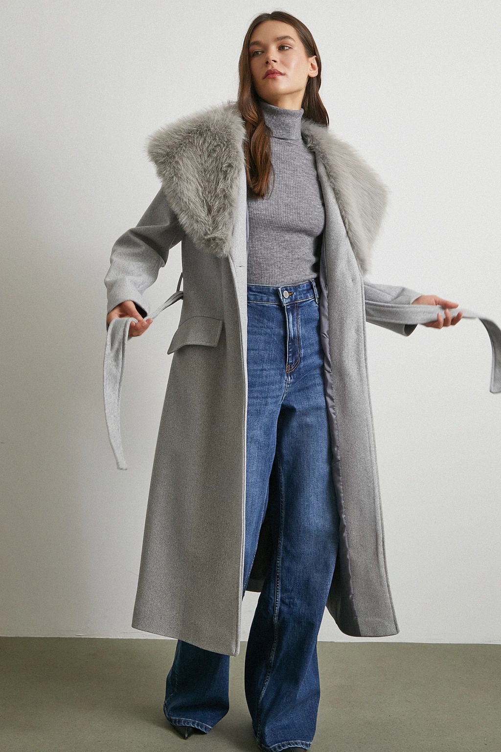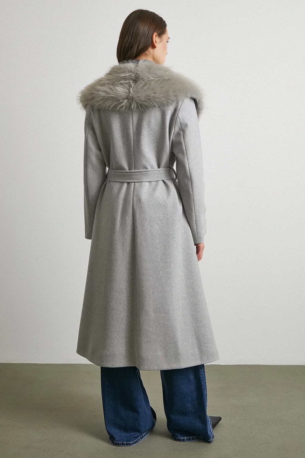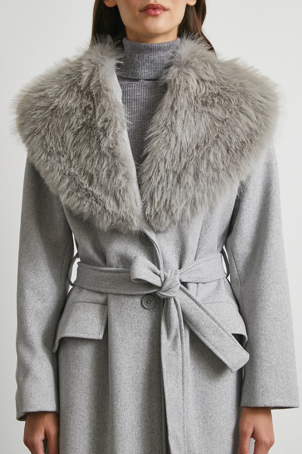 Kürk Yaka Kuşaklı Kaşe Kaban Gri