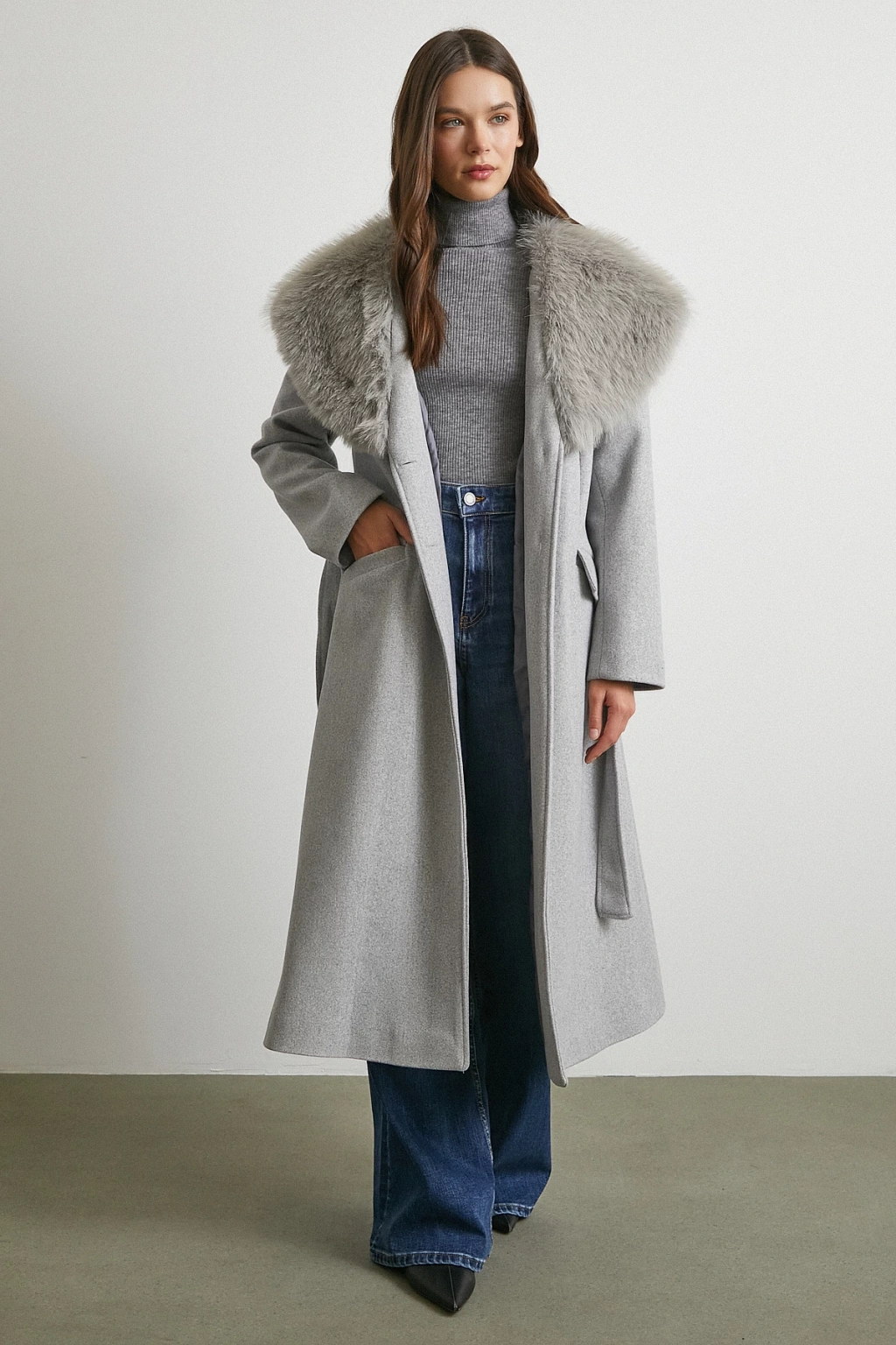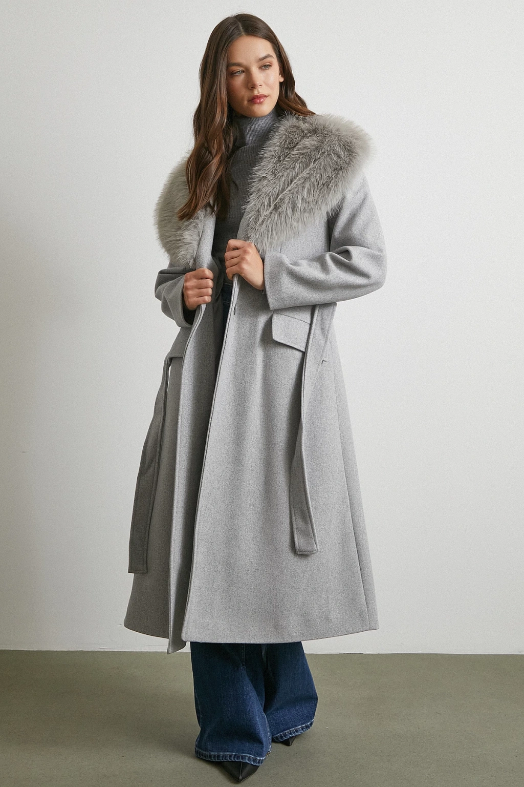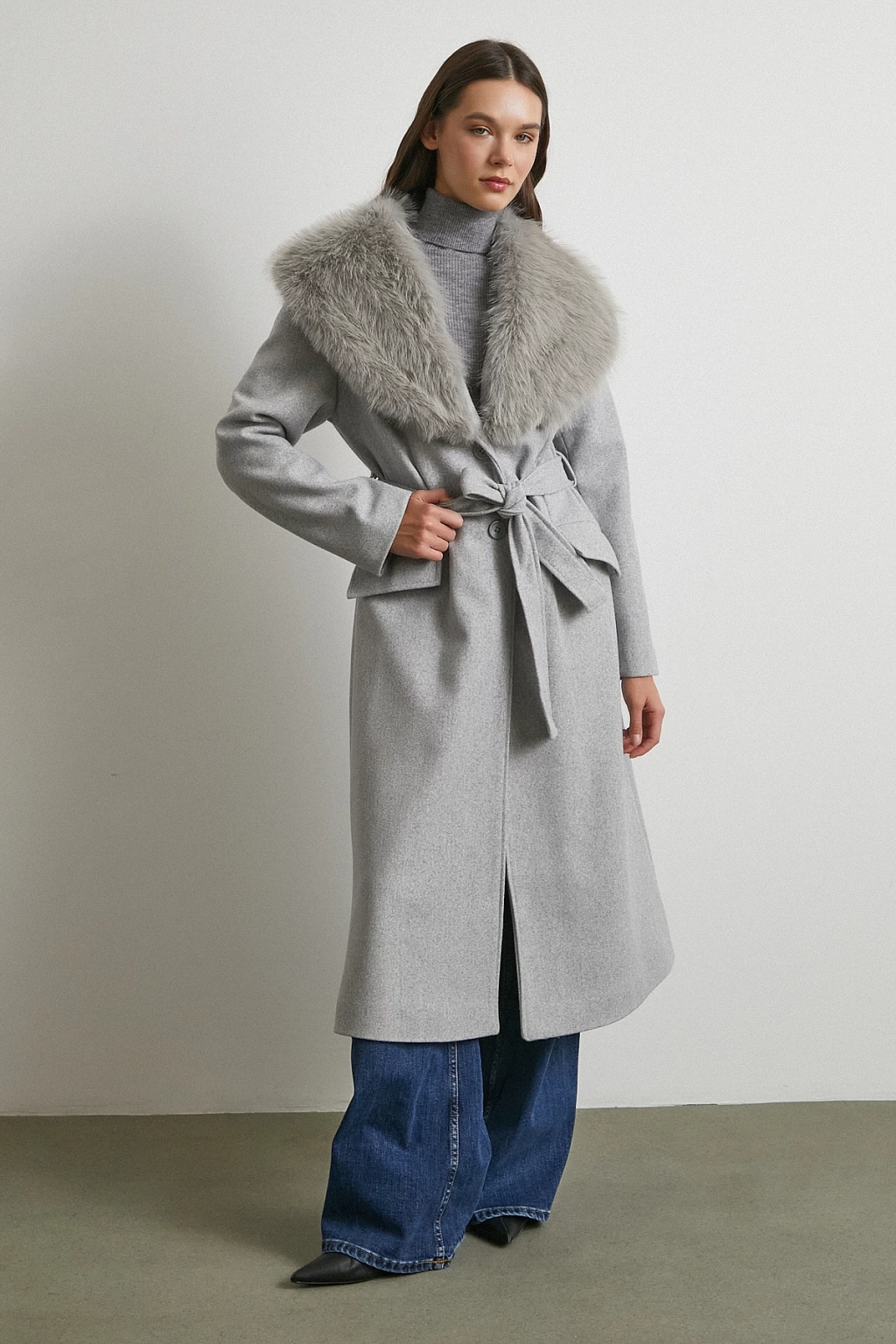 Kürk Yaka Kuşaklı Kaşe Kaban Gri