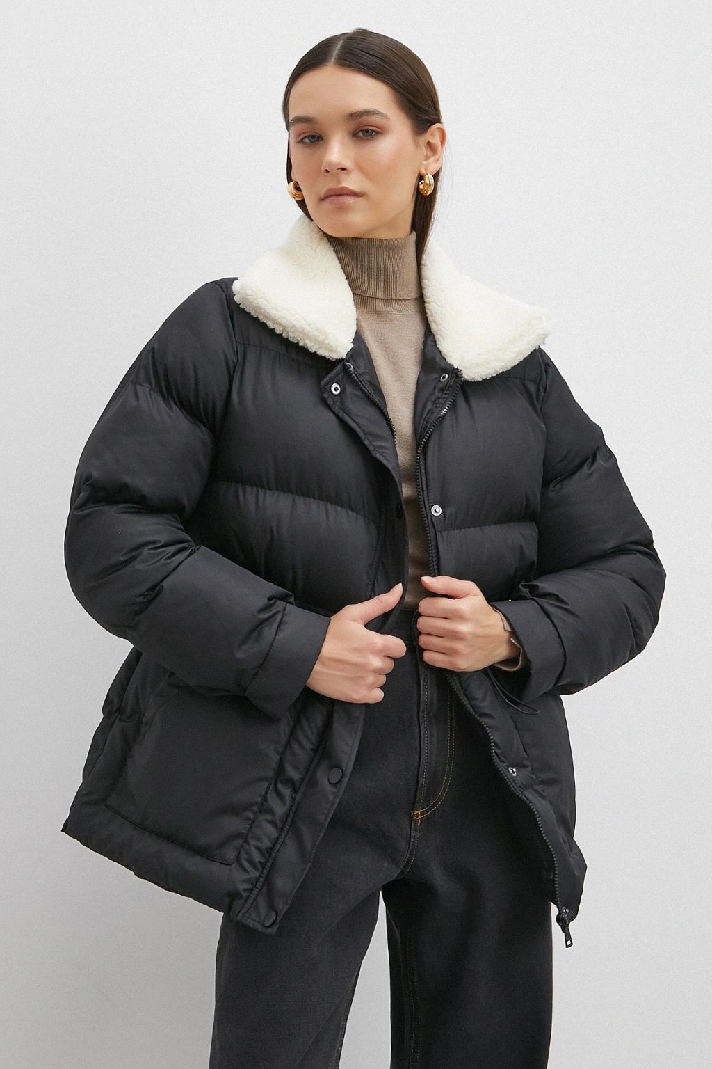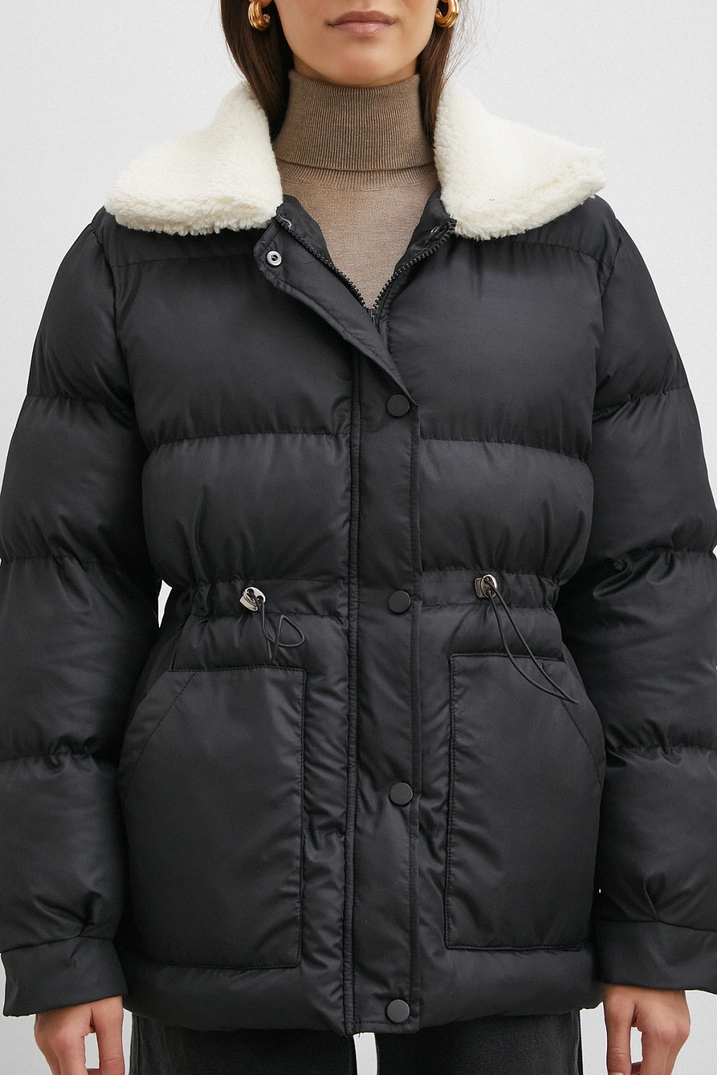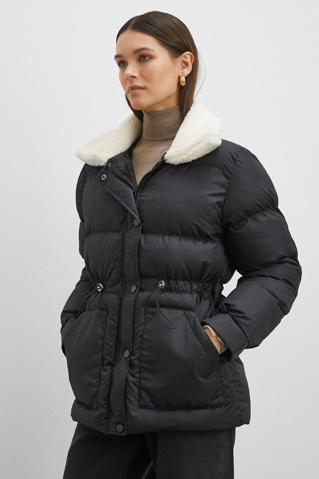 Kürklü Kuşaklı Deri Pardesü Siyah