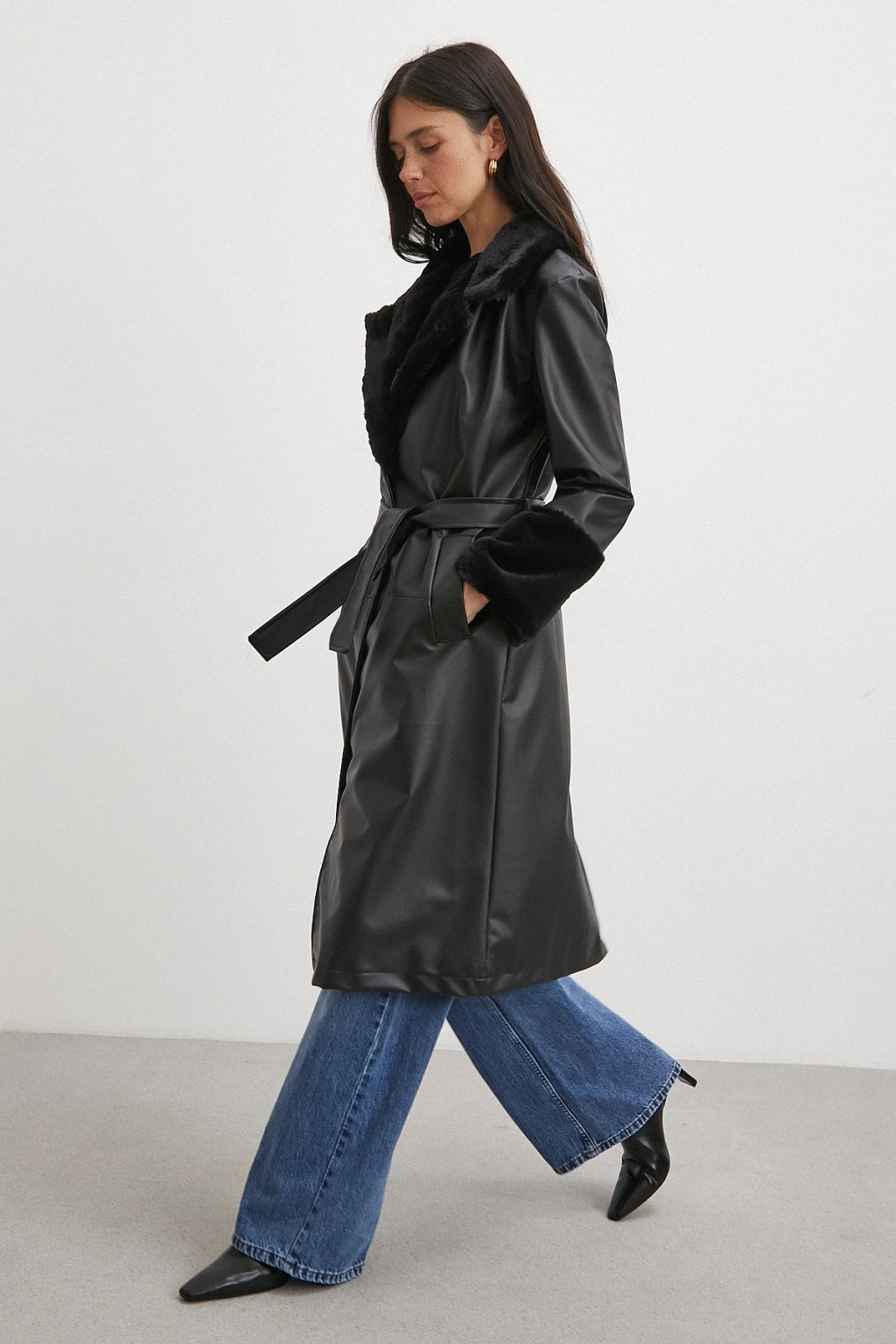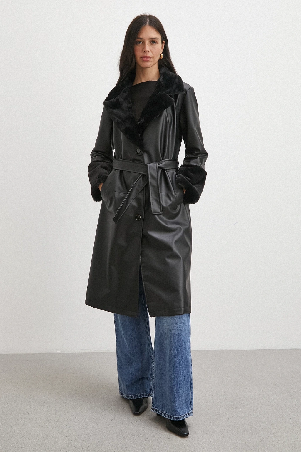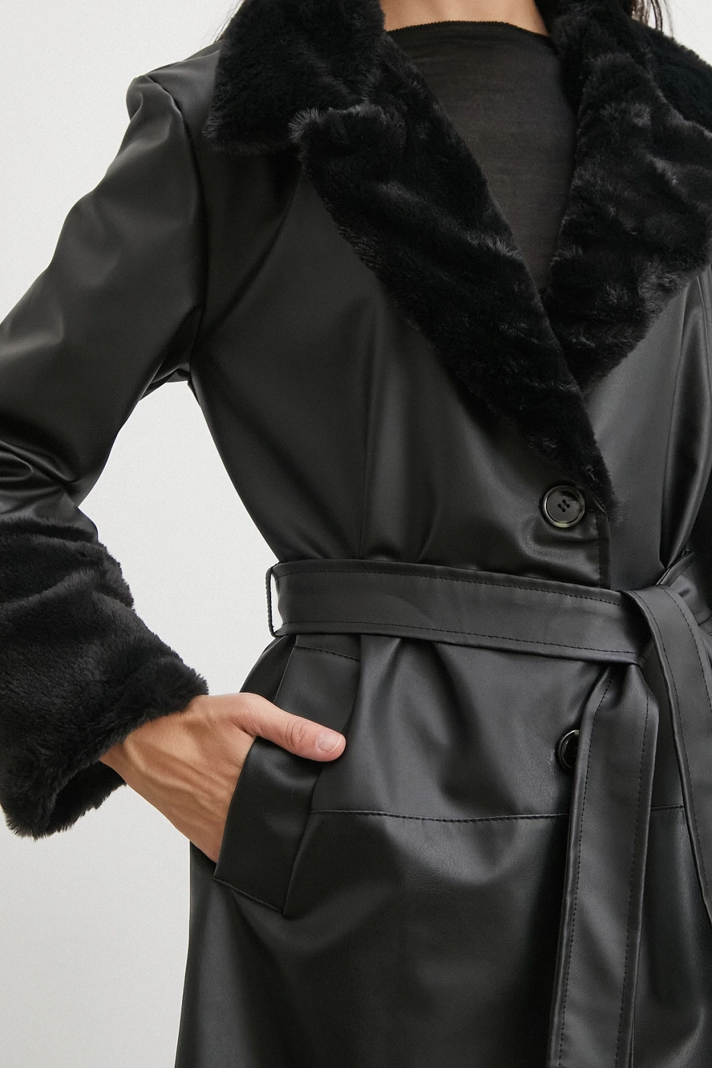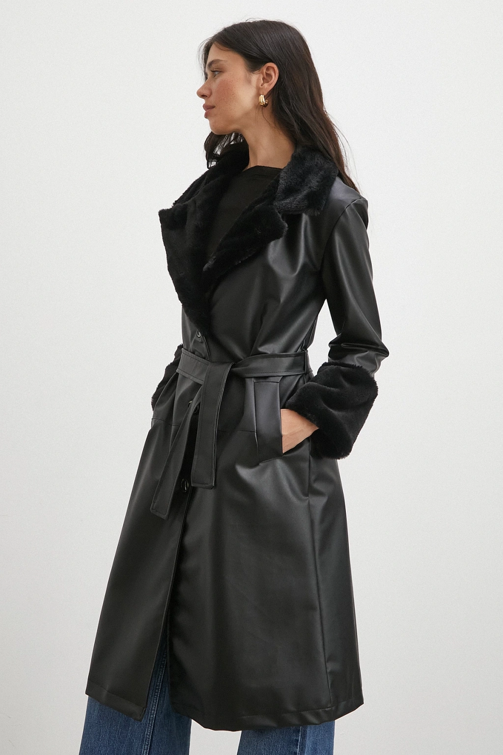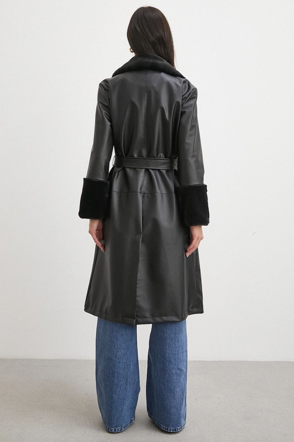 Kürklü Kuşaklı Deri Pardesü Siyah