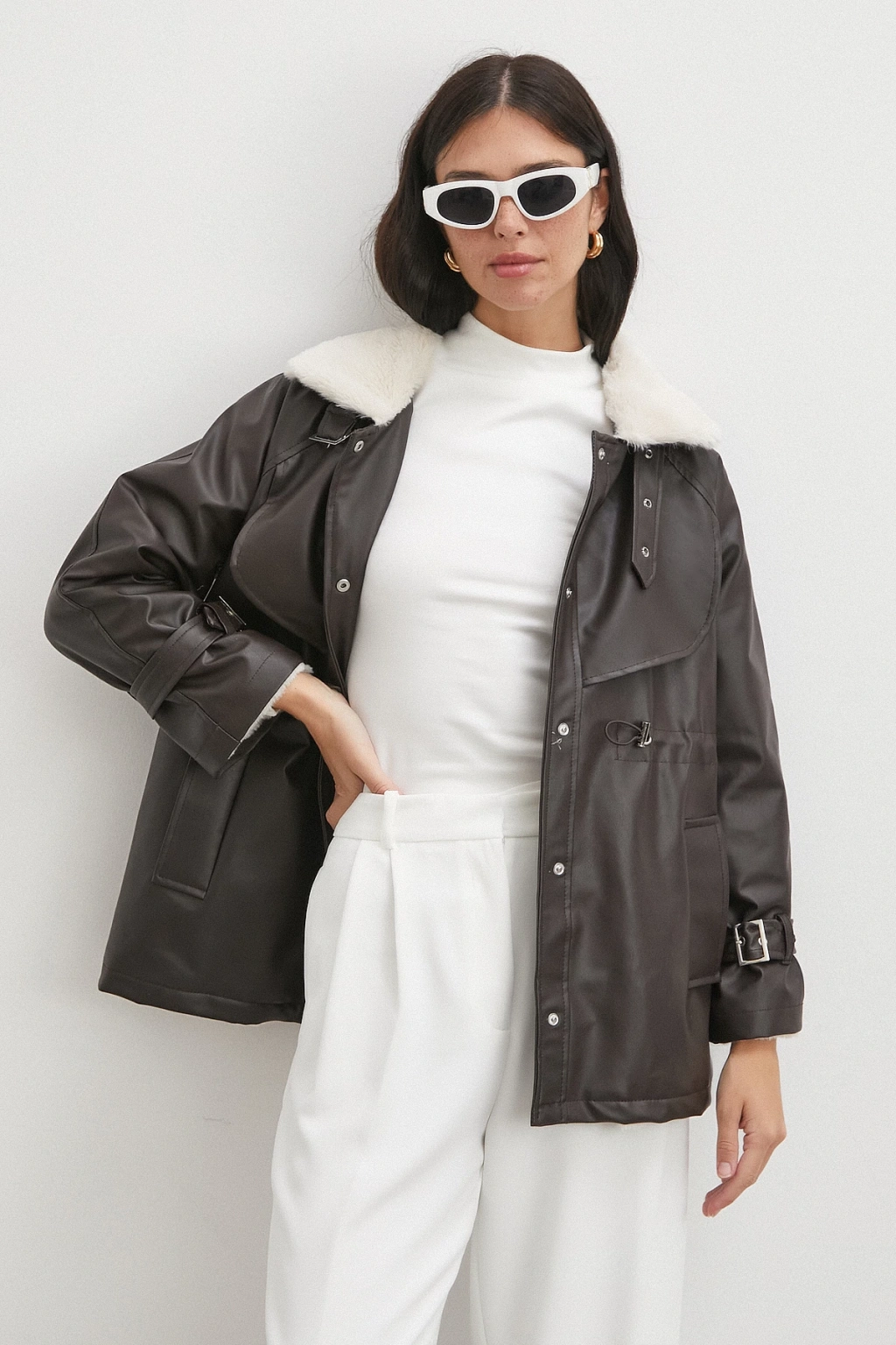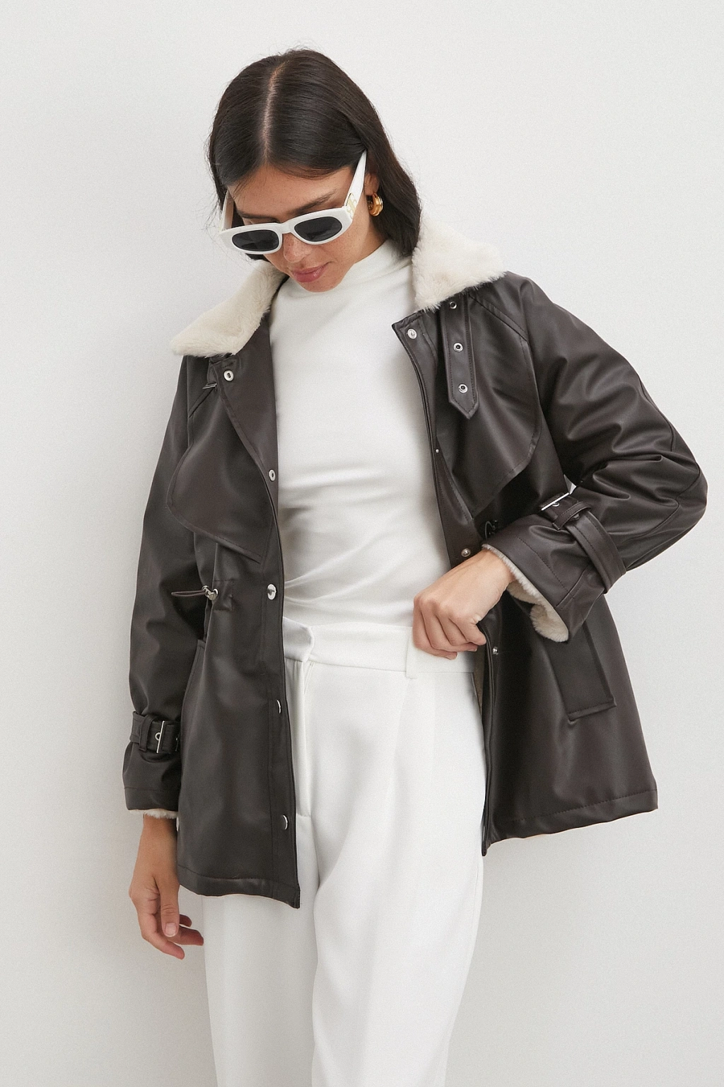 Kürklü Yaka Detaylı Deri Ceket Kahve