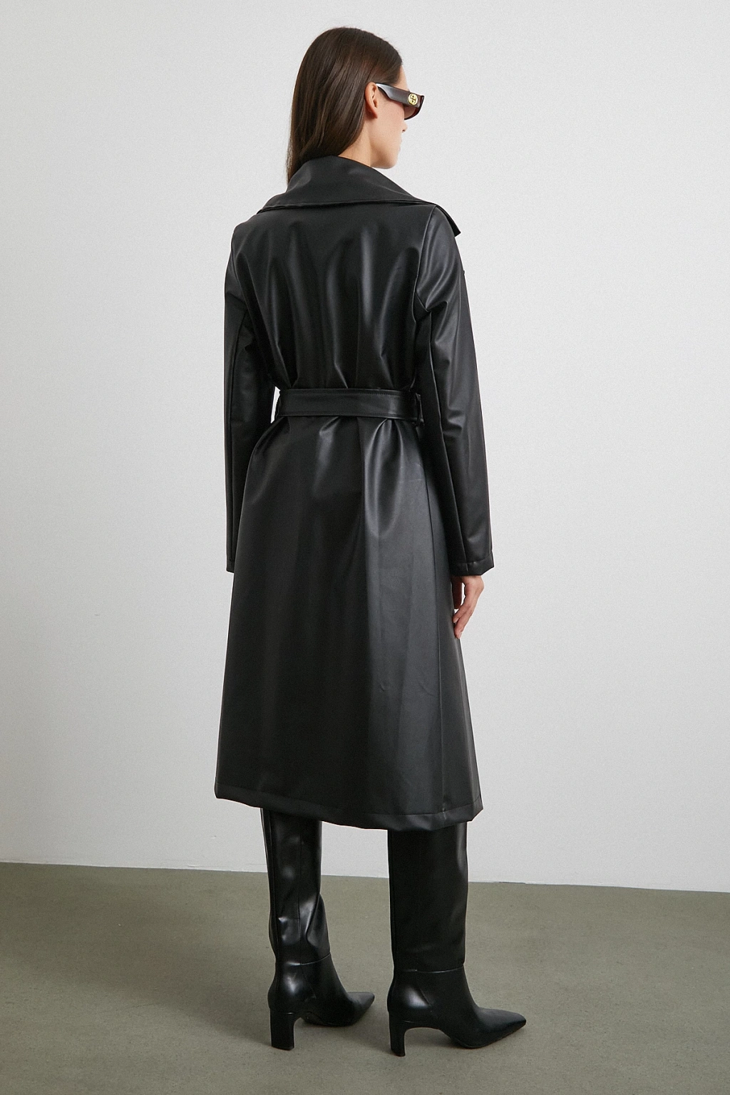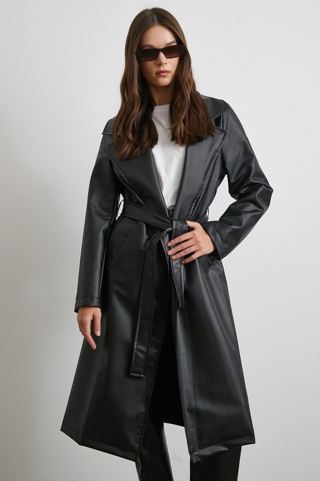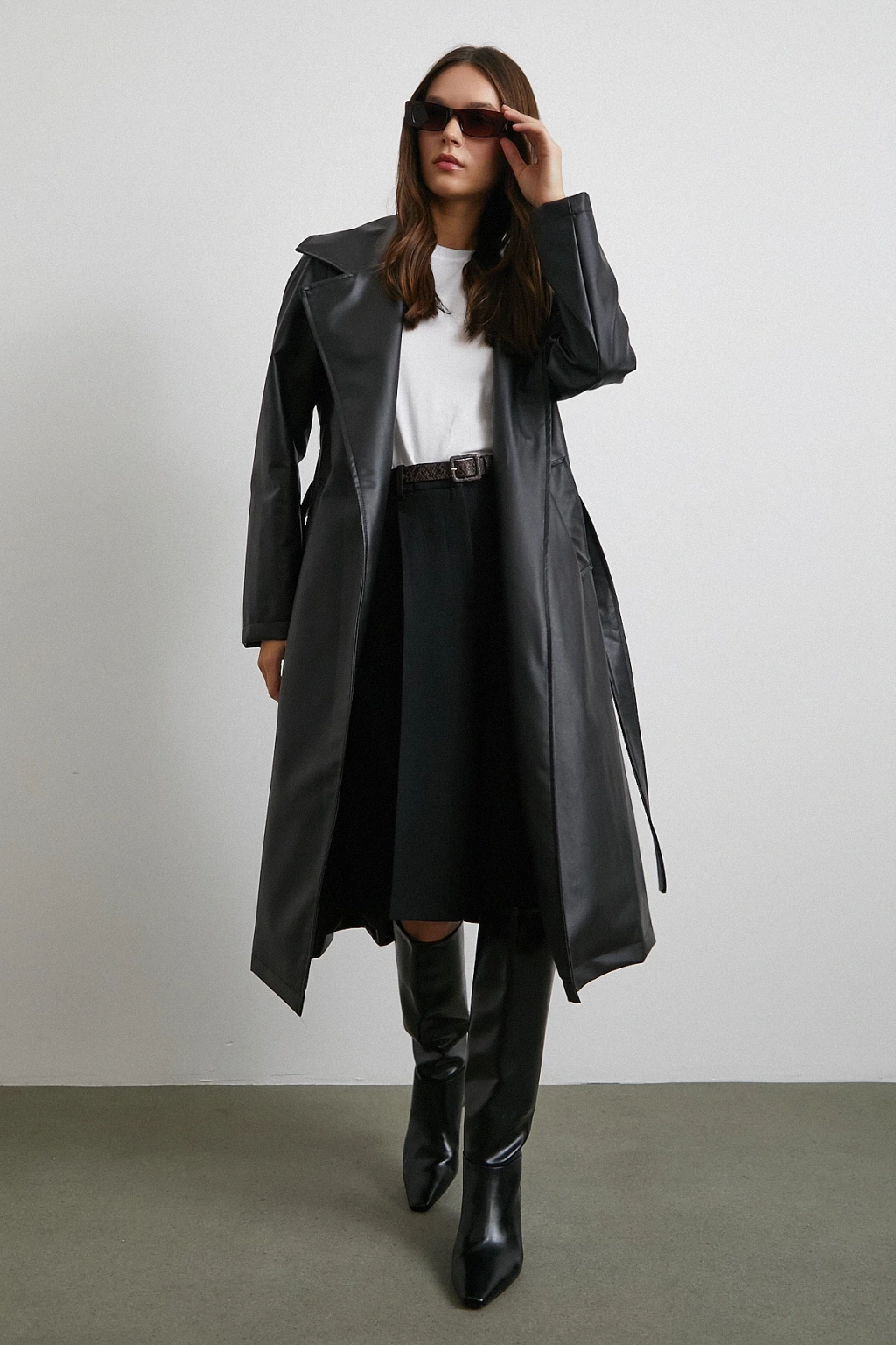 Kuşaklı Deri Pardesü Siyah