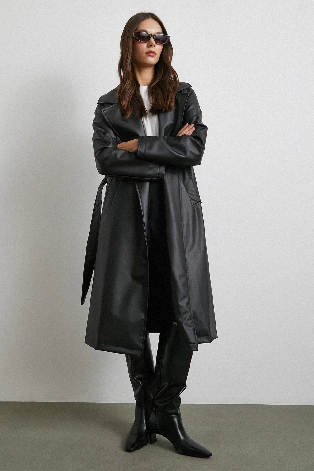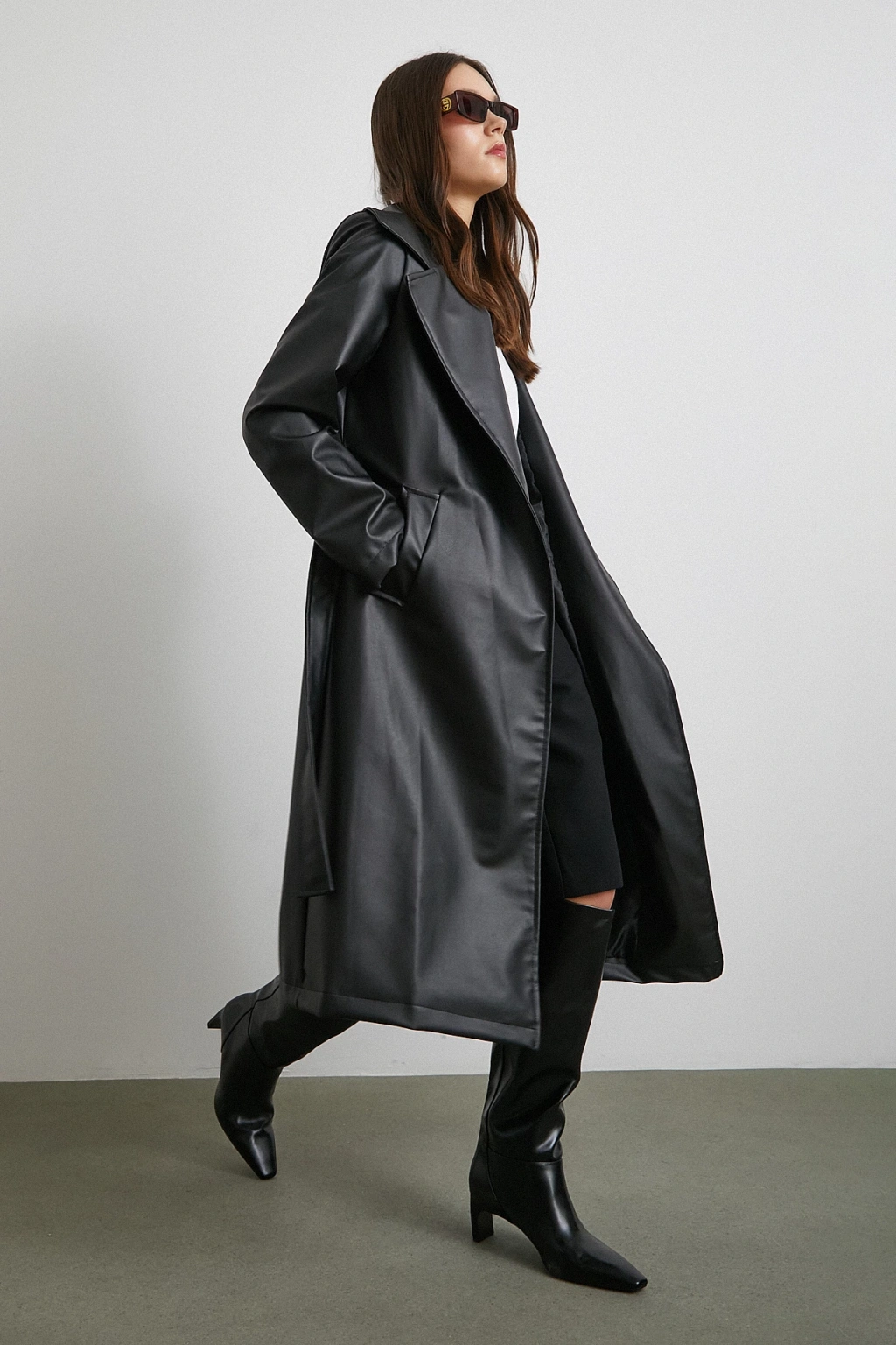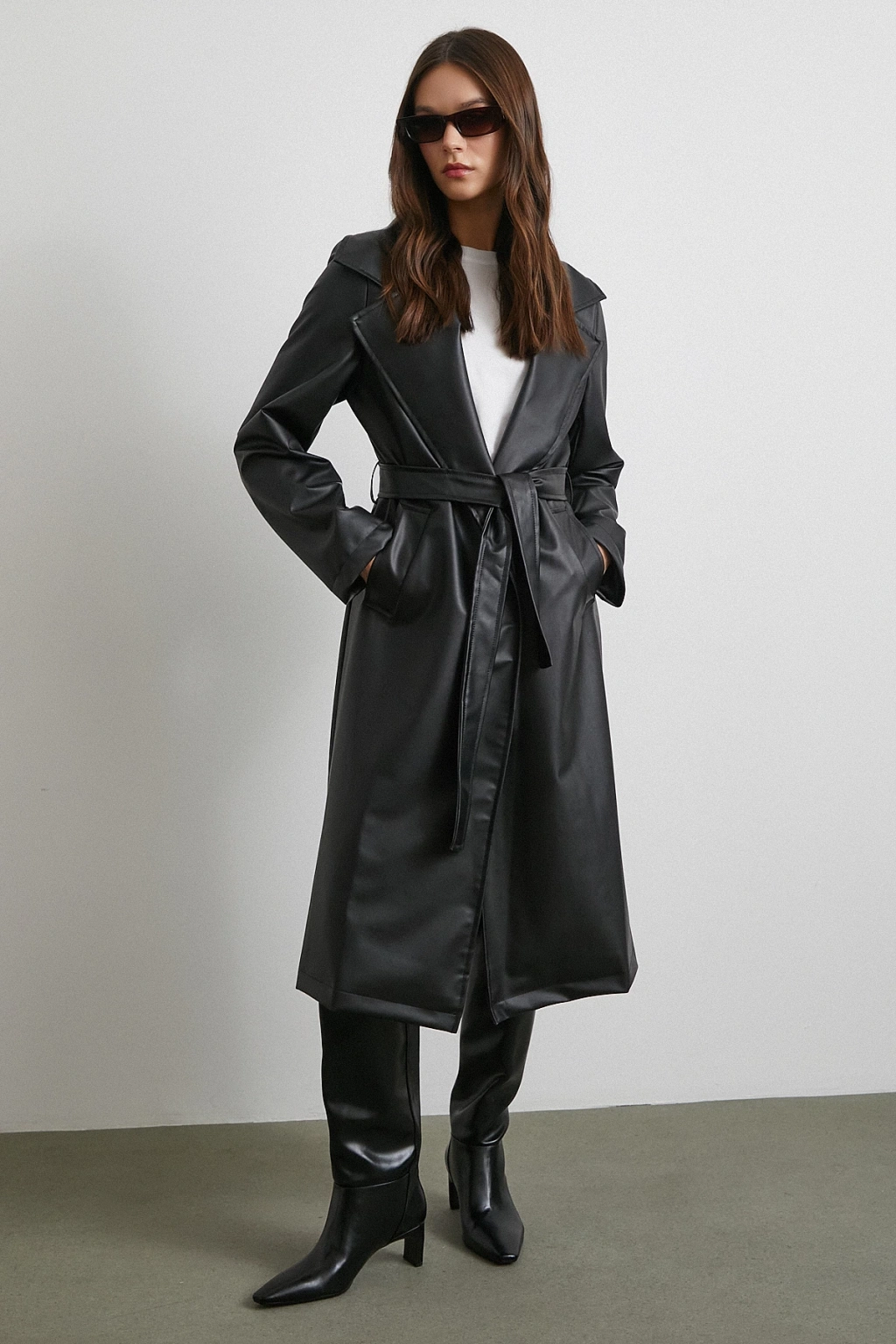 Kuşaklı Deri Pardesü Siyah