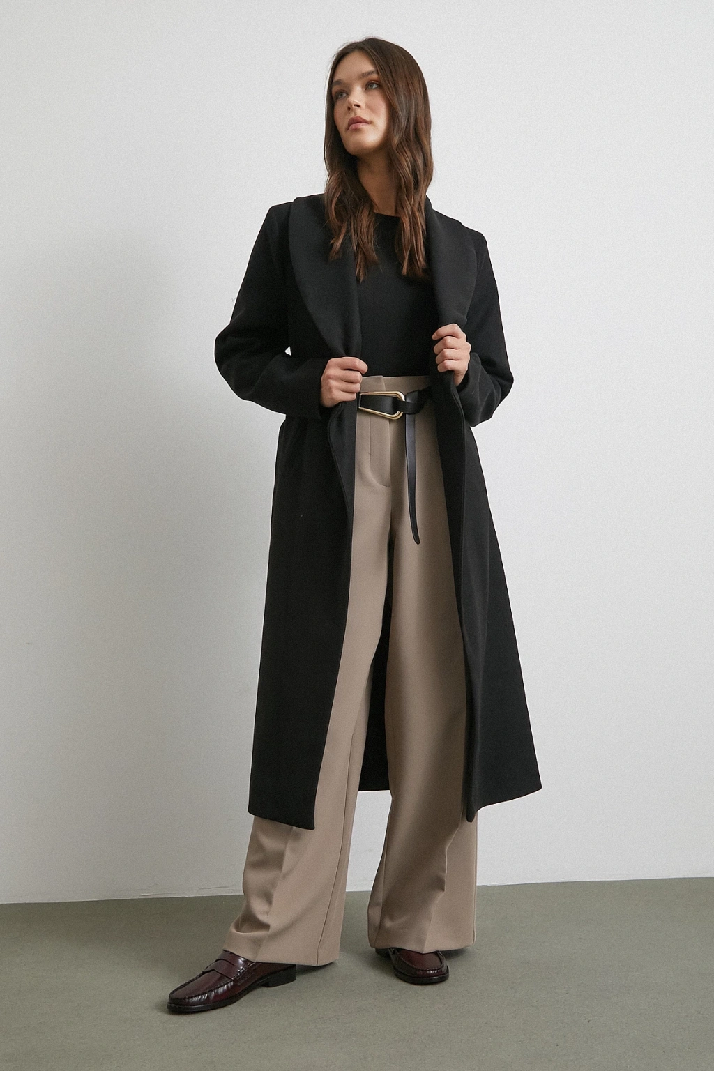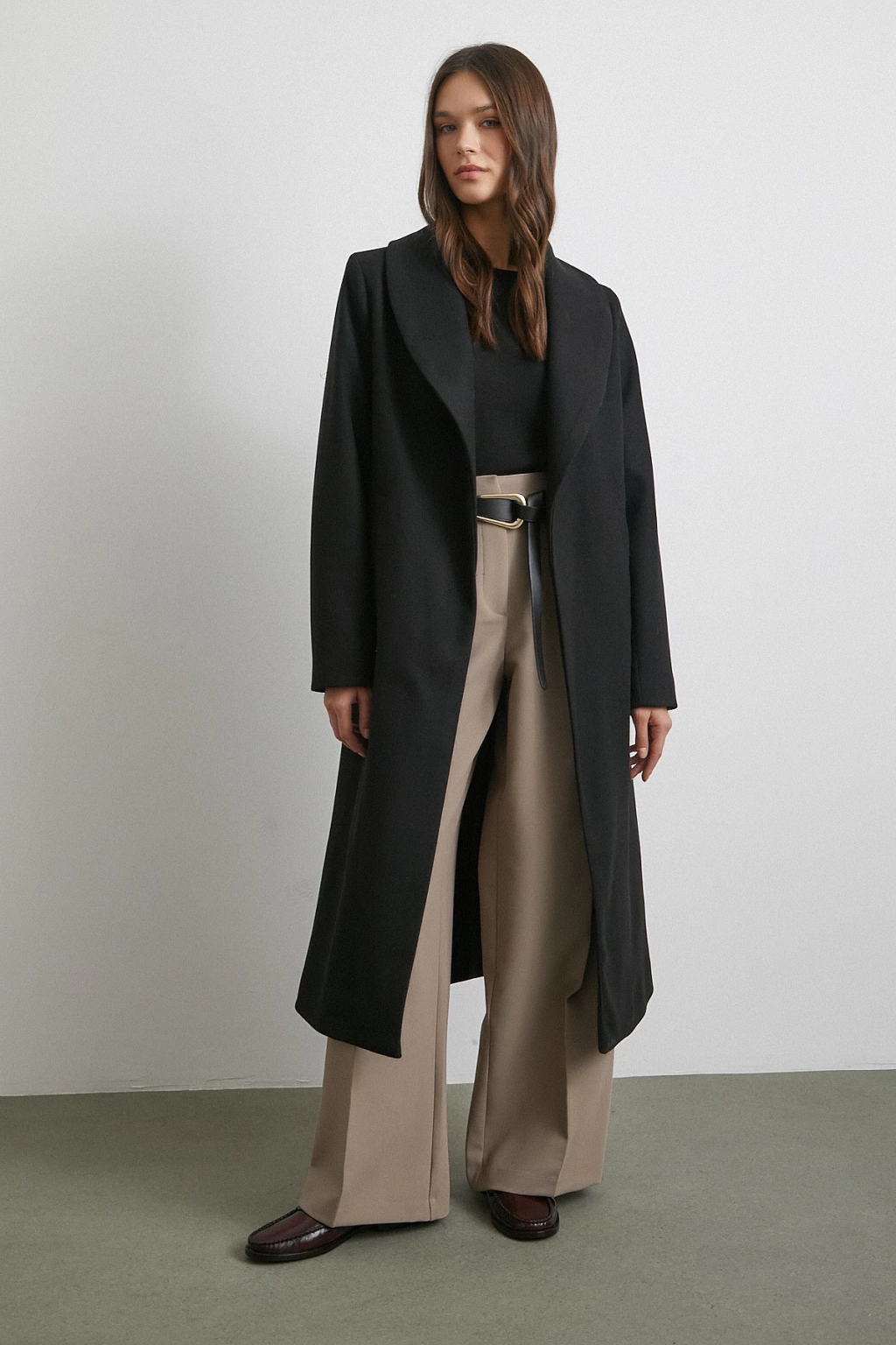 Kürk Yaka Kuşaklı Kaşe Kaban Bej