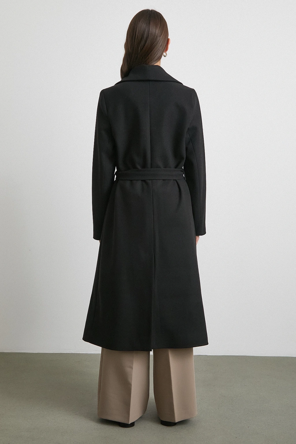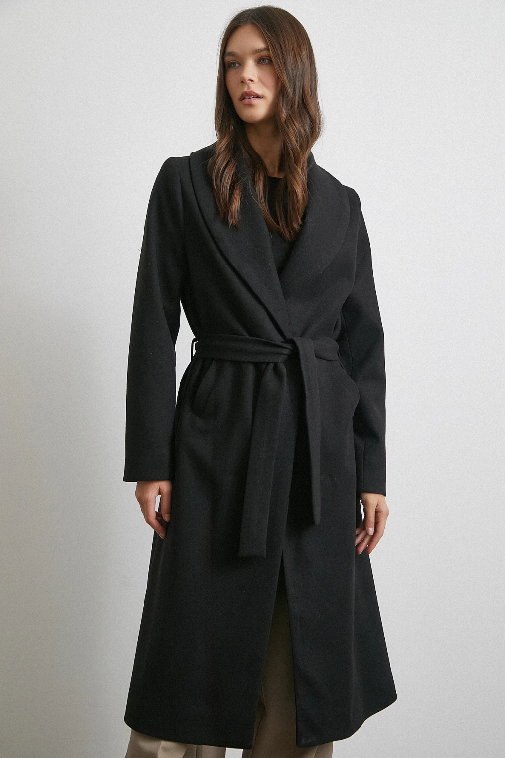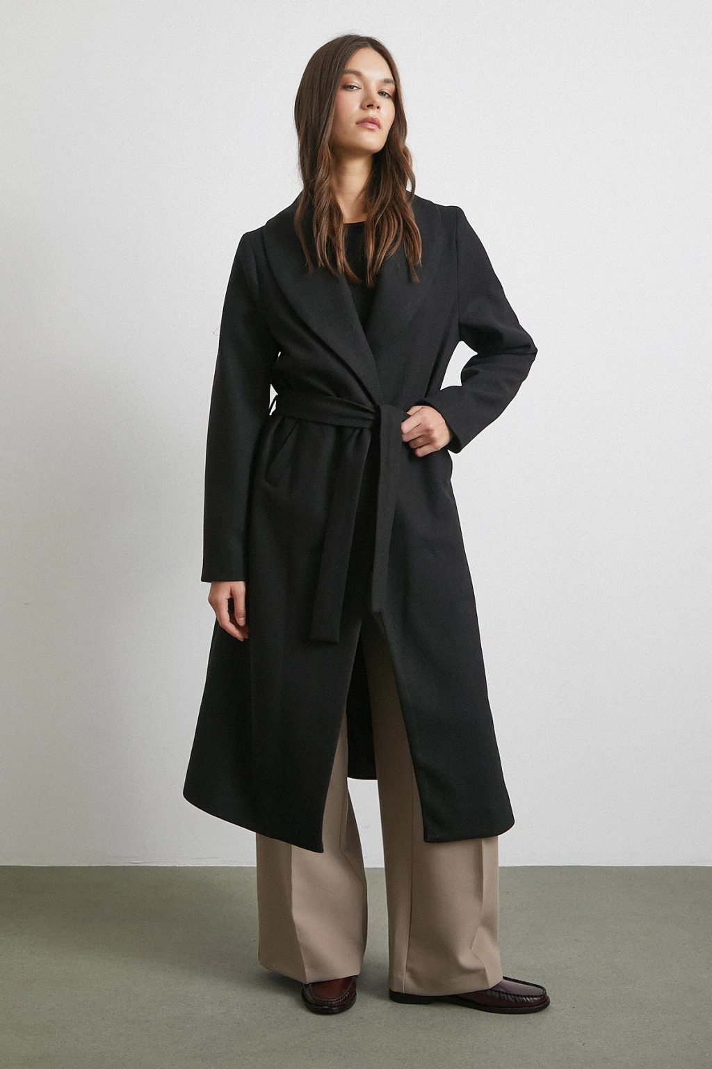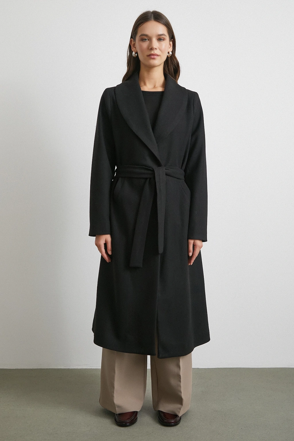 Kürklü Kuşaklı Deri Pardesü Siyah