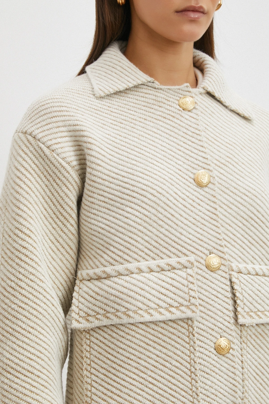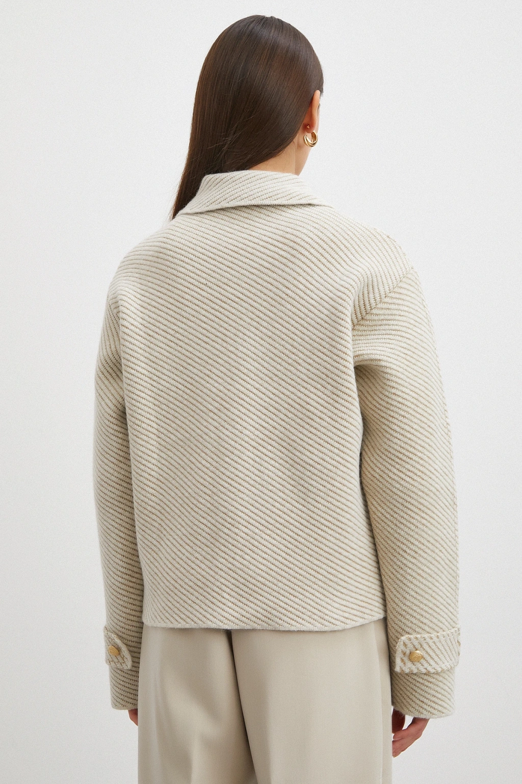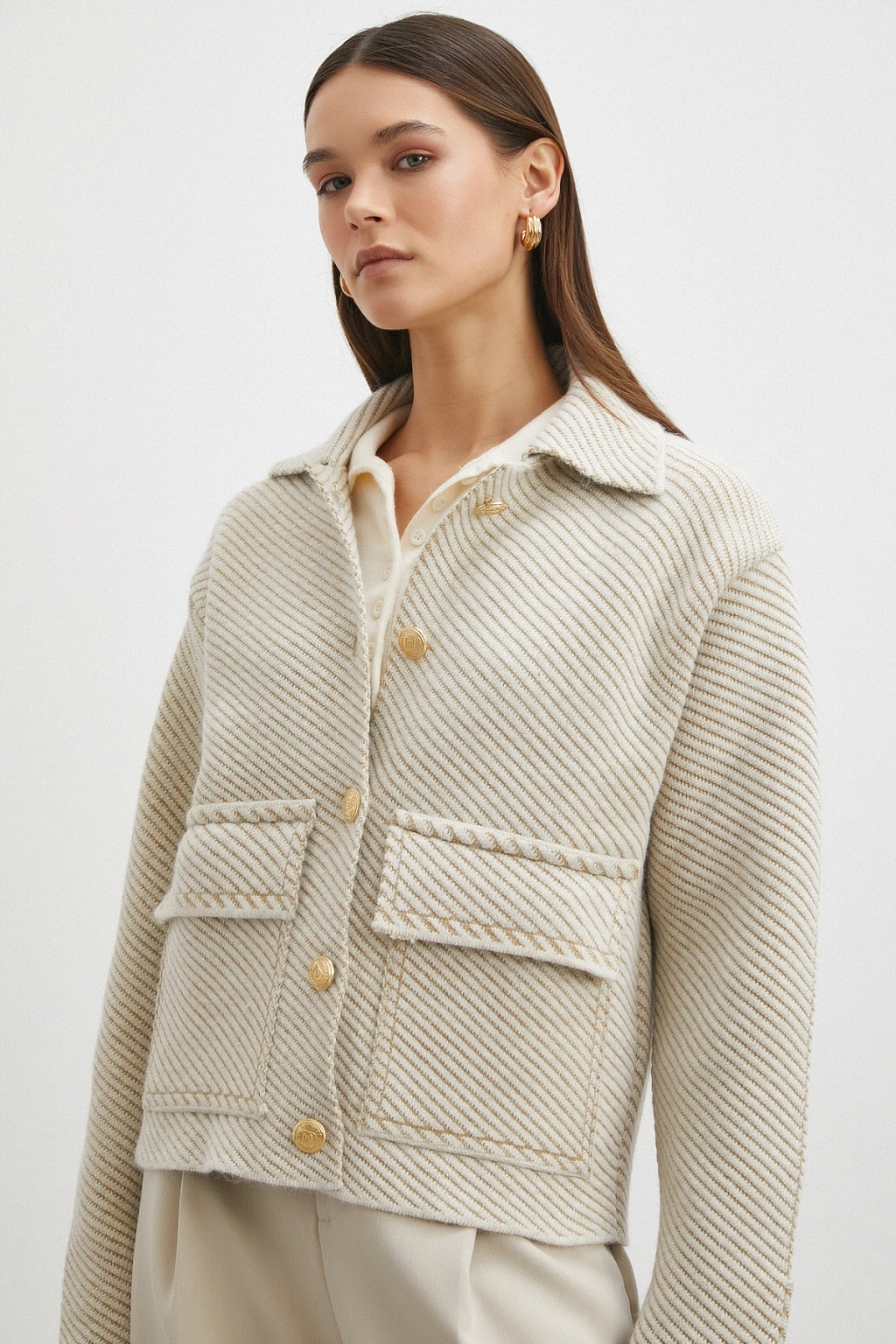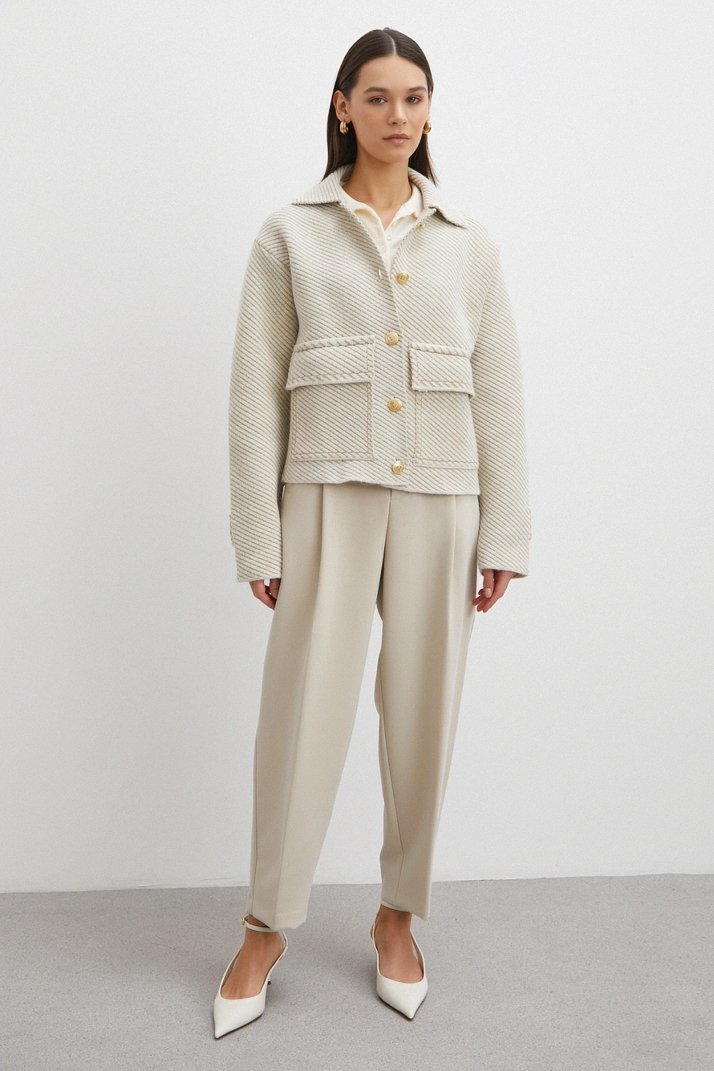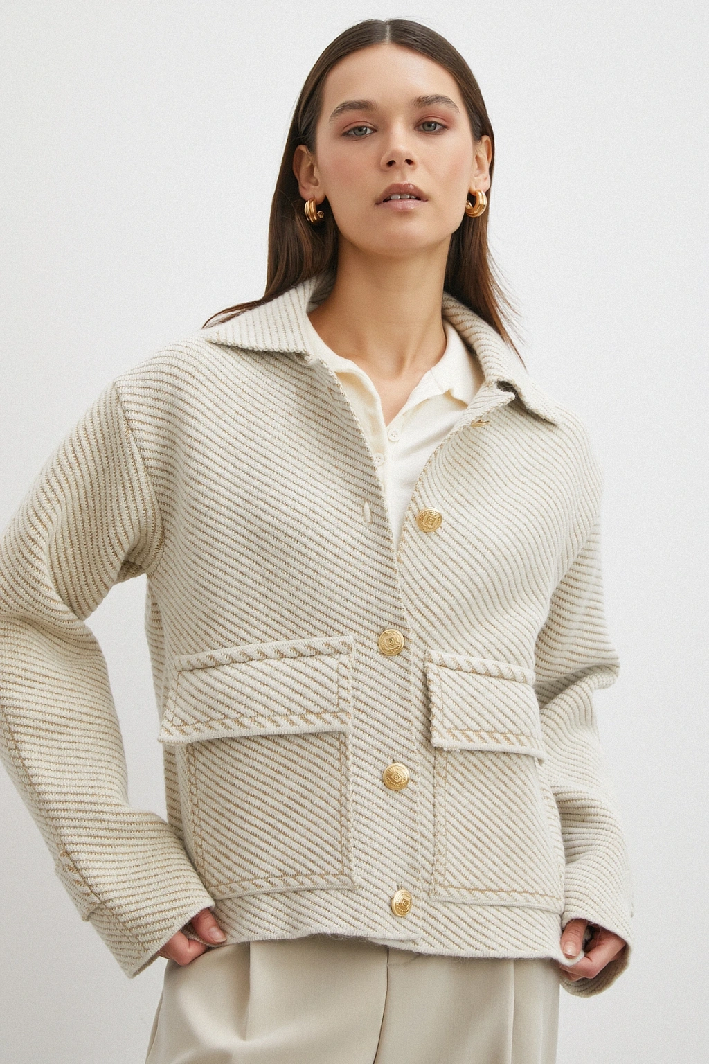 Polo Yaka Cepli Gold Düğmeli Ceket Krem