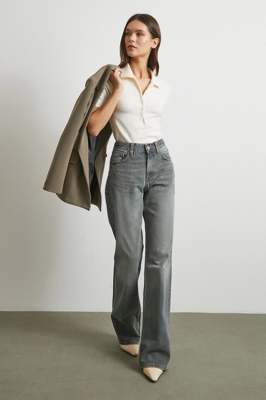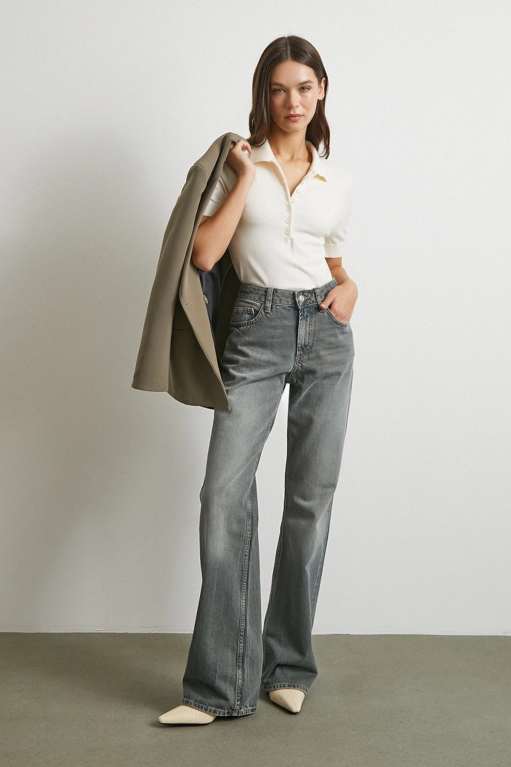Fularlı Polo Yaka Kazak Ekru