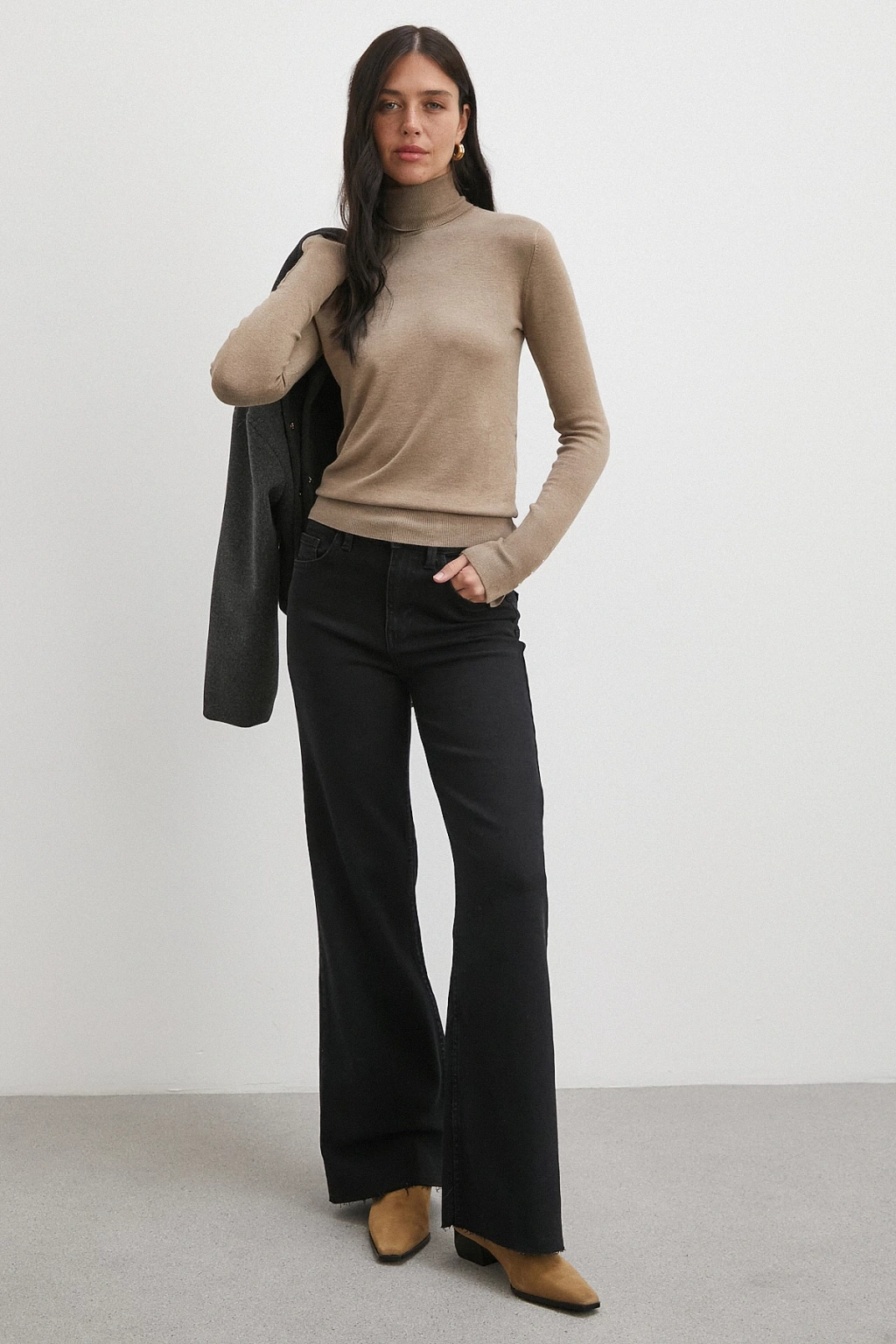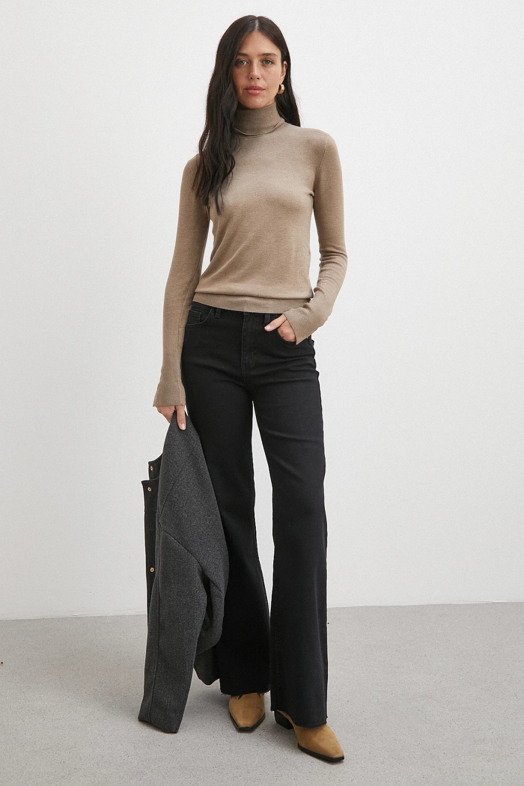 Yüksek Bel Beş Cepli Kesik Paça Jean Kahve