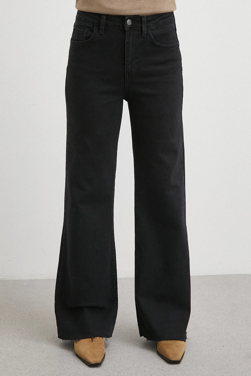 Taş İşlemeli Yüksek Bel Kesik Paça Jean Siyah