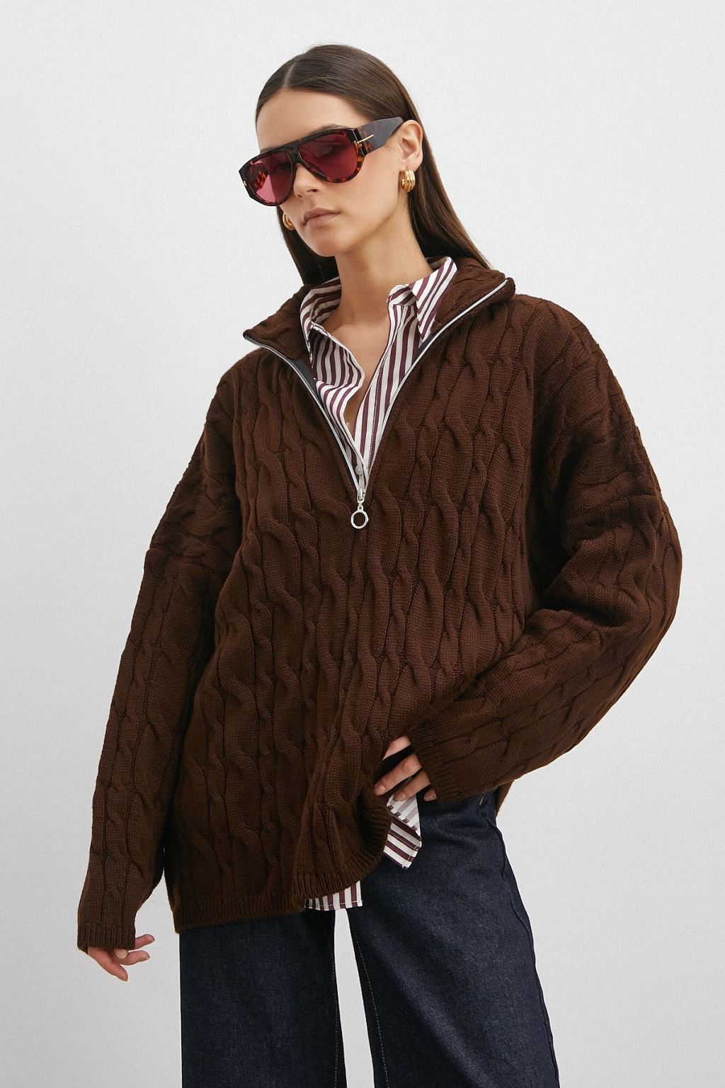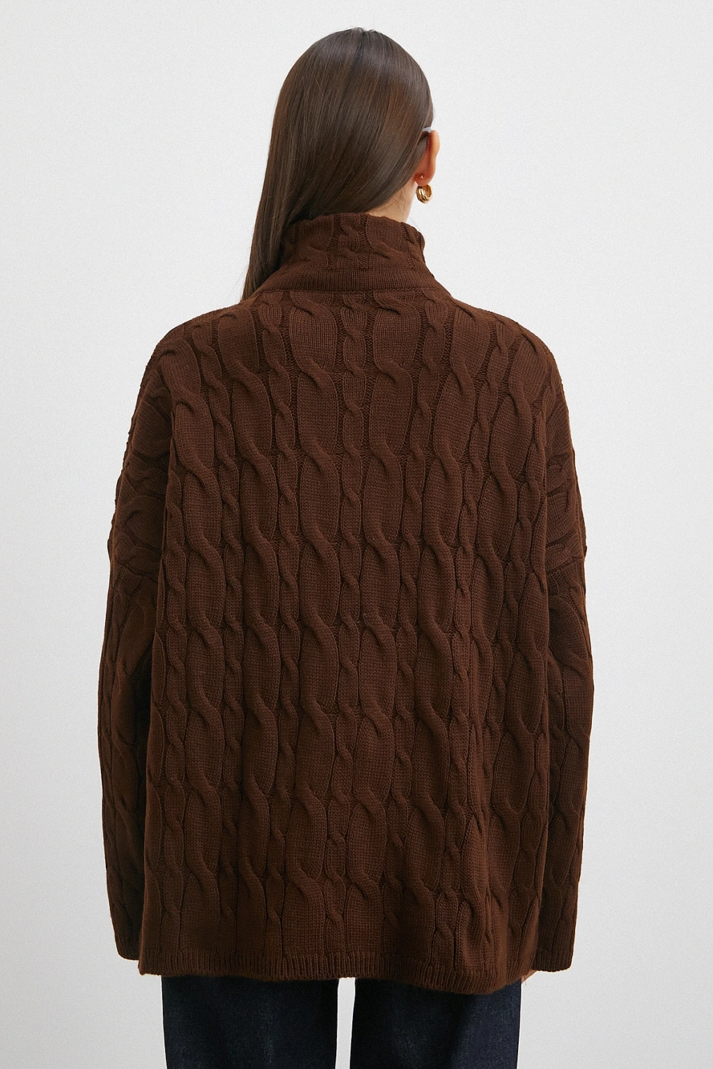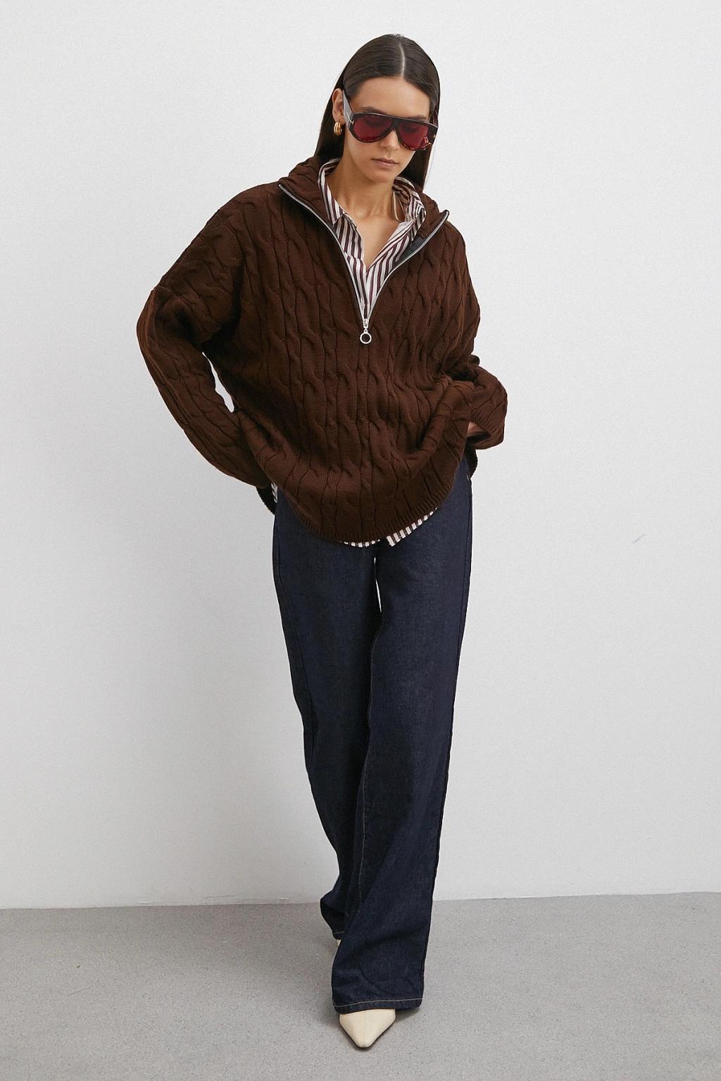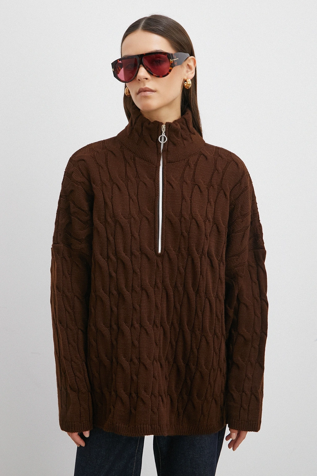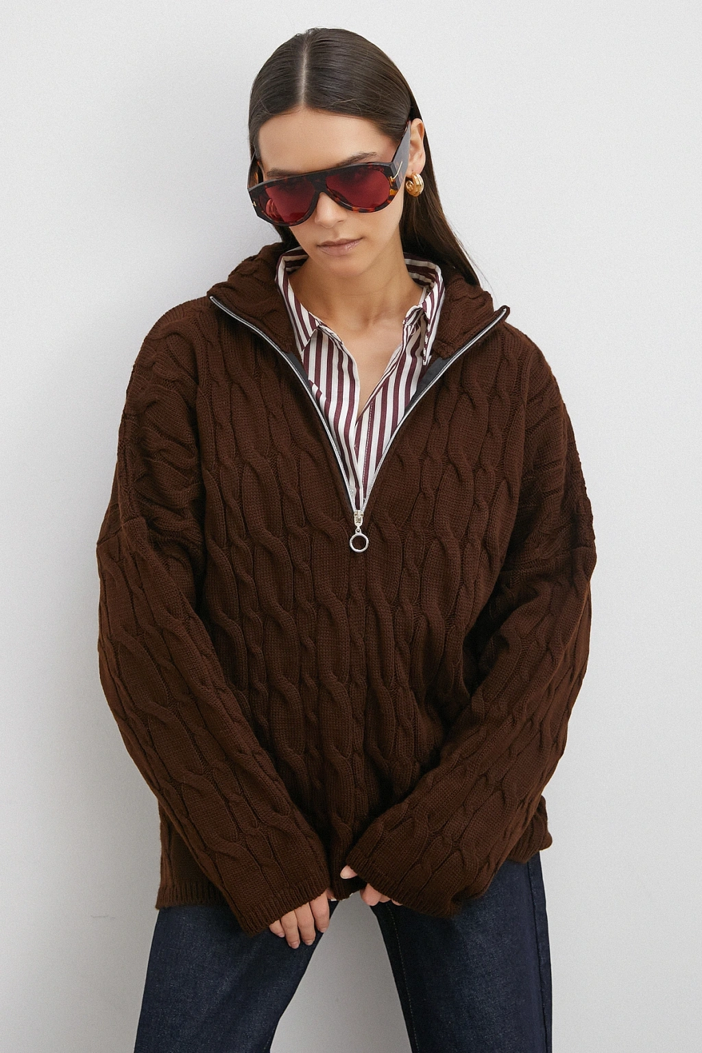 Saç Örgülü Yarım Fermuarlı Kazak Kahve
