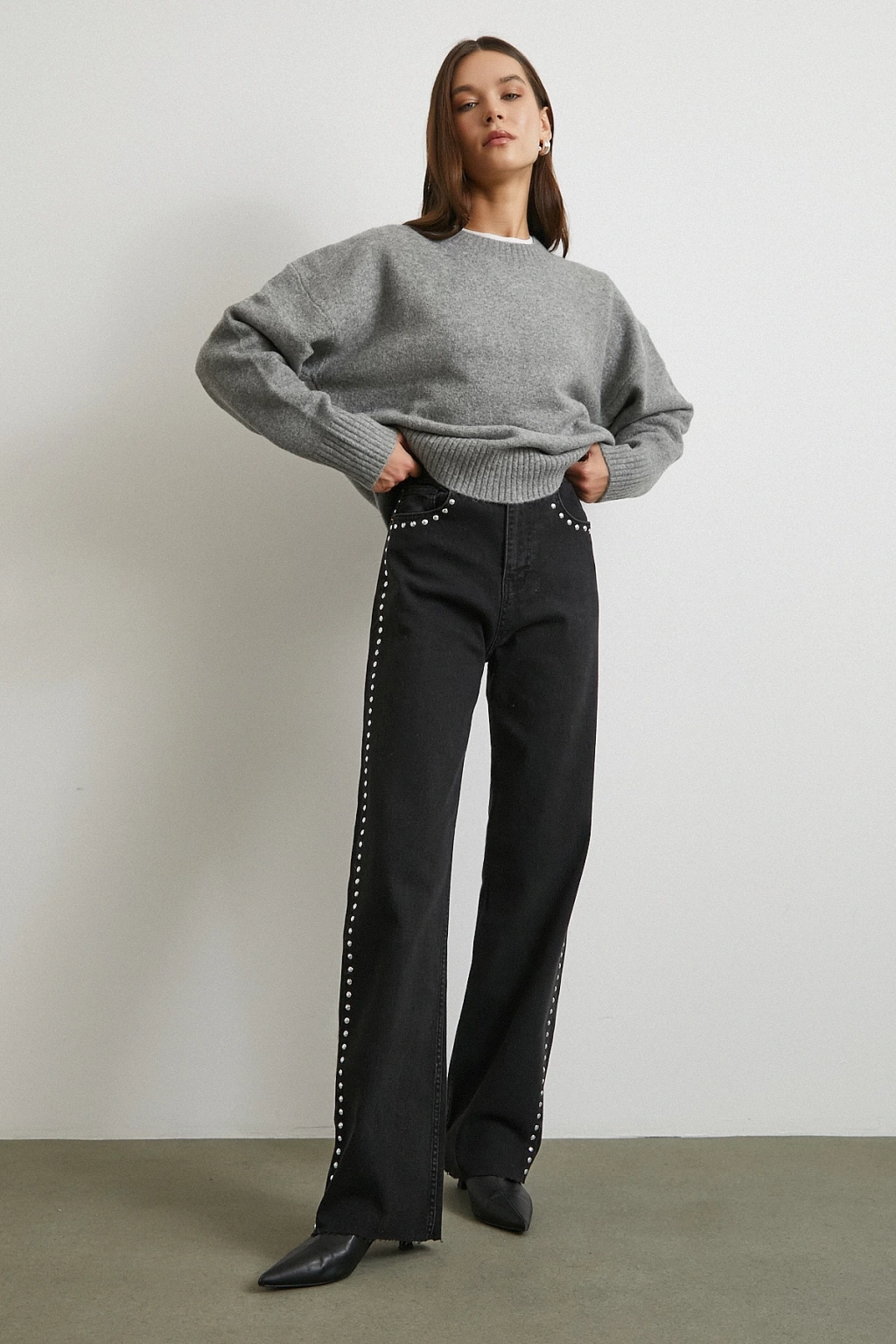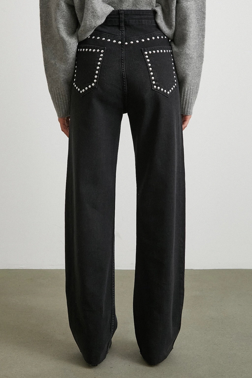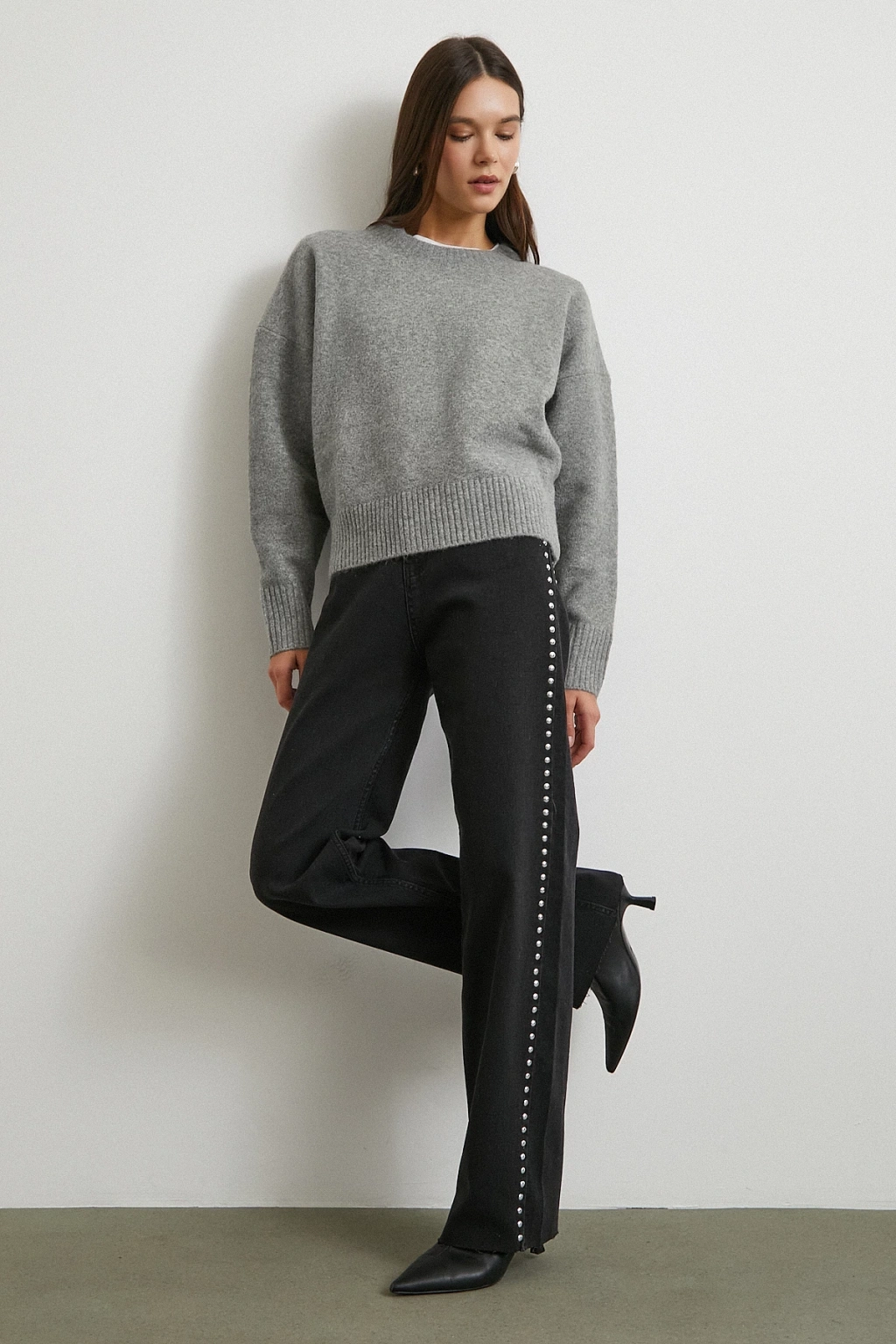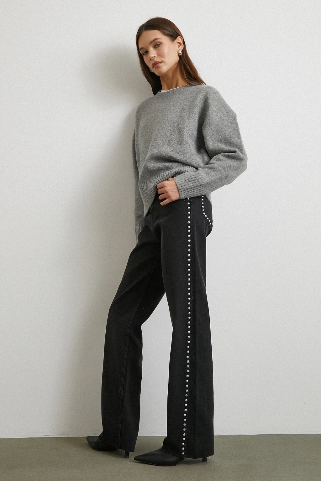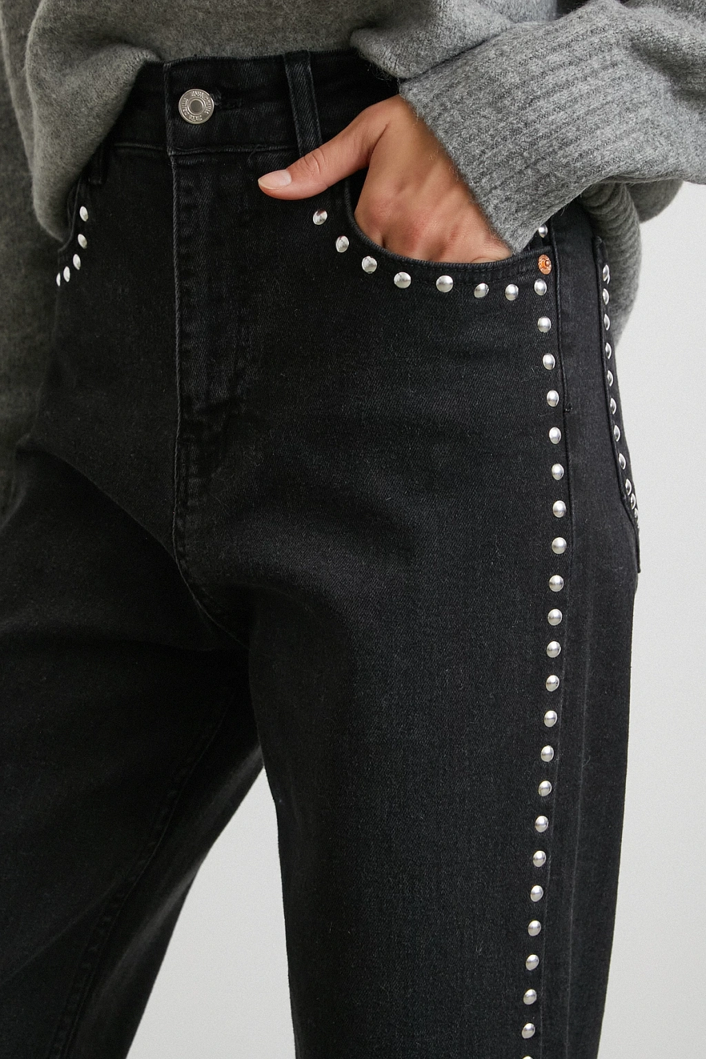 Taş İşlemeli Yüksek Bel Kesik Paça Jean Siyah