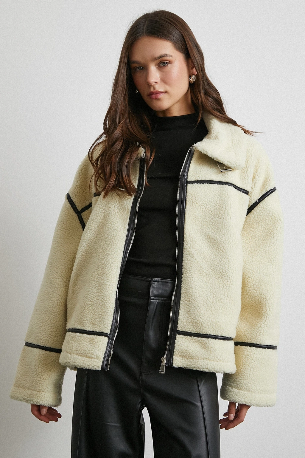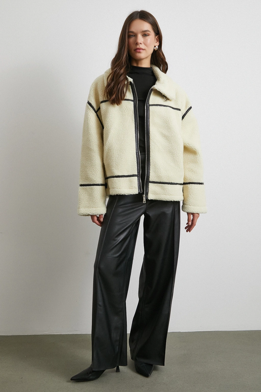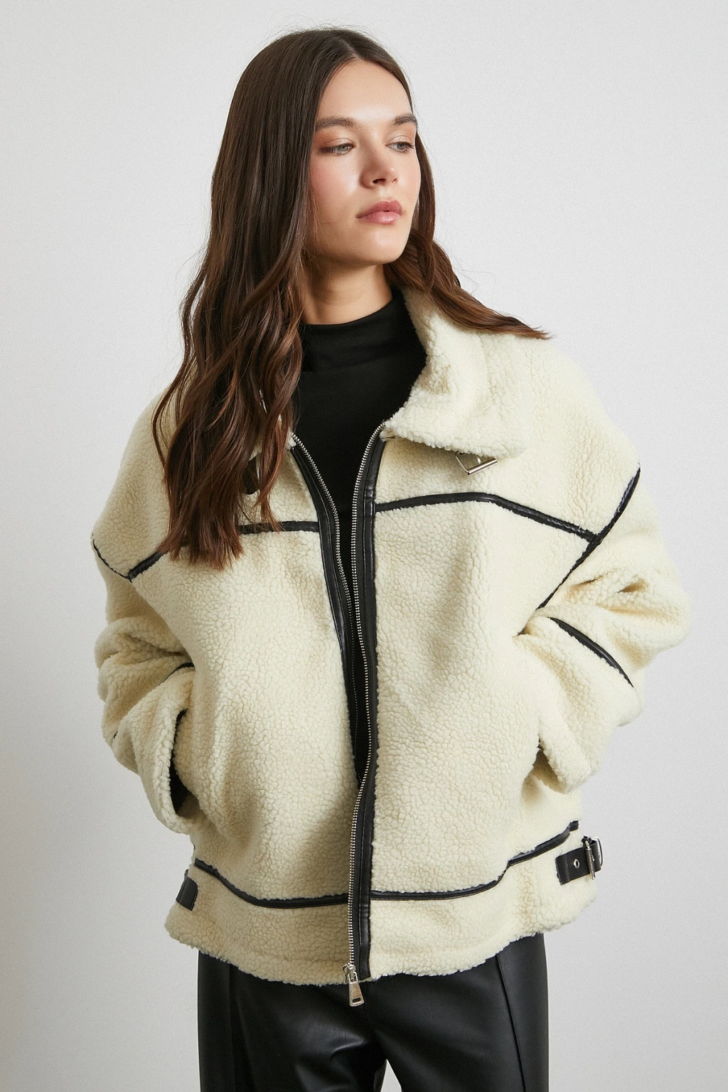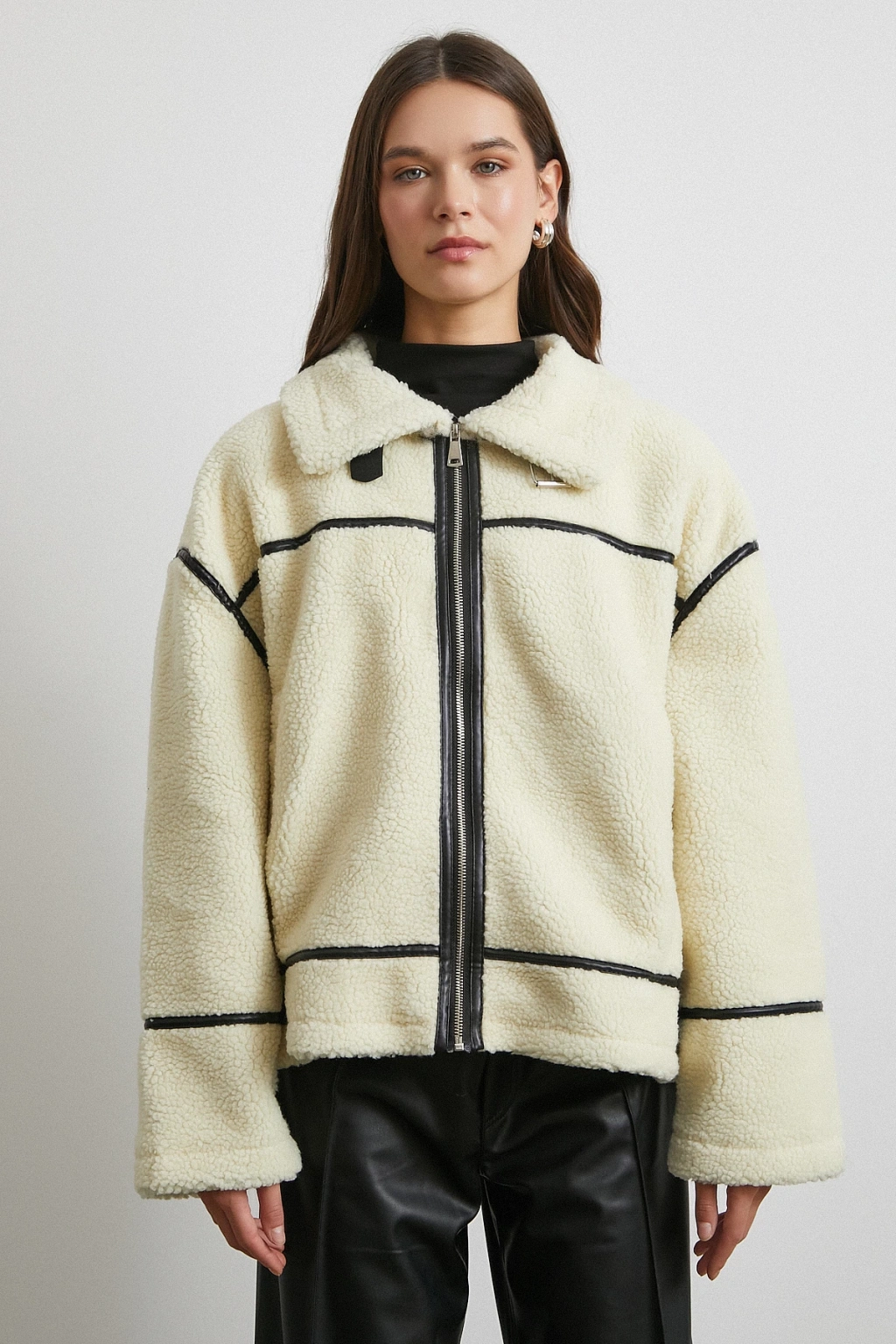 Kürklü Yaka Detaylı Deri Ceket Siyah