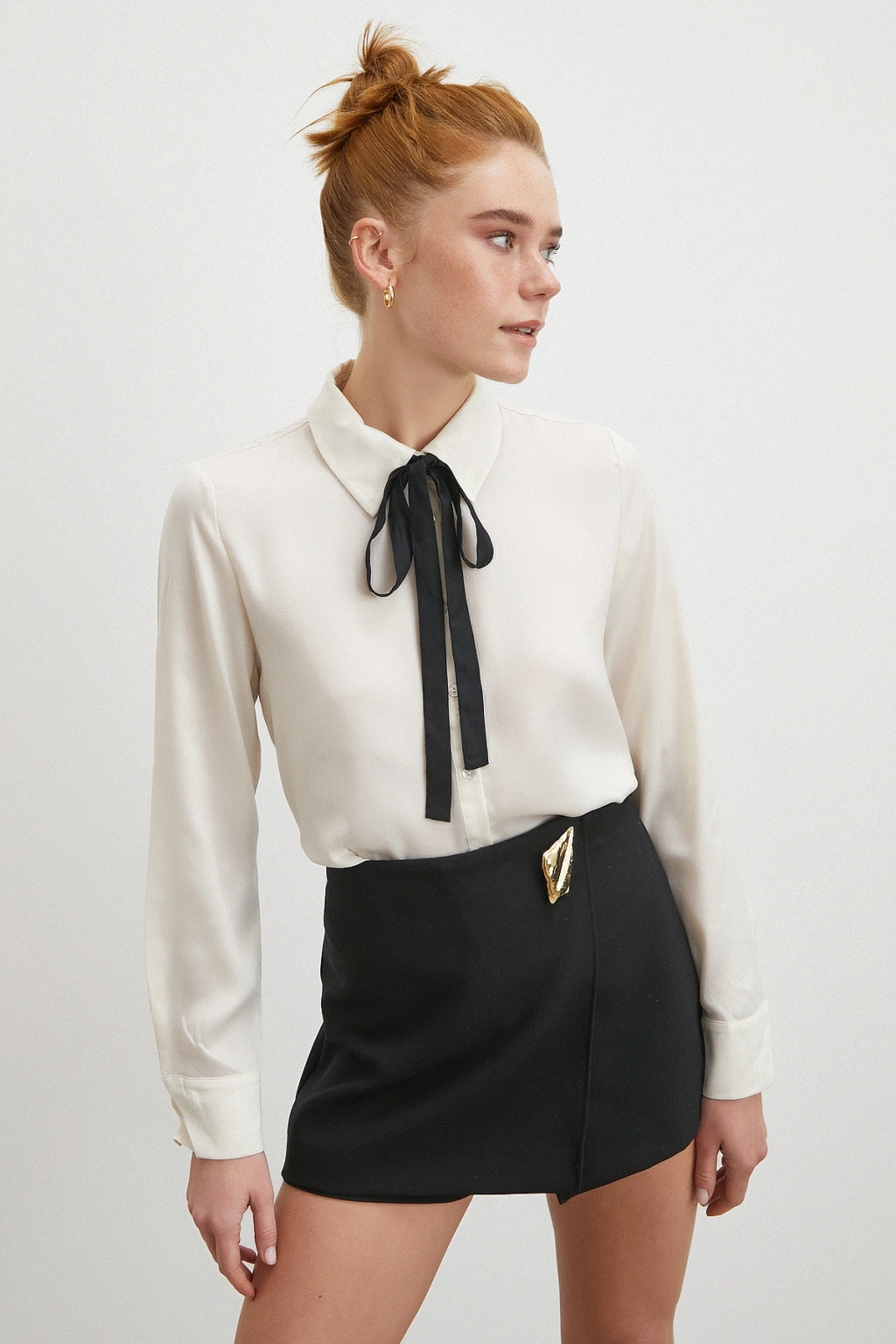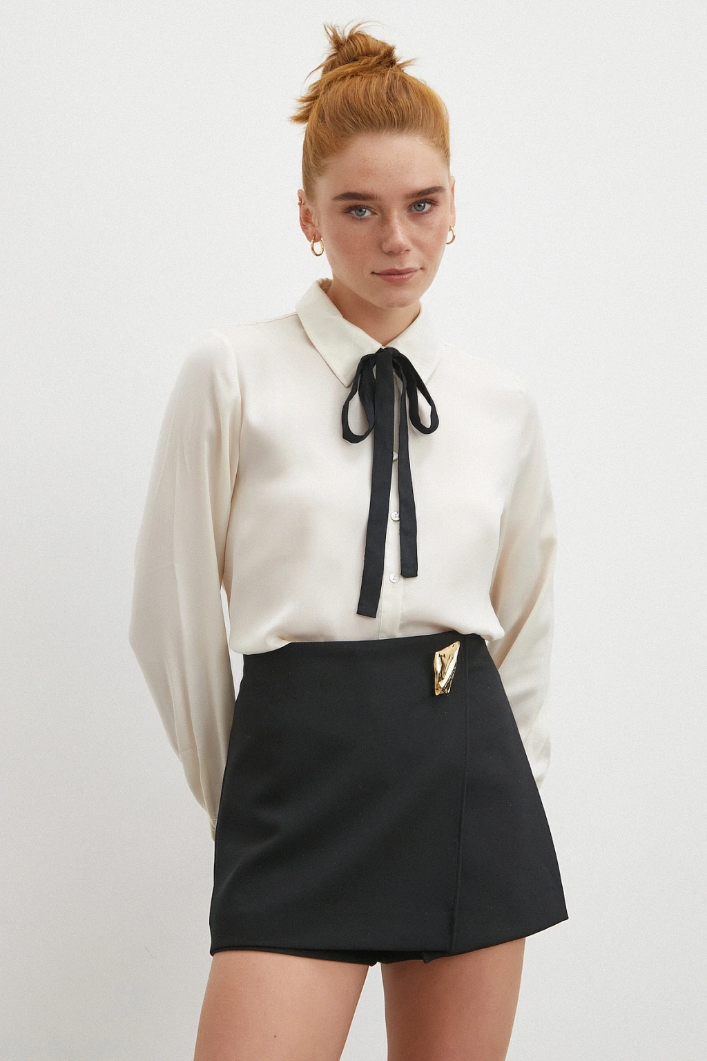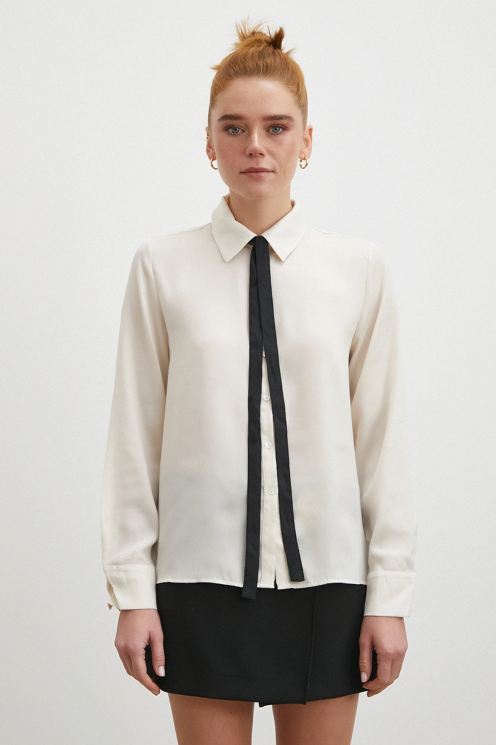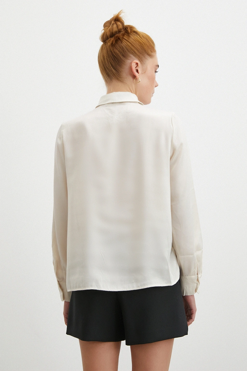 Yaka Bağlamalı Saten Gömlek Ekru