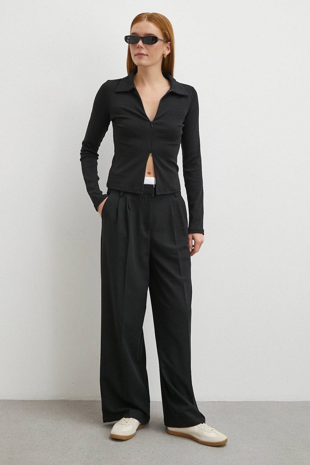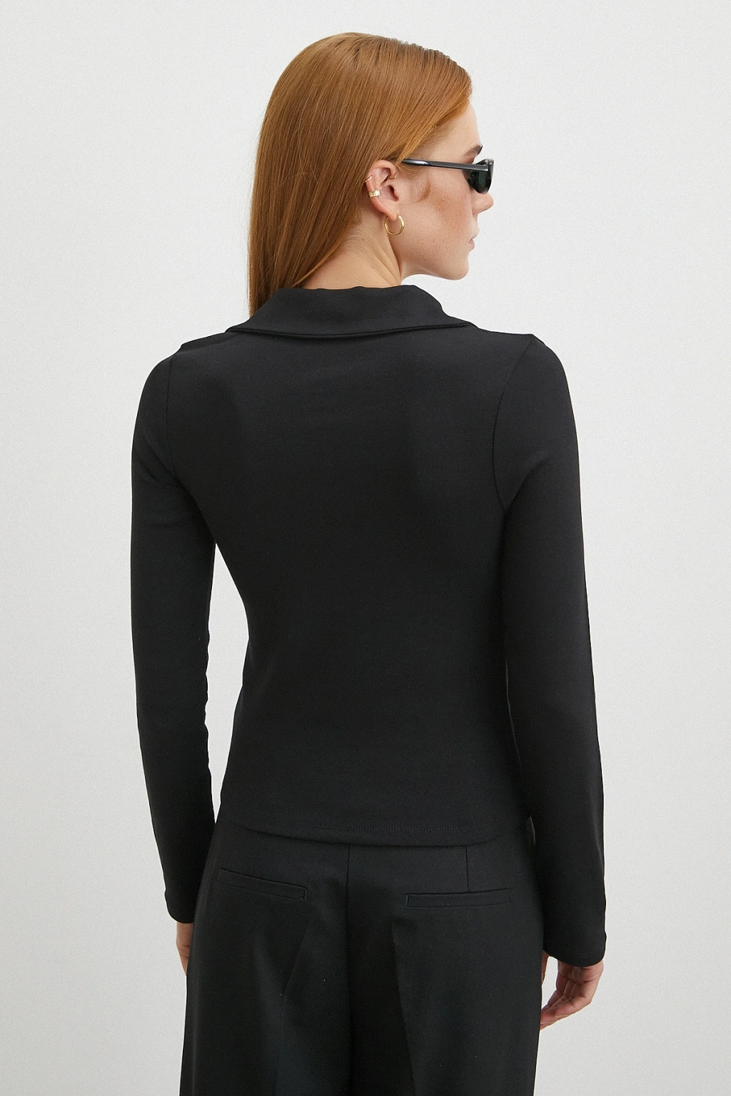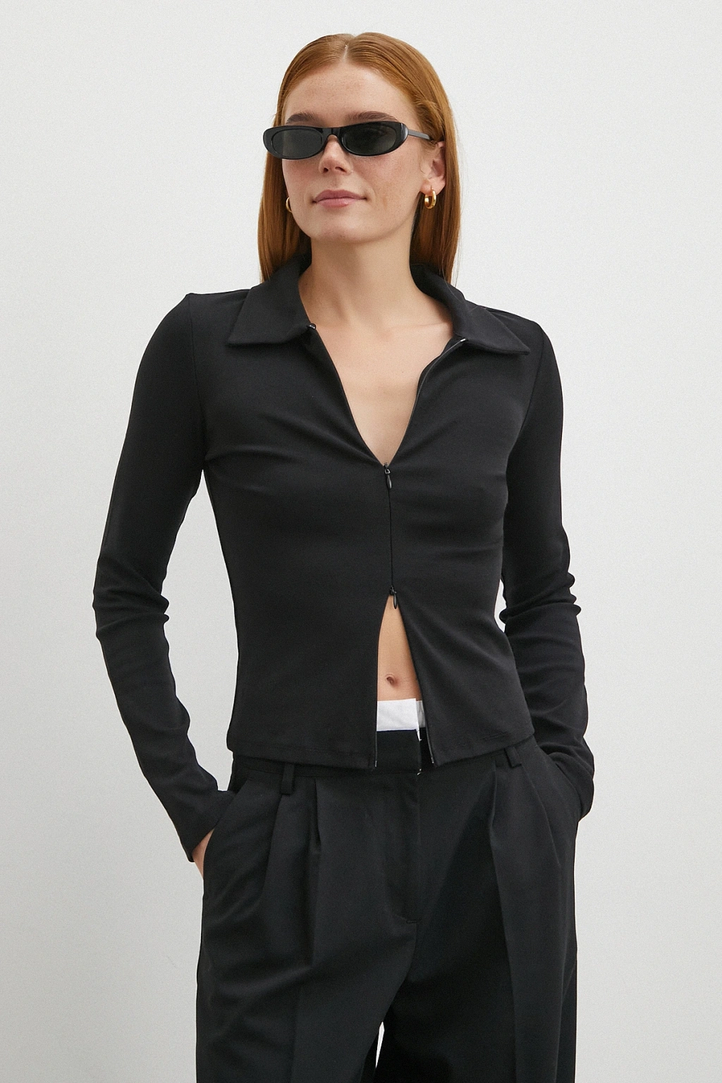 Yakalı Çift Fermuarlı Bluz Siyah