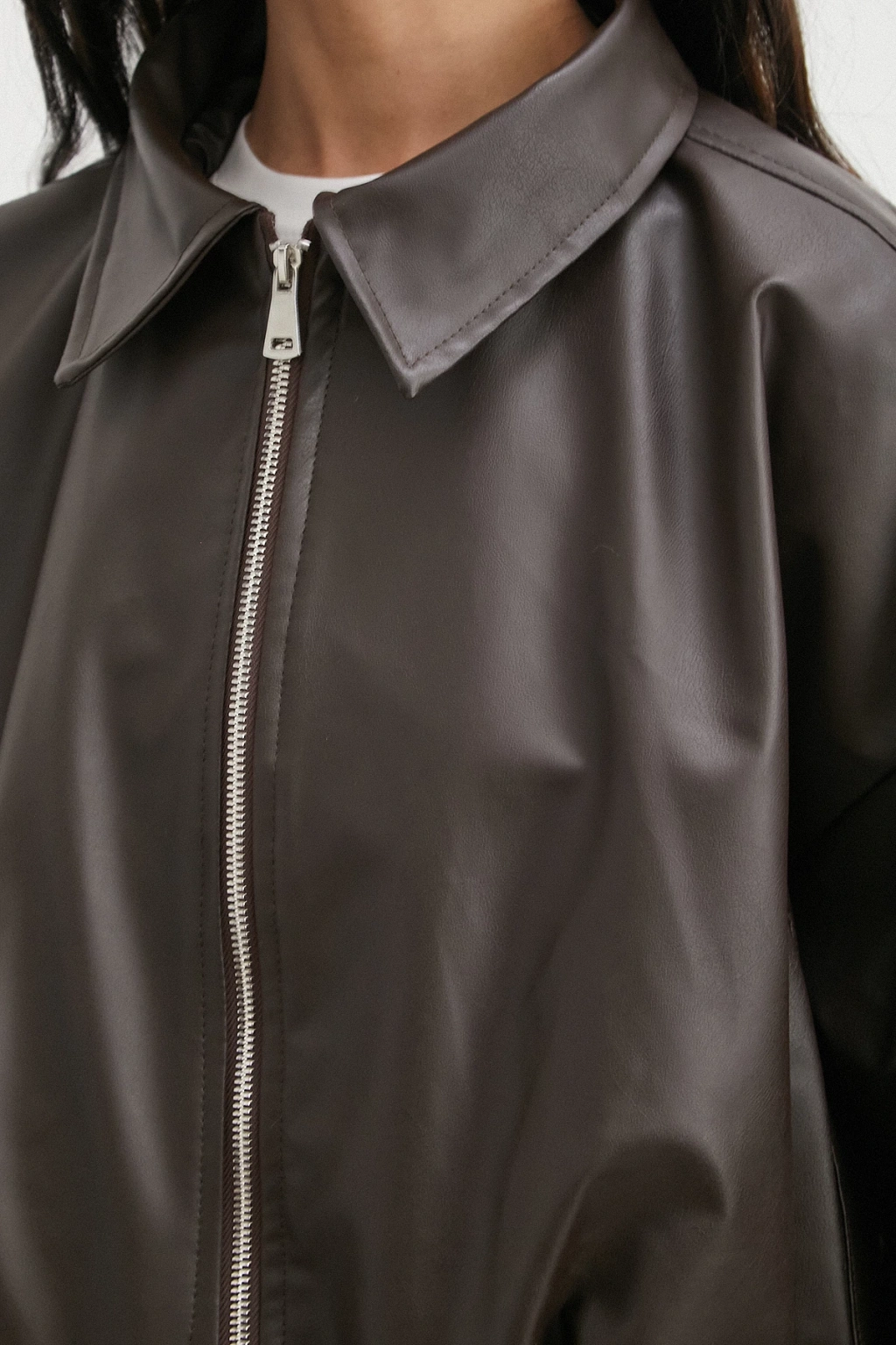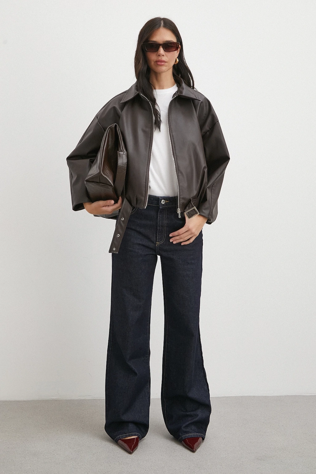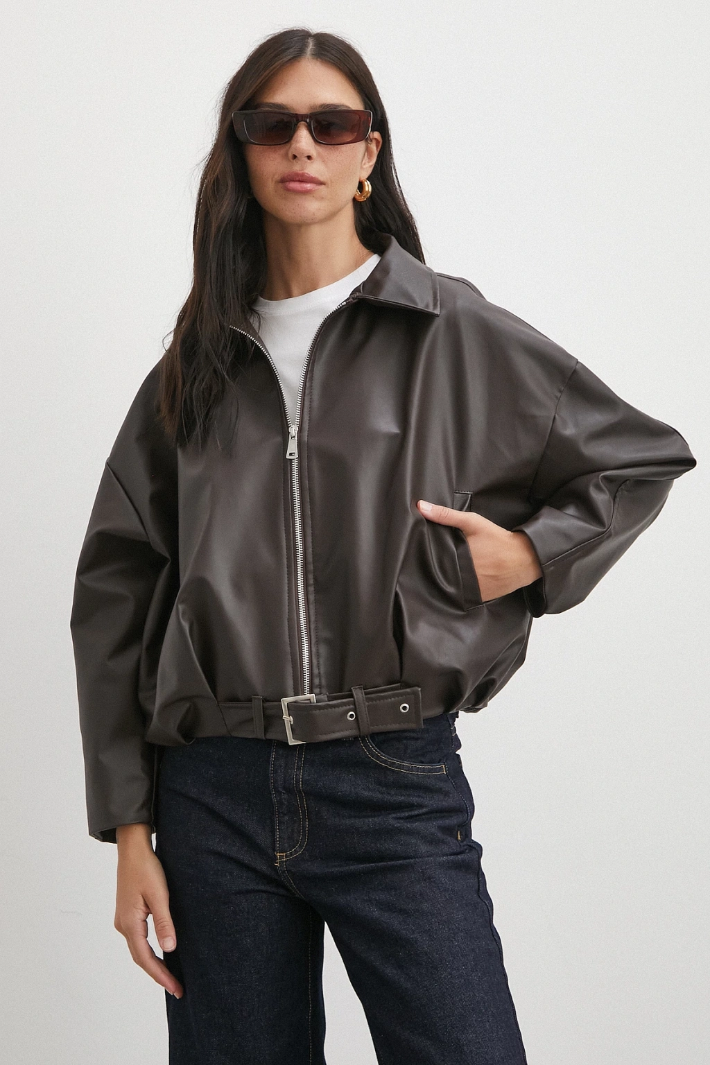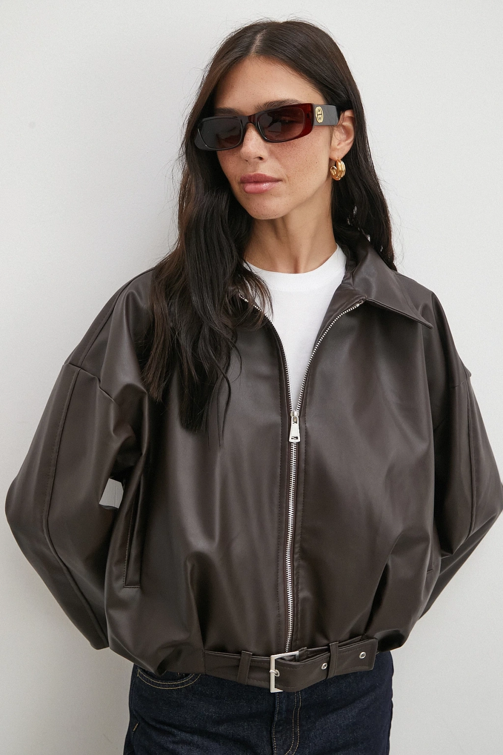 Beli Kemerli Fermuarlı Deri Ceket Kahve
