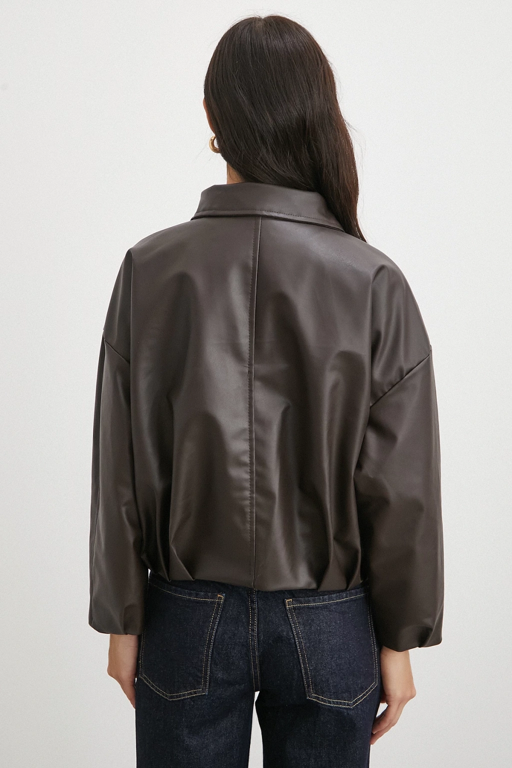 Kürklü Yaka Detaylı Deri Ceket Kahve