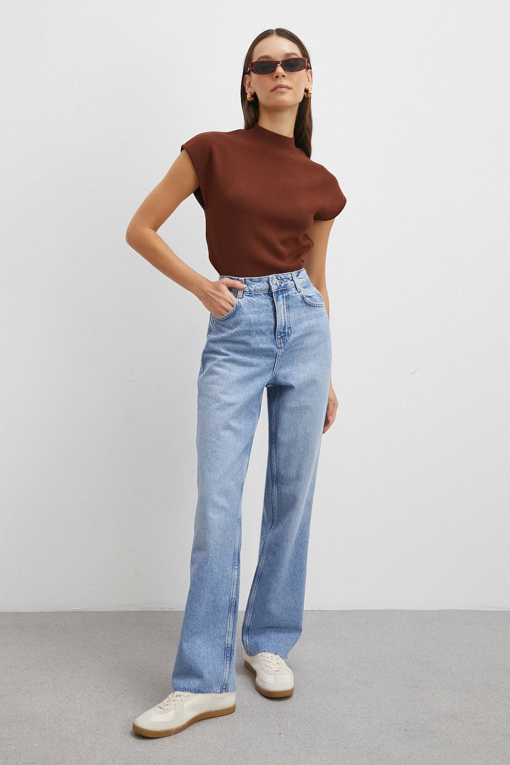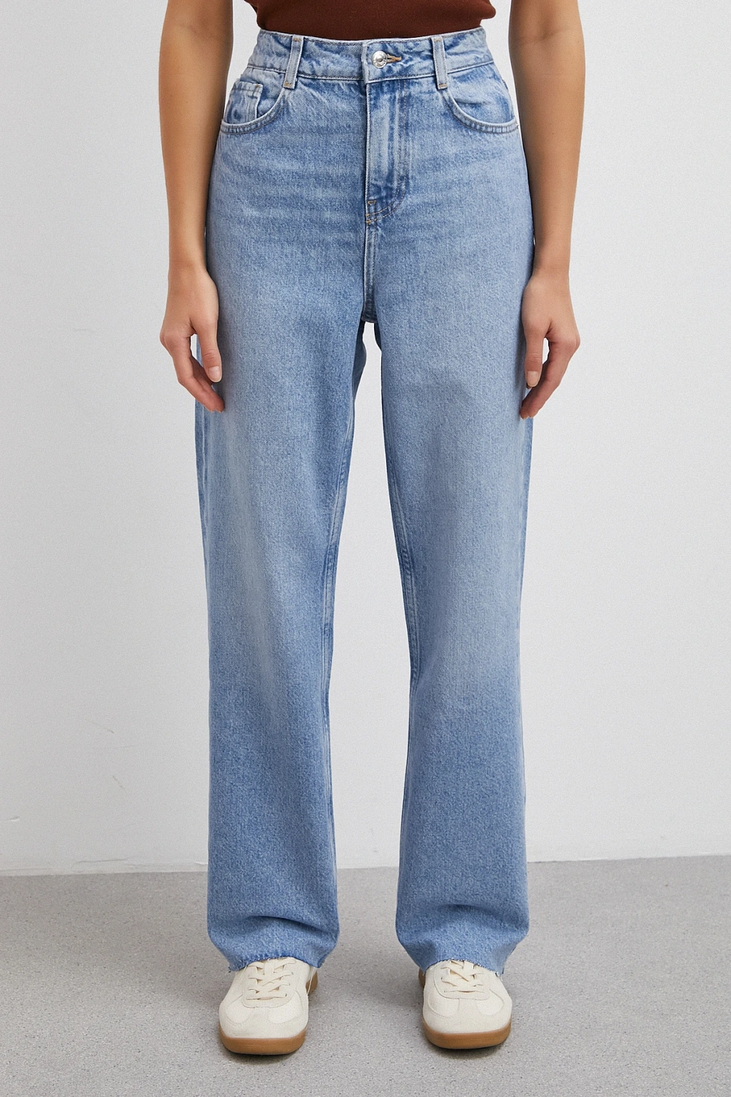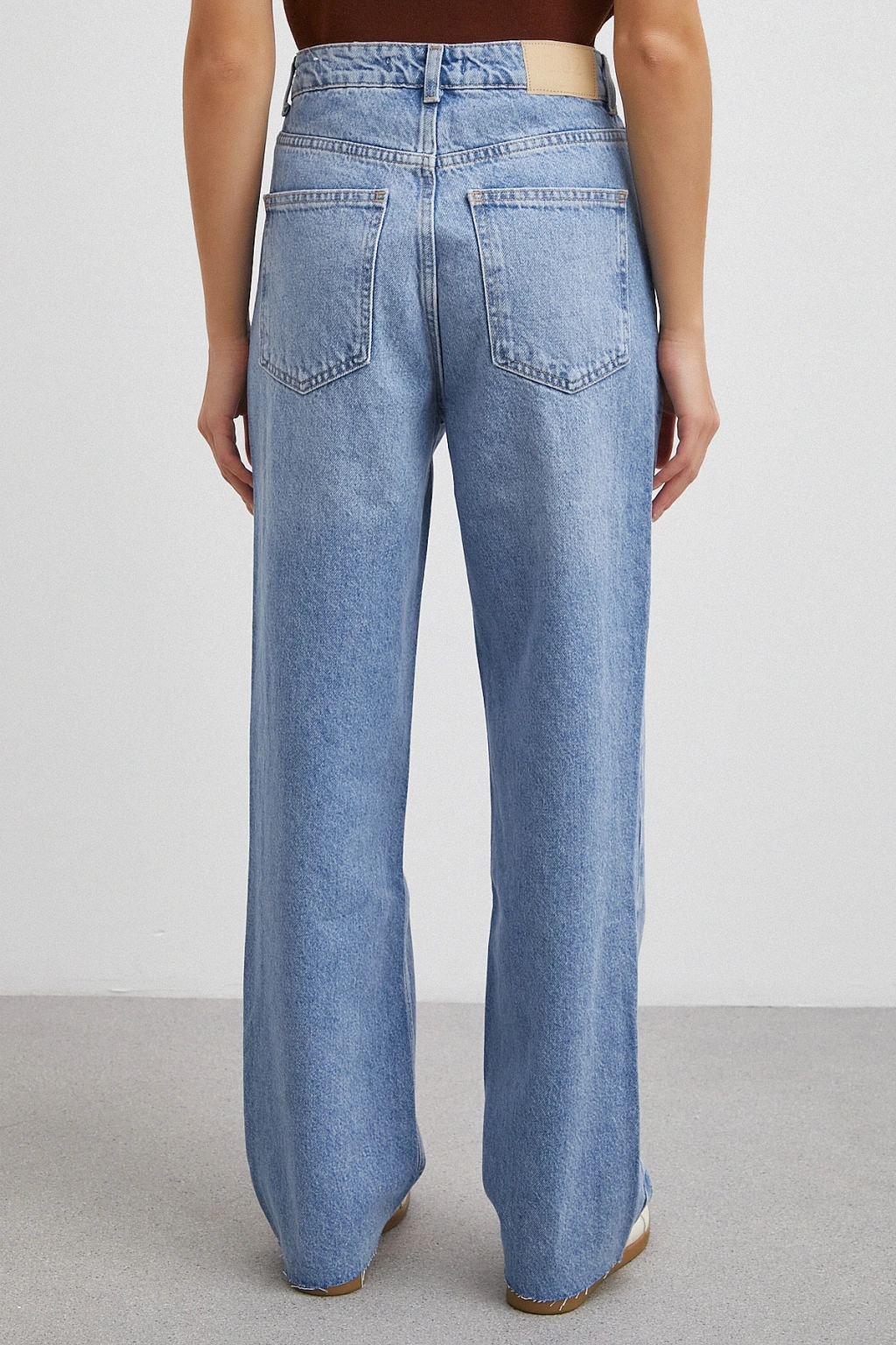 Yüksek Bel Geniş Paça Beş Cepli Jean Mavi