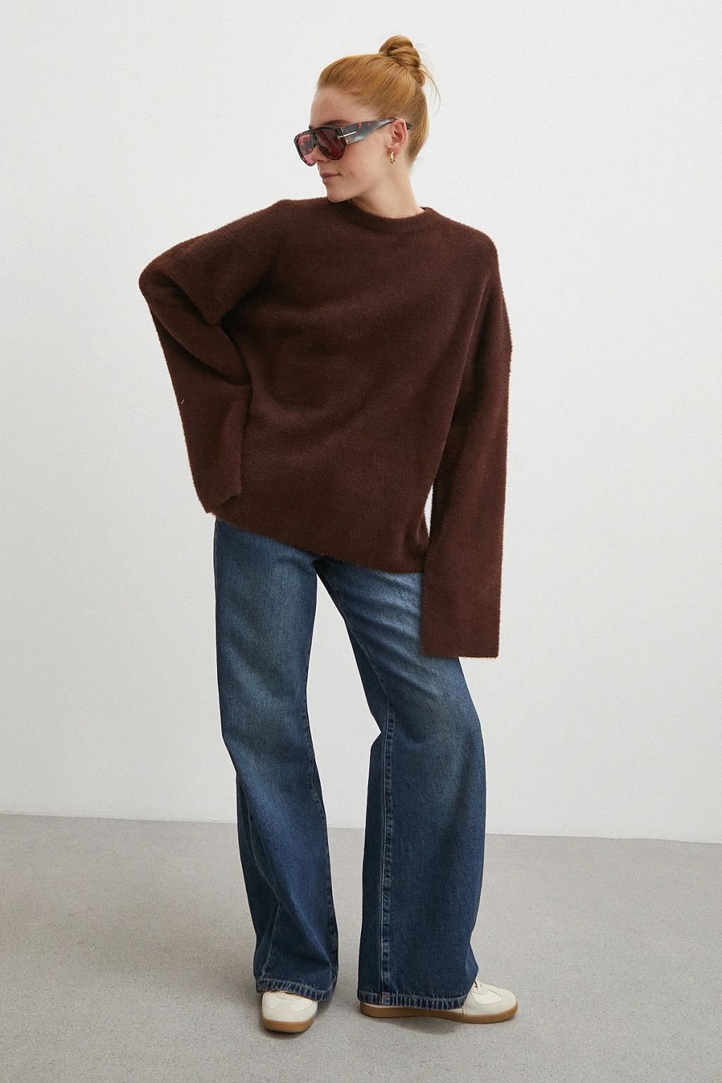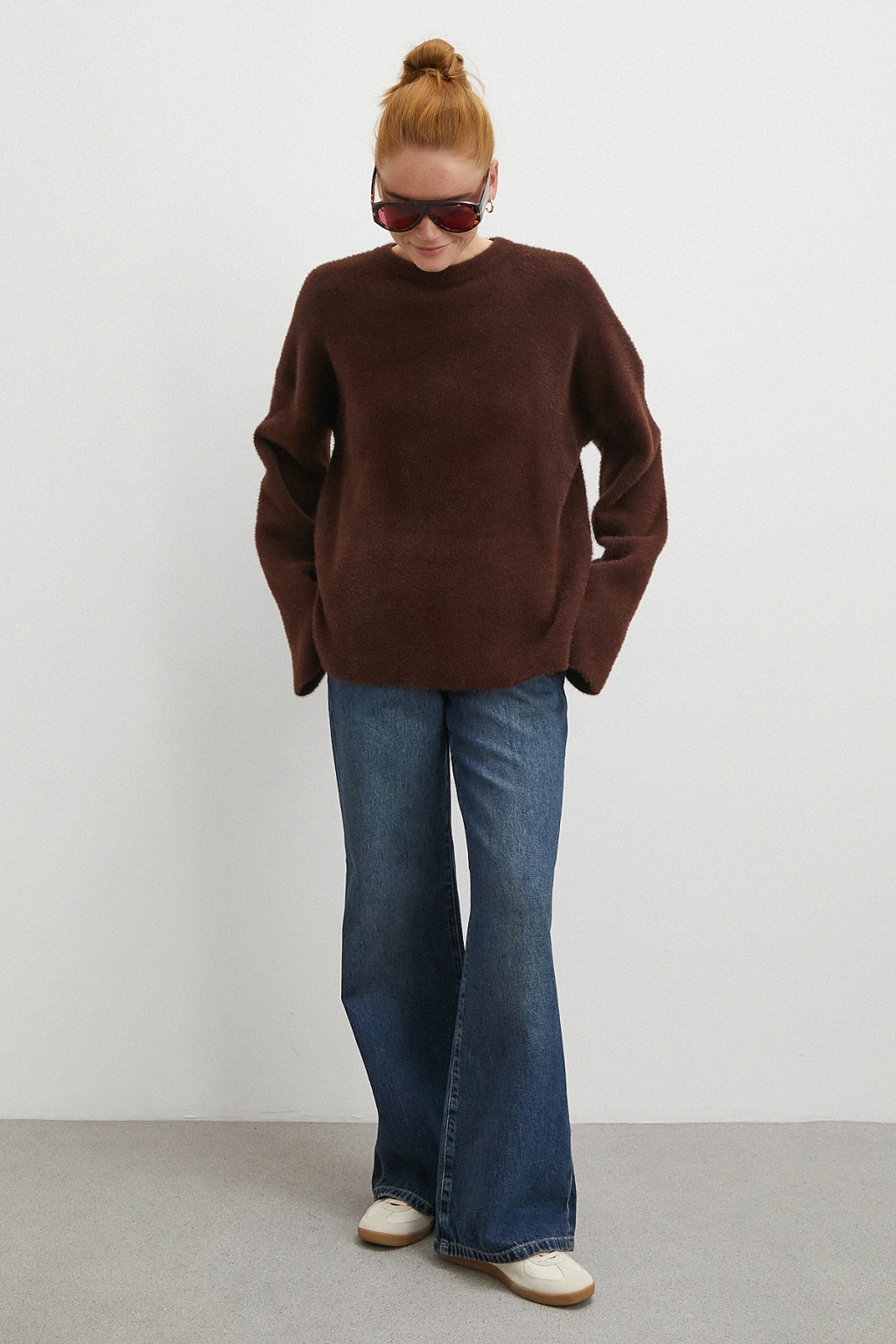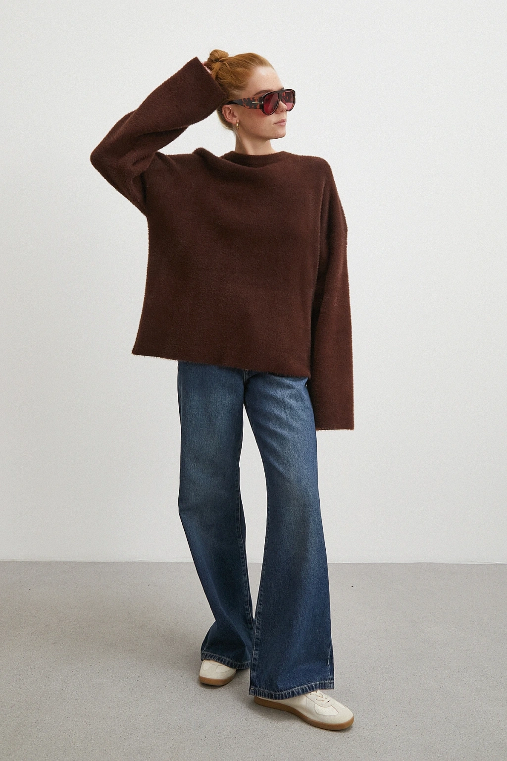 Yüksek Bel Kesik Boru Paça Jean Kahve